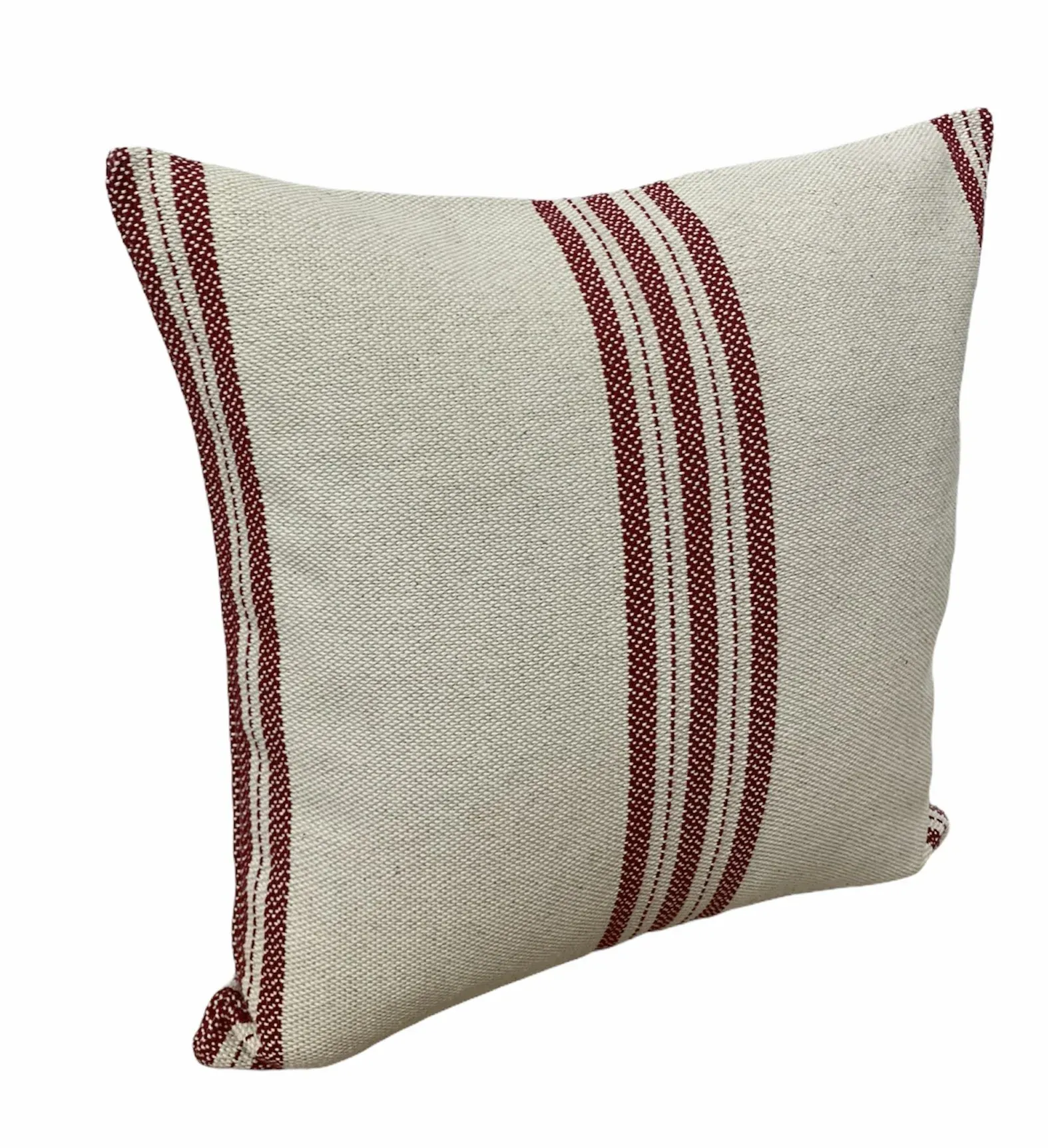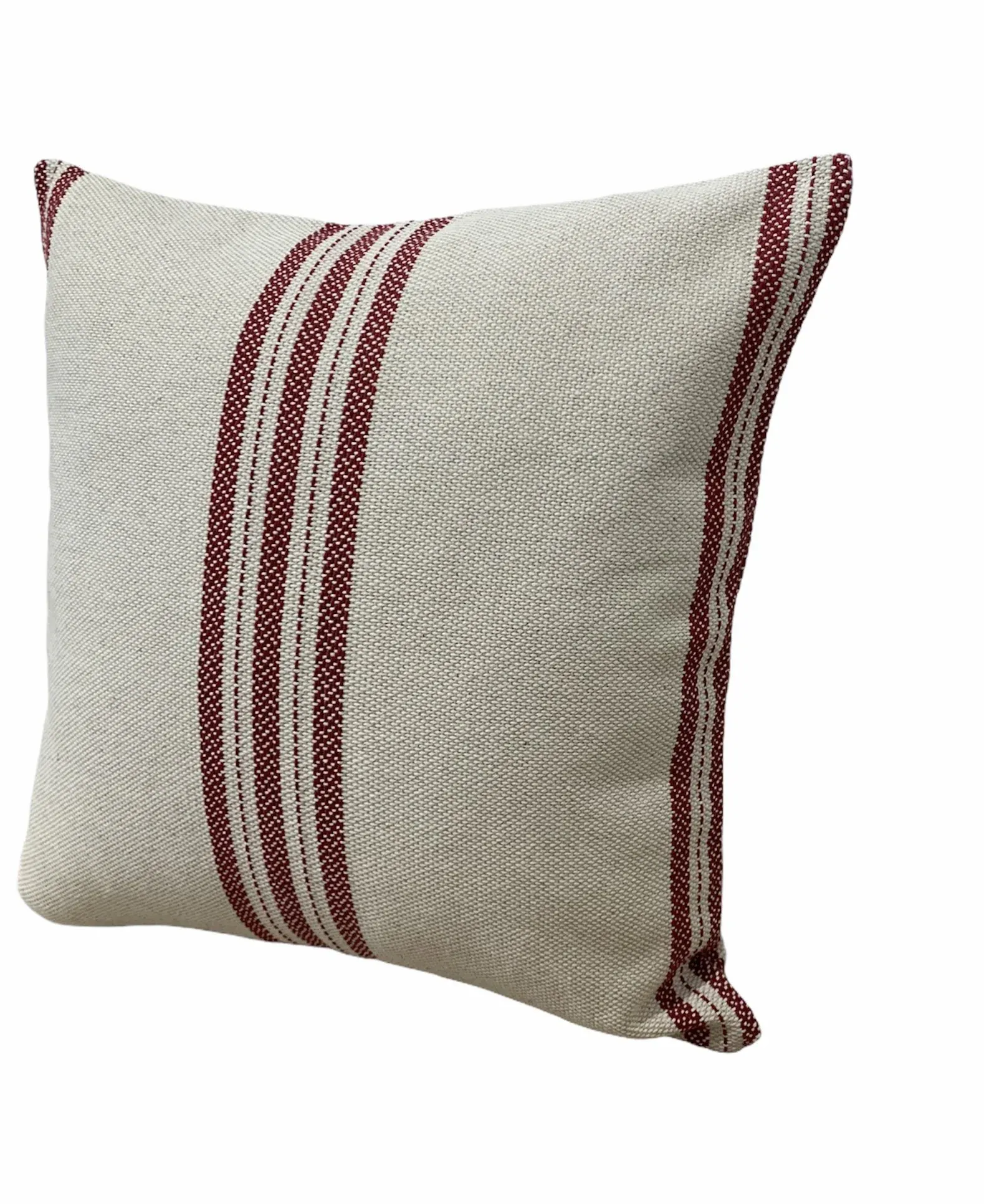 Cojín con lineas en color granate. Fabricado en algodón 91%, lino 7% y poliester 2% Cremallera como cierre. Relleno incluido.