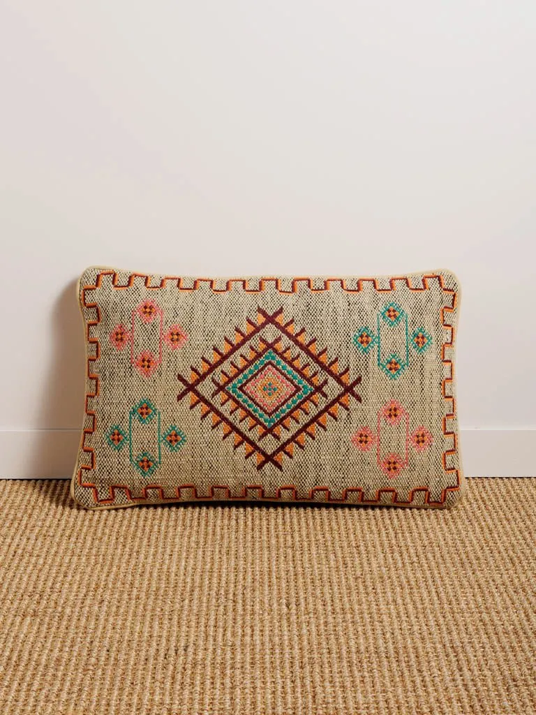 Precioso cojín kilim bordado en multicolor fabricado en poliéster y algodón.