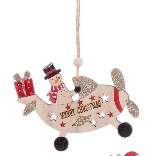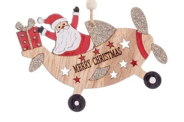 Colgante navideño con forma de avión fabricado en madera.