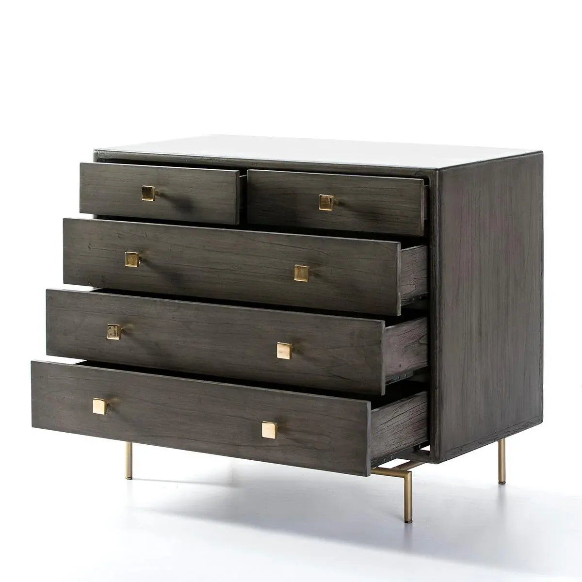 Cómoda de madera procedente de bosques sostenibles de color gris con patas metálicas y pequeños tiradores en color dorado.