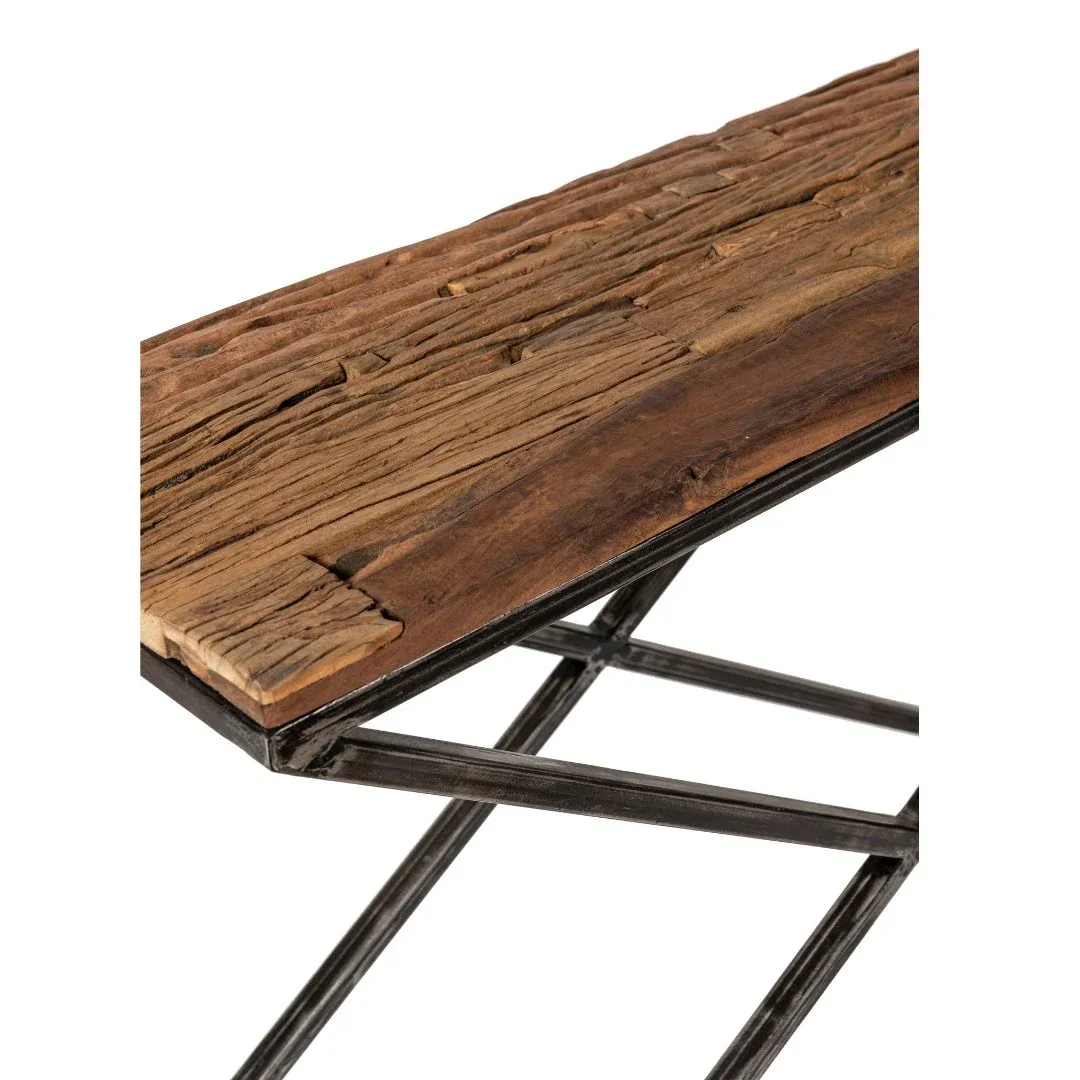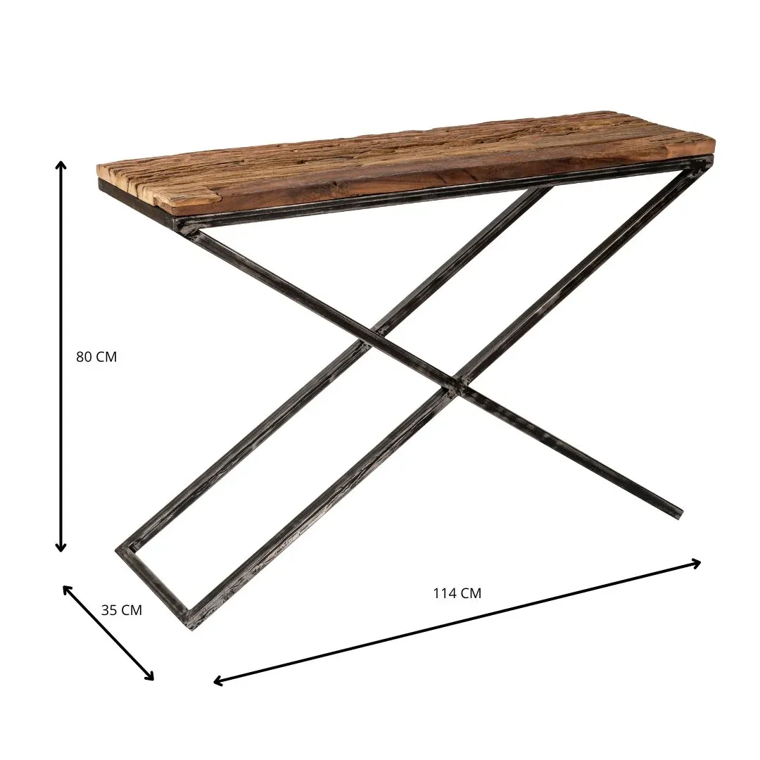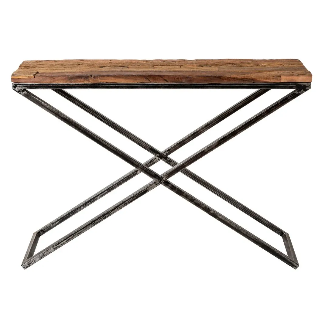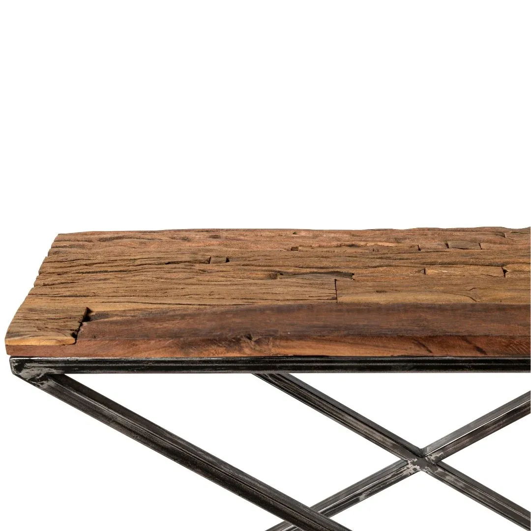 Preciosa consola con tapa fabricada en madera de teca reciclada en color natural con estructura de patas en hierro color negro.