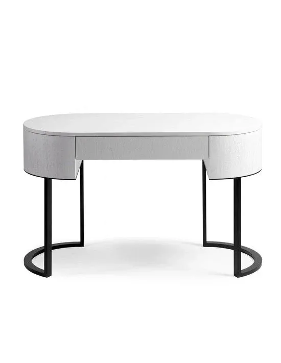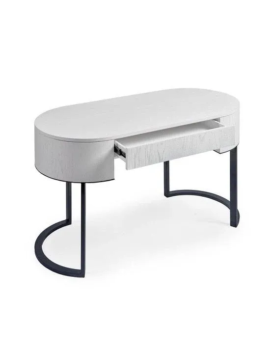 Consola ovalada acabada en madera de roble color blanco con cajón para almacenaje. Esta pieza está pensada para dar estilo y sofisticación a tu hall, distribuidor. Su cajón será perfecto para guardar las pequeñas pertenencias del día a día y mantener el orden en tu recibidor. Estructura de pata de metal color negro.