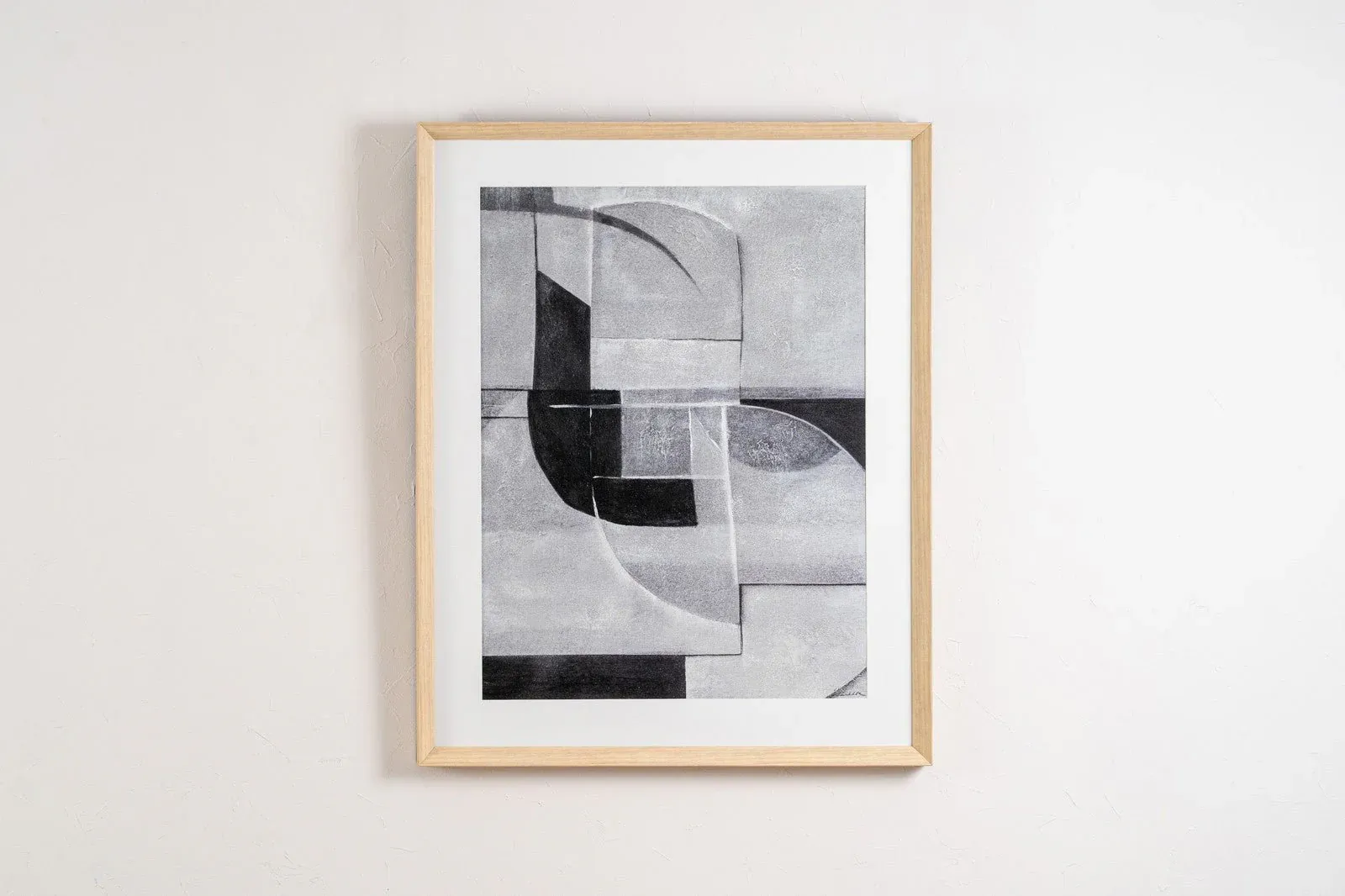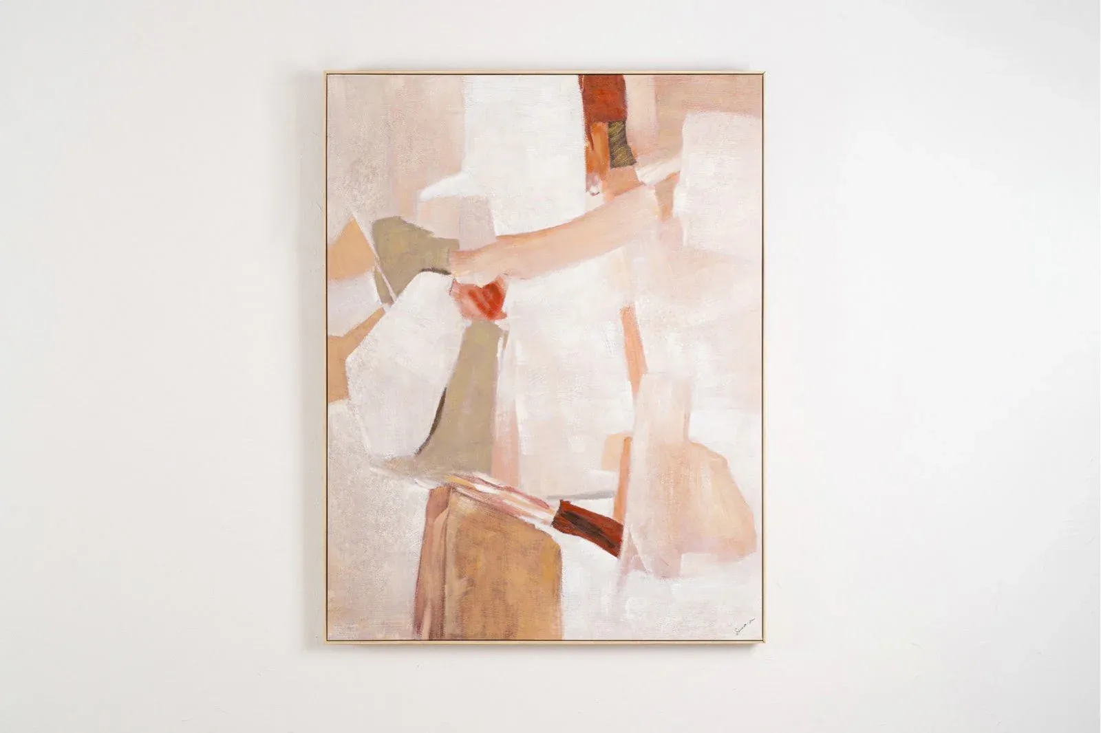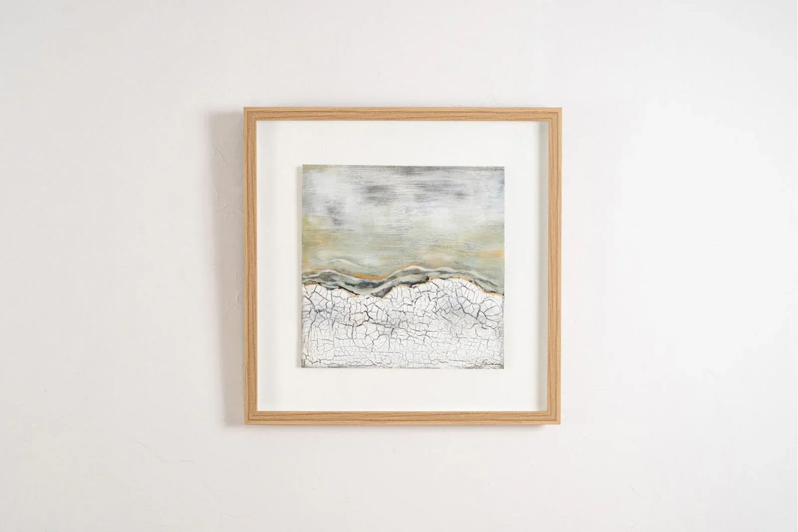 Cuadro abstracto sobre lino pintado a mano, creando relieves en tonos arena, blancos, grises, y negros e incluso algún toque en granate.Marco de madera en color claro.