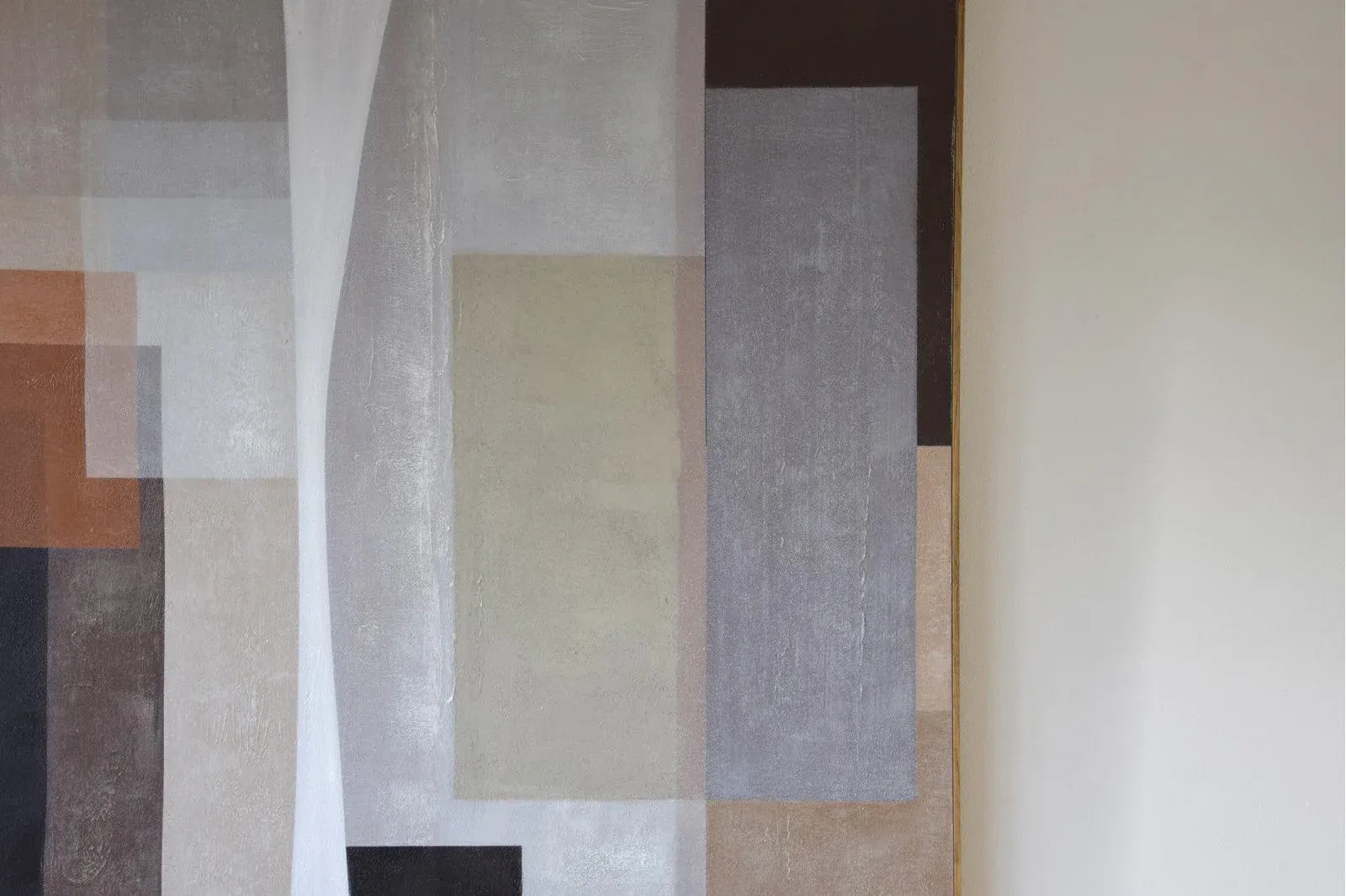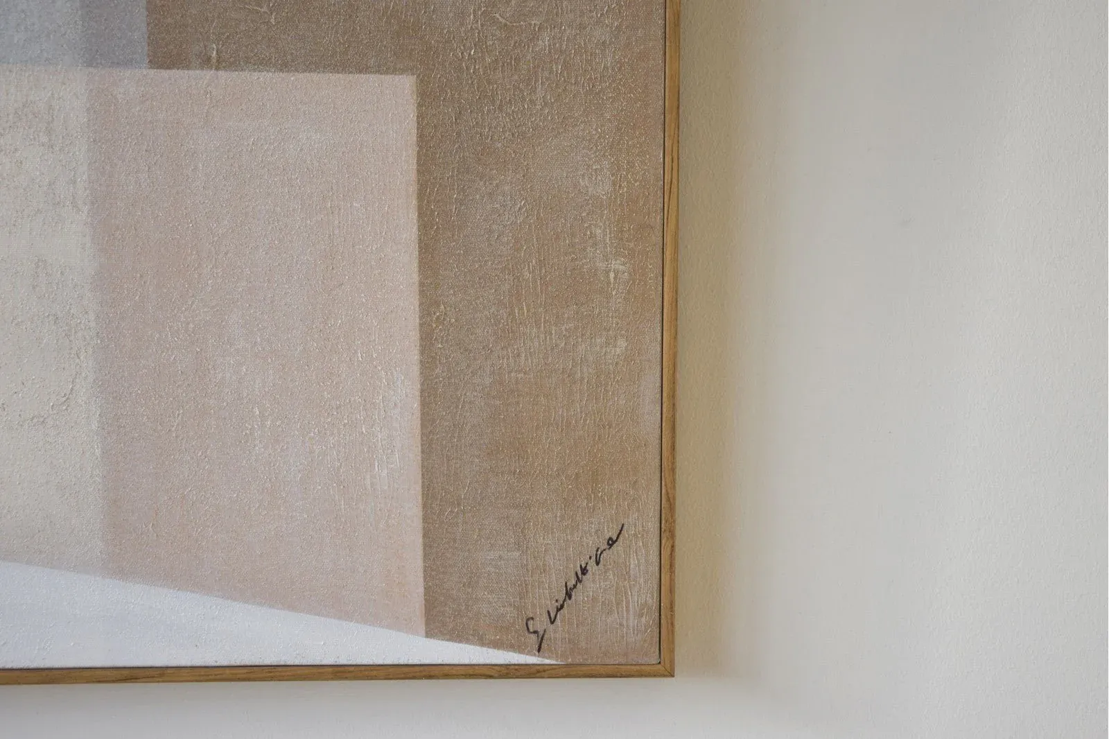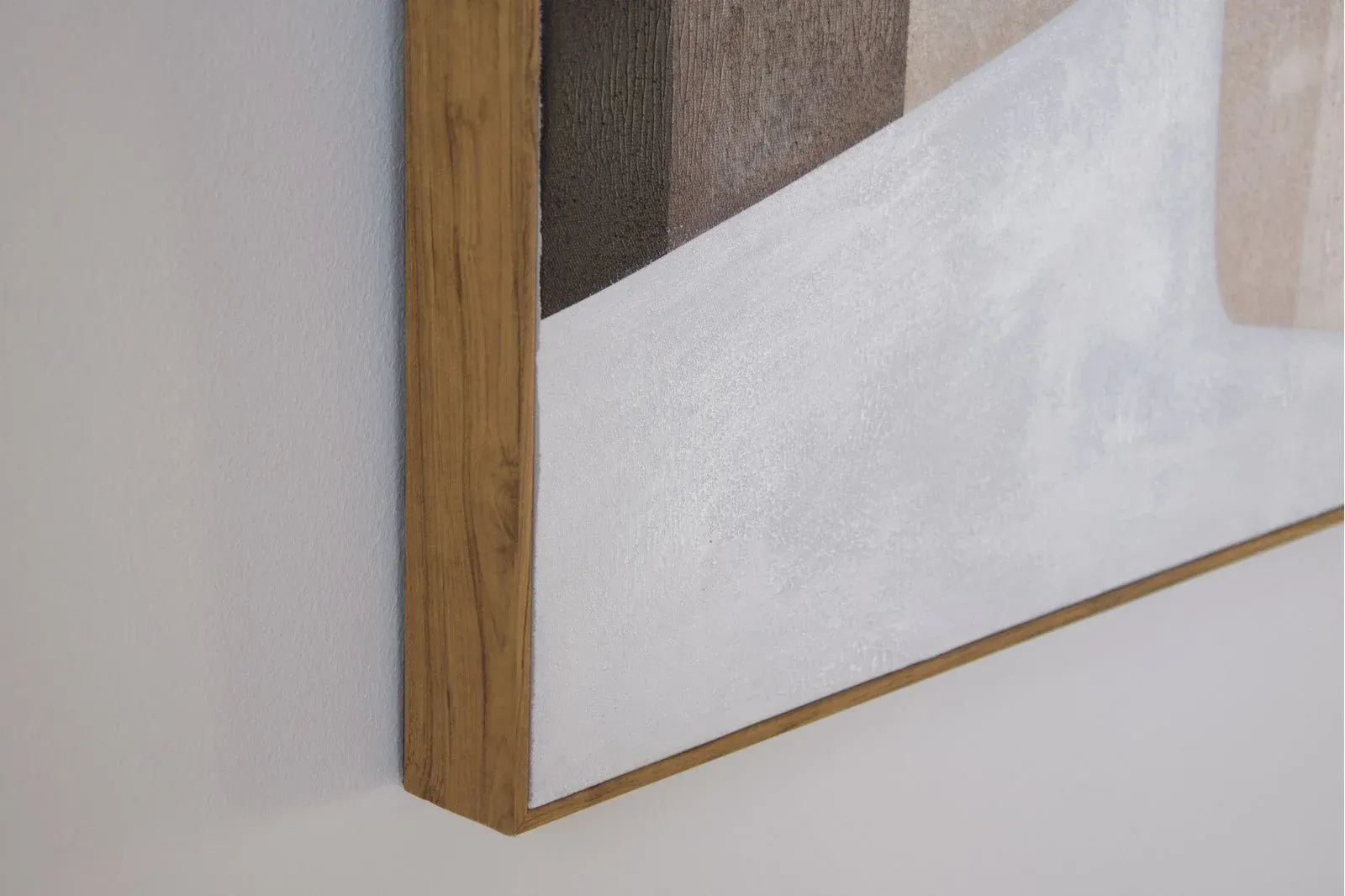 Cuadro Abstracto acrílico sobre lienzo, pintado a mano en tonos, gris. ocre, blanco y un toque negro. El marco acabado en color madera.