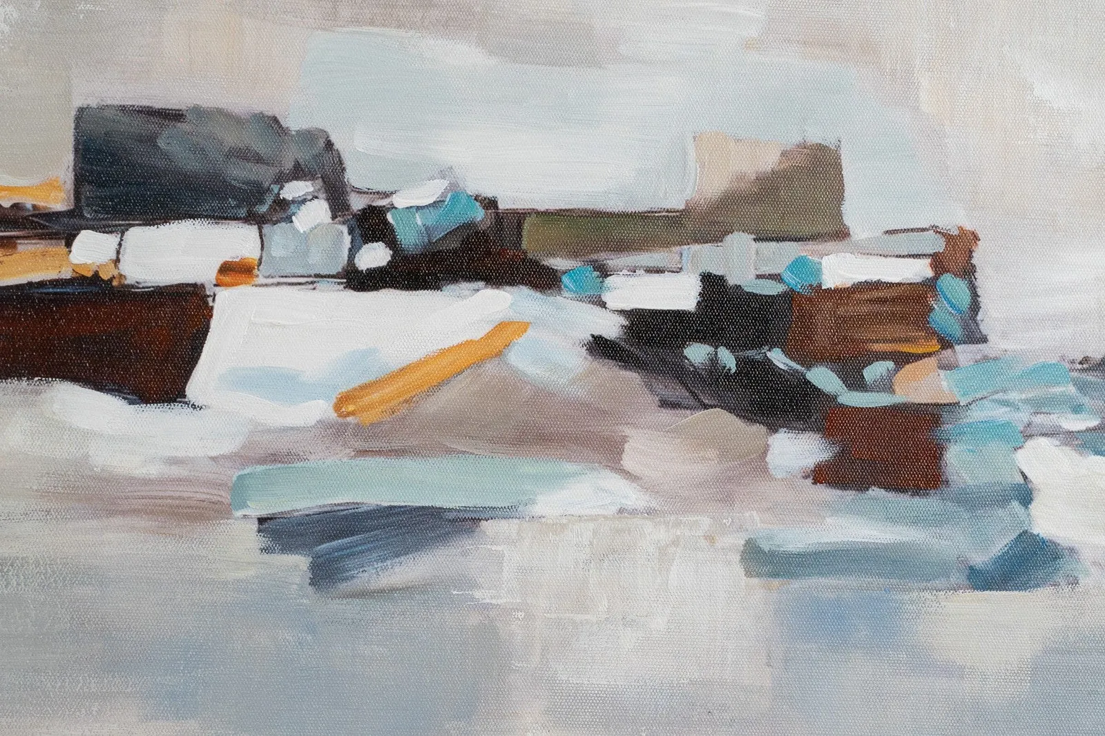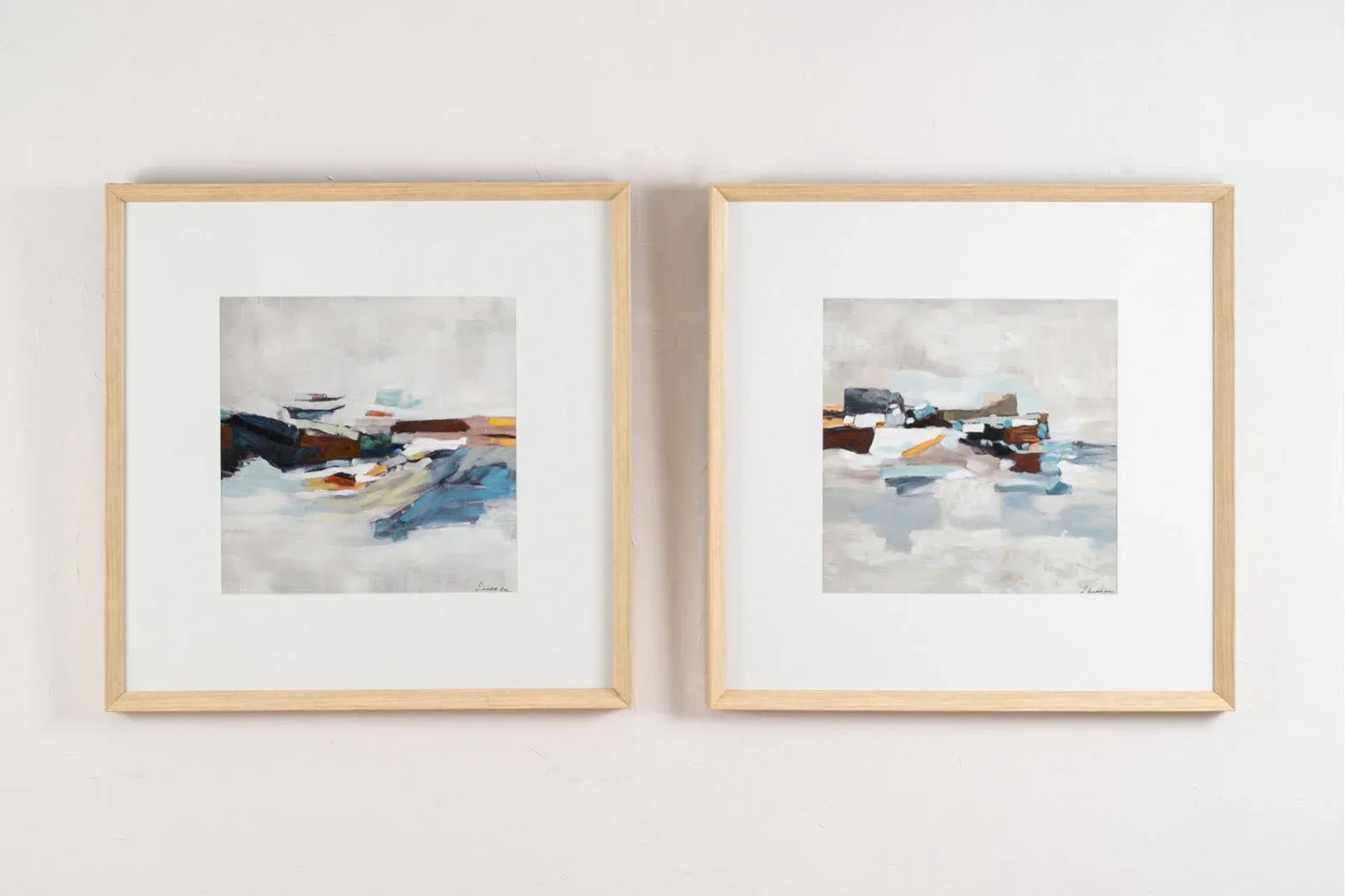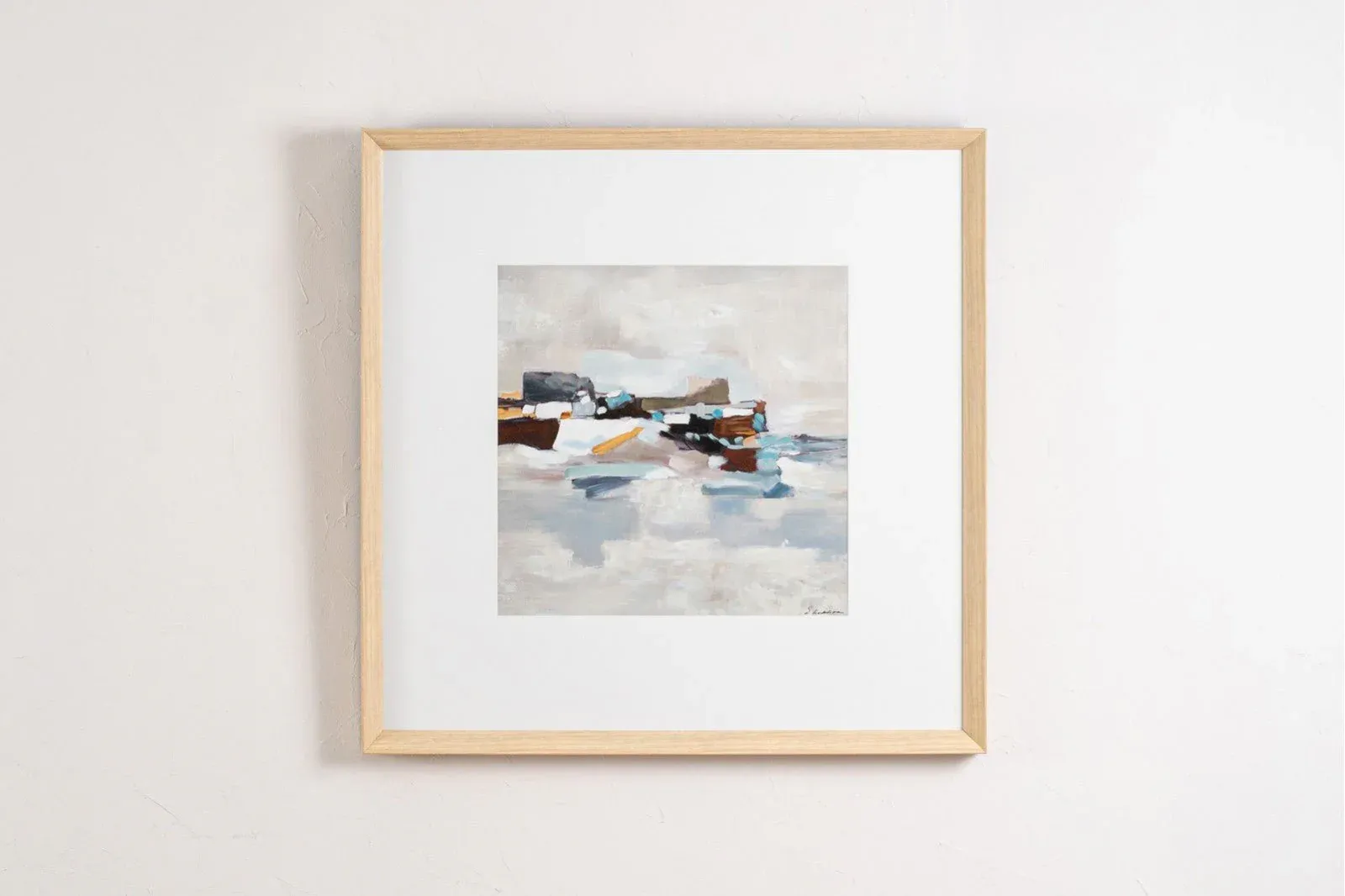Pintura abstracta realizada a mano sobre lienzo en tonos azules, blanco y ocres sobre un fondo con textura en colores blanco, enmarcada en cristal y con marco madera natural. Disponible dos modelos diferentes.