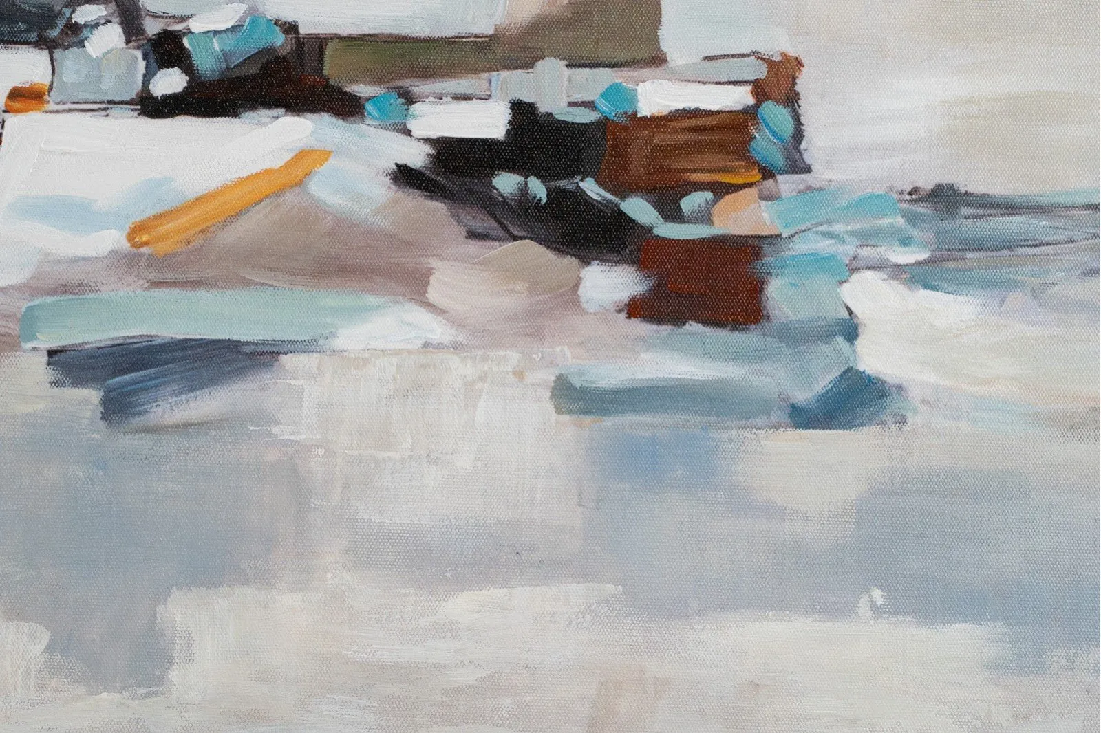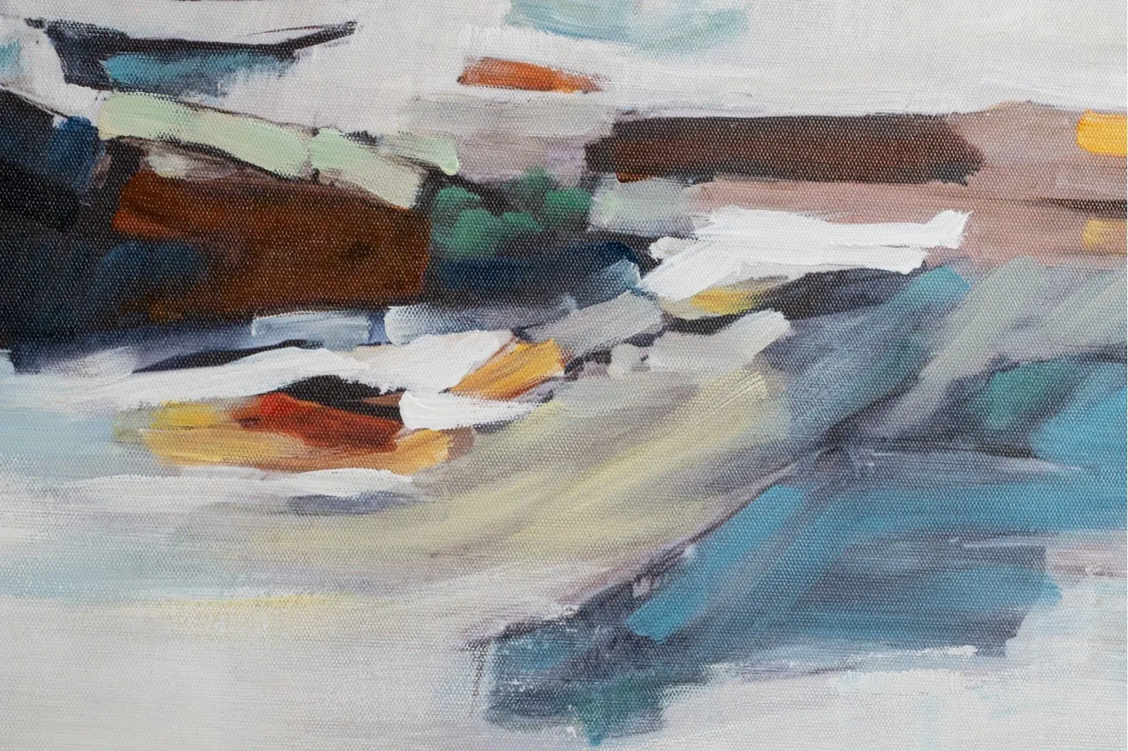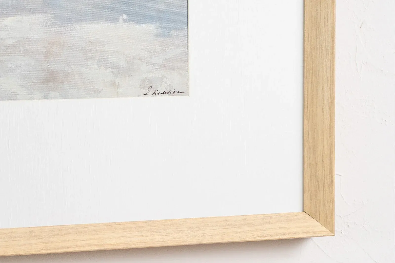 Pintura abstracta realizada a mano sobre lienzo en tonos azules, blanco y ocres sobre un fondo con textura en colores blanco, enmarcada en cristal y con marco madera natural. Disponible dos modelos diferentes.