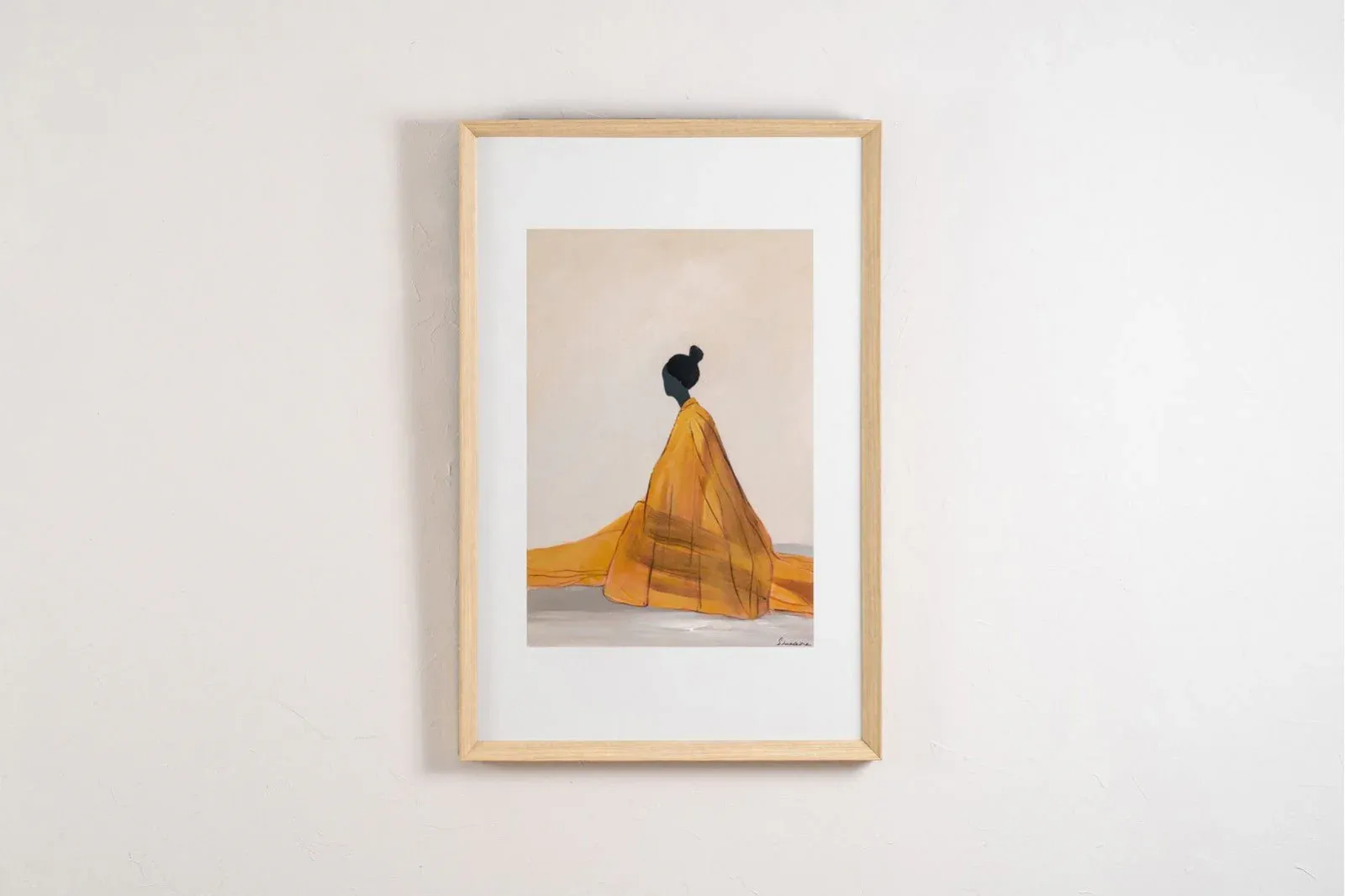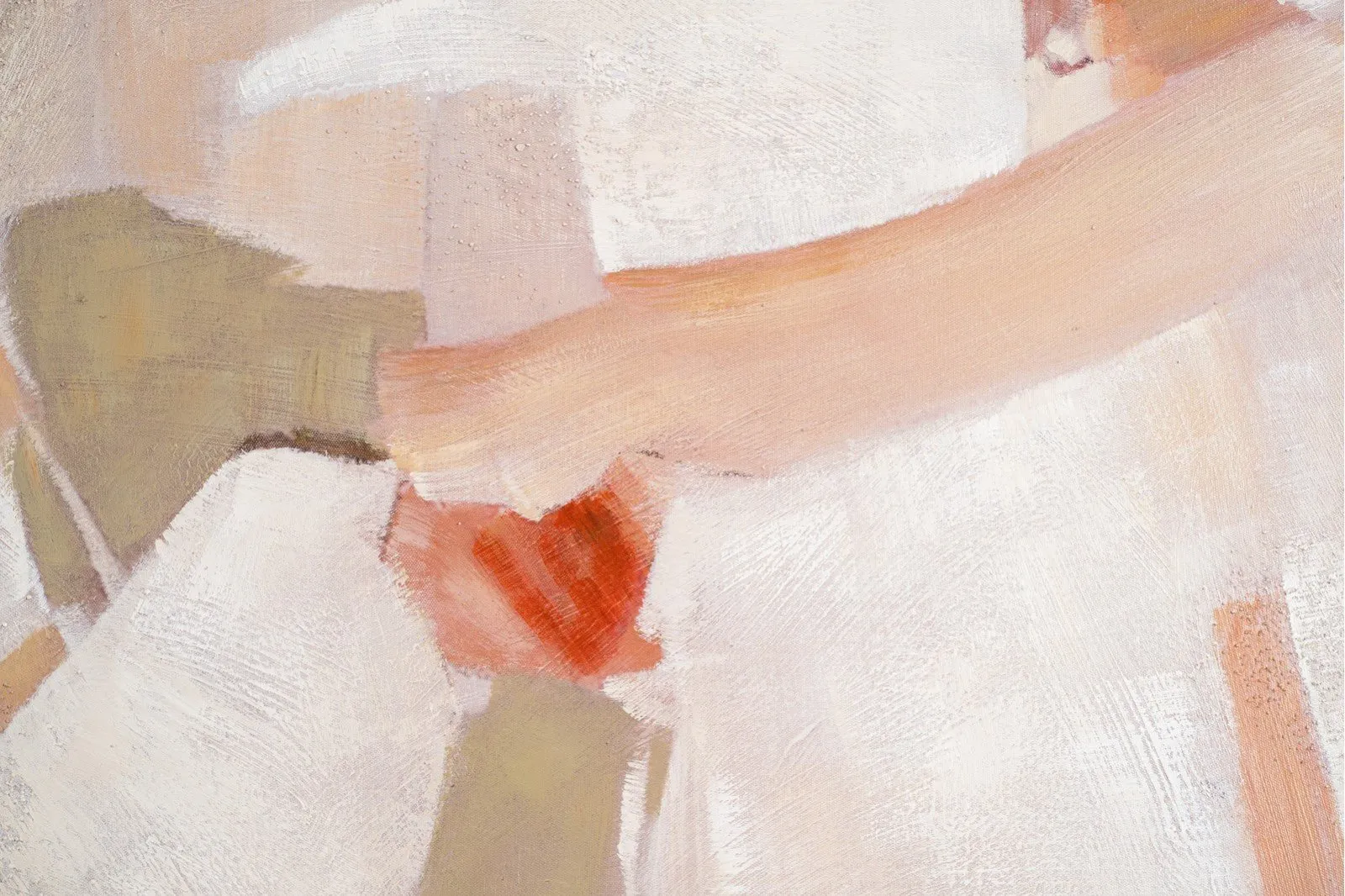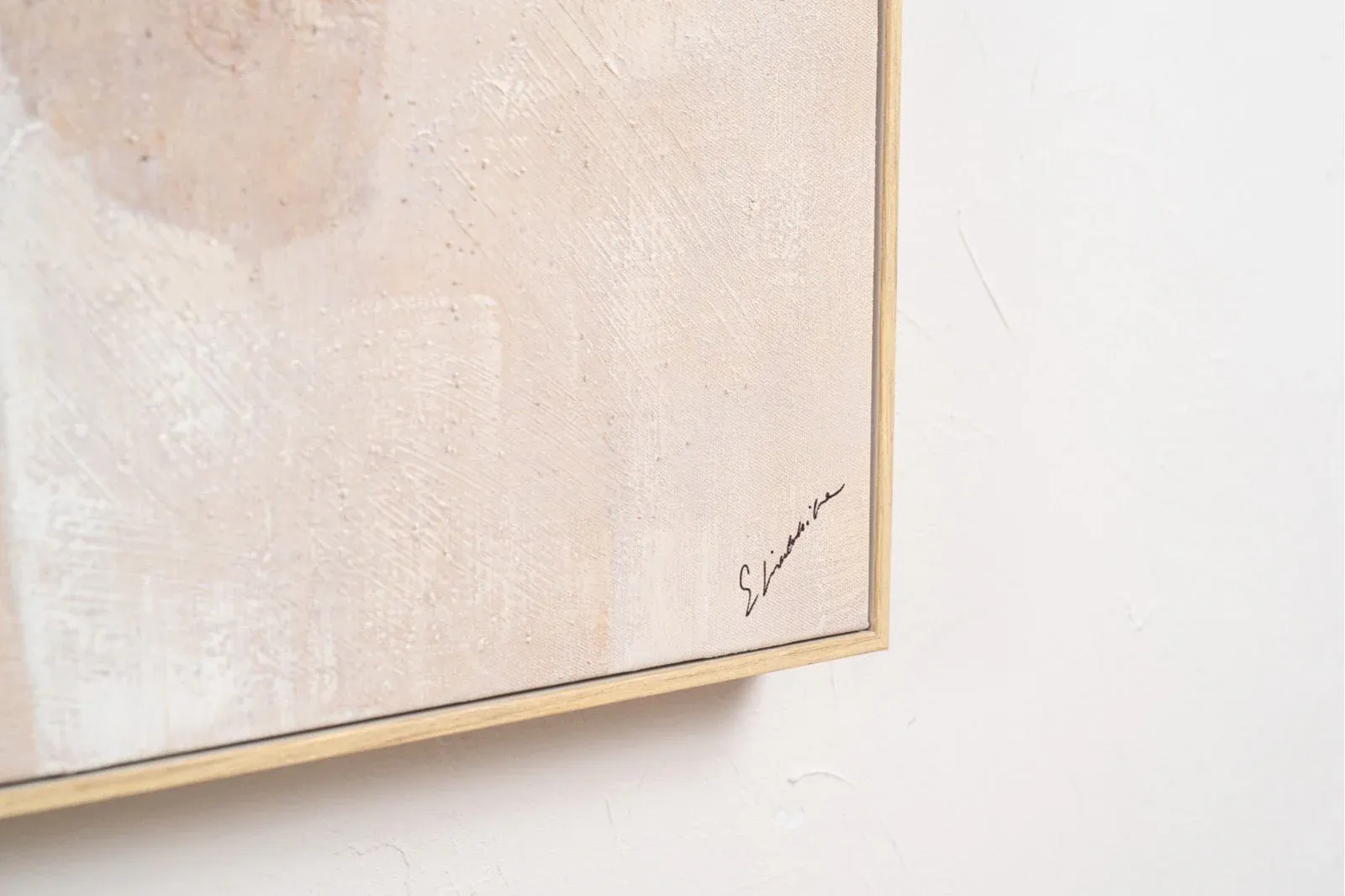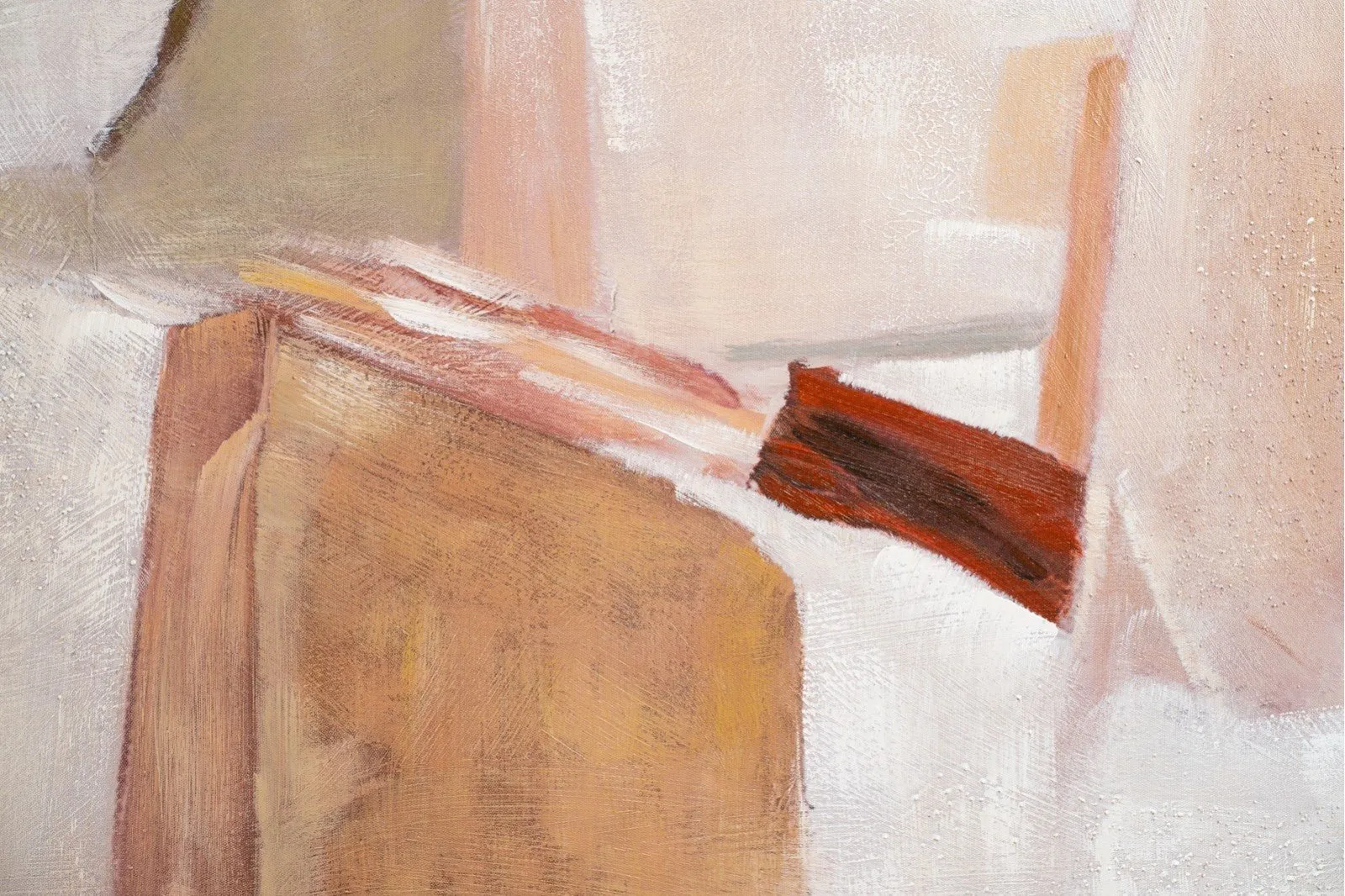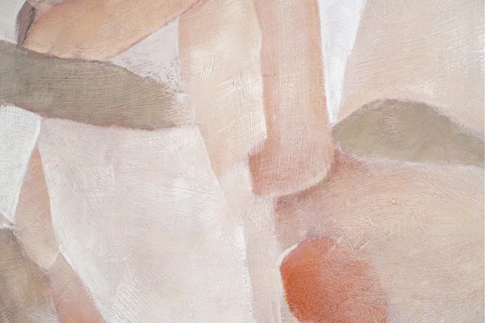 Cuadro abstracto acrílico sobre lienzo pintado a mano, cuadro con suaves texturas superpuestas en tonos cálidos arenas, marrones, naranjas, verdes y blancos, marco en color madera natural.