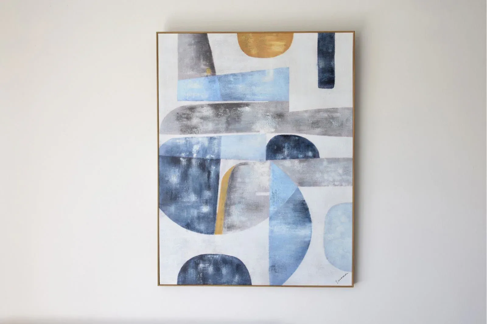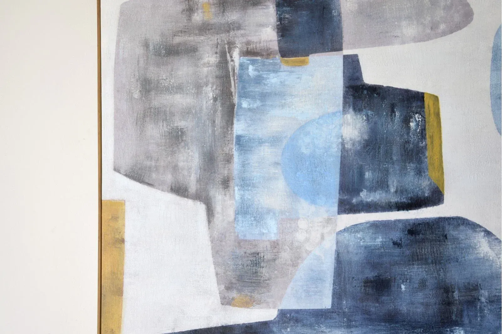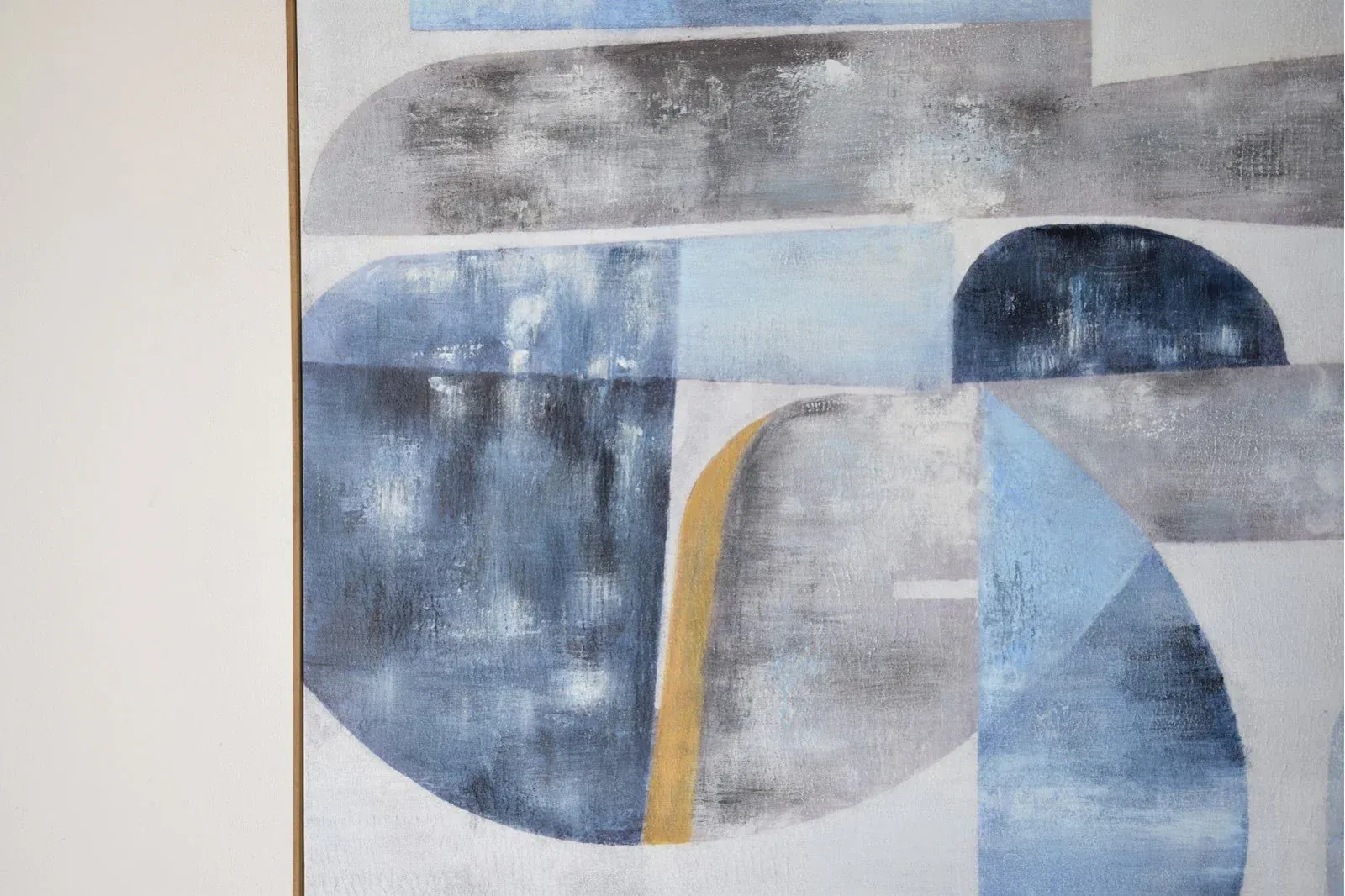 Cuadro abstracto con sombras color azul acrílico sobre lienzo pintado a mano, pintura de forma geométricas superpuestas en tono azul, gris y blanco con toques de ocre con marco en color madera.