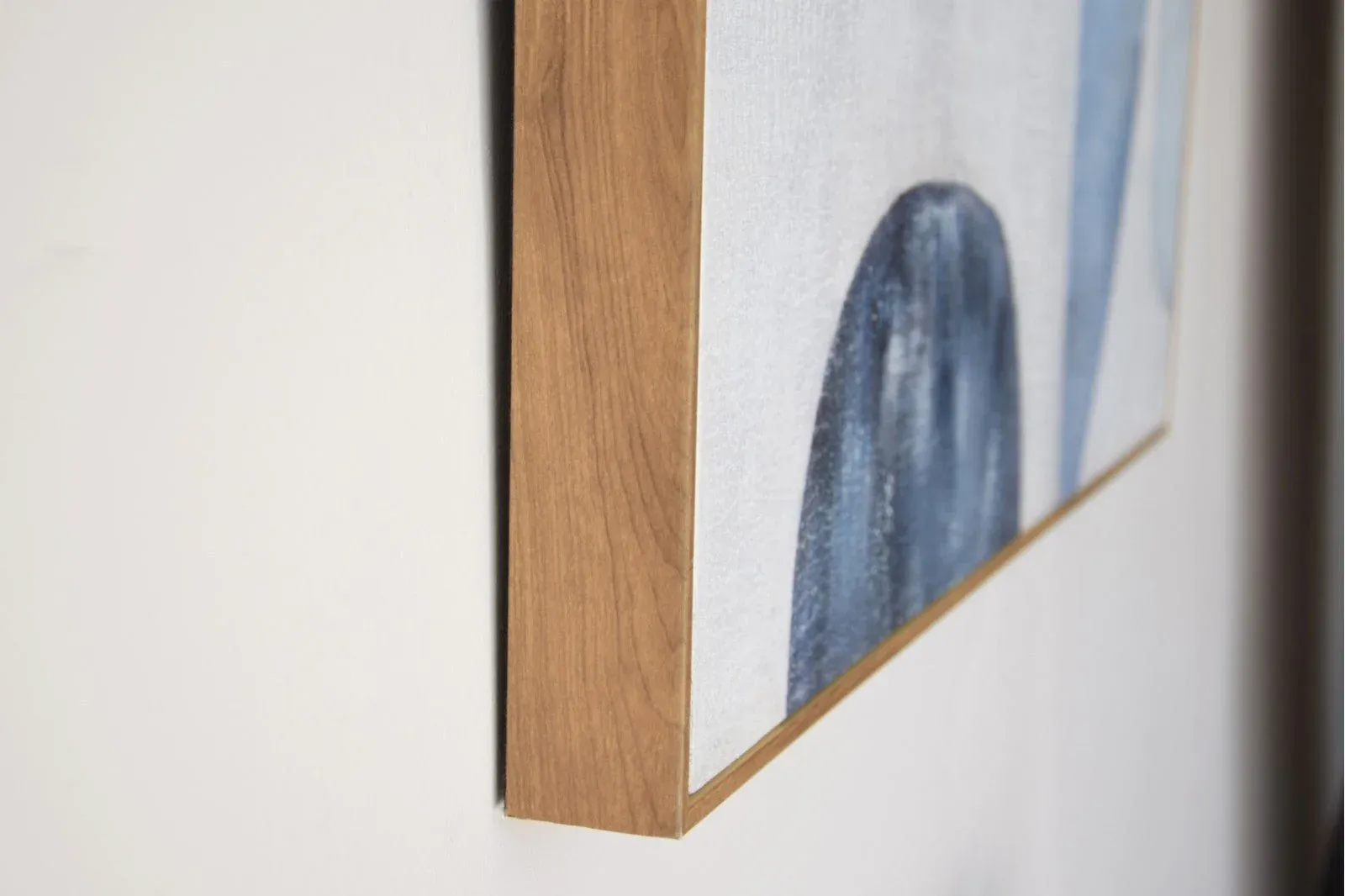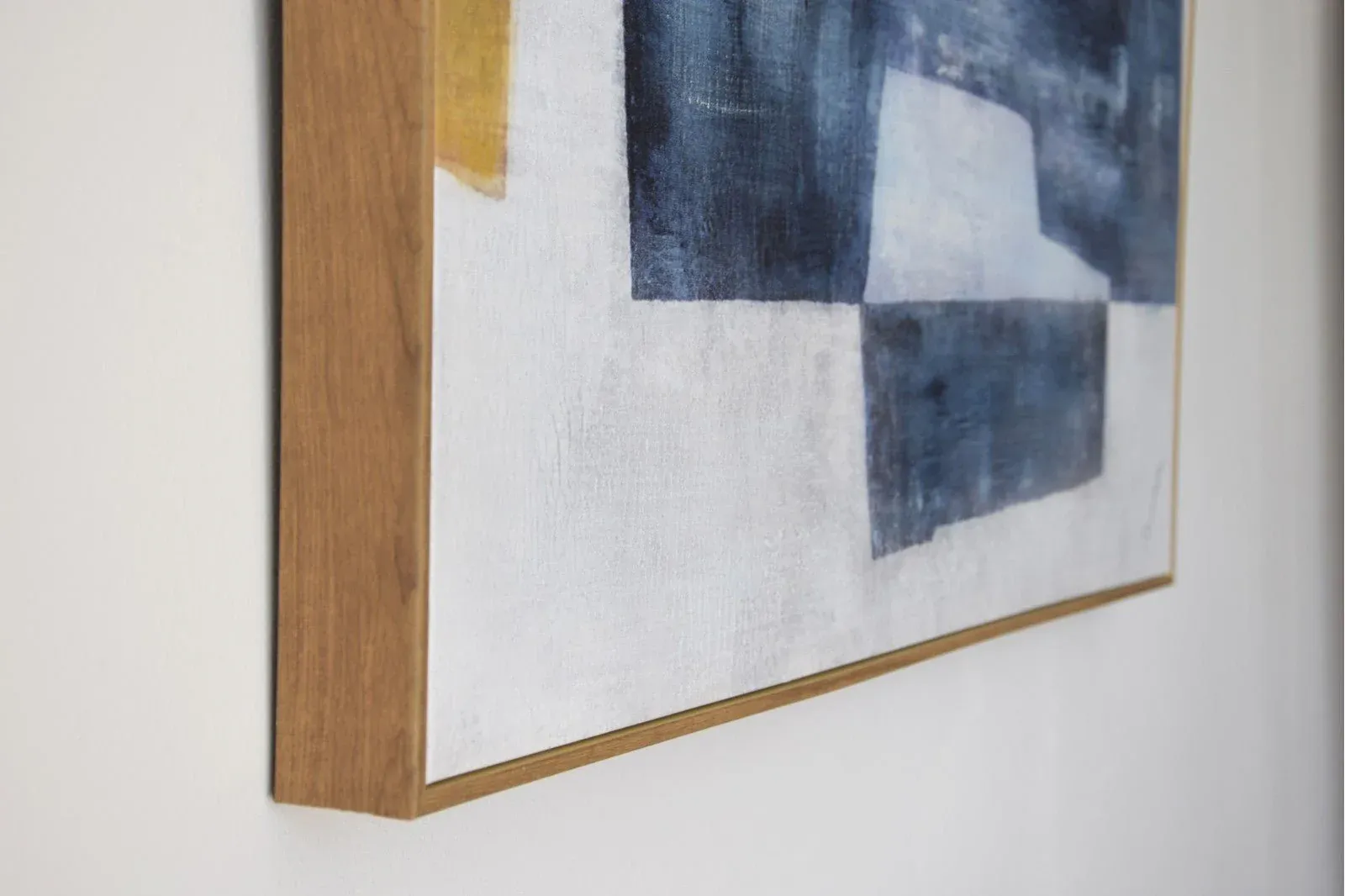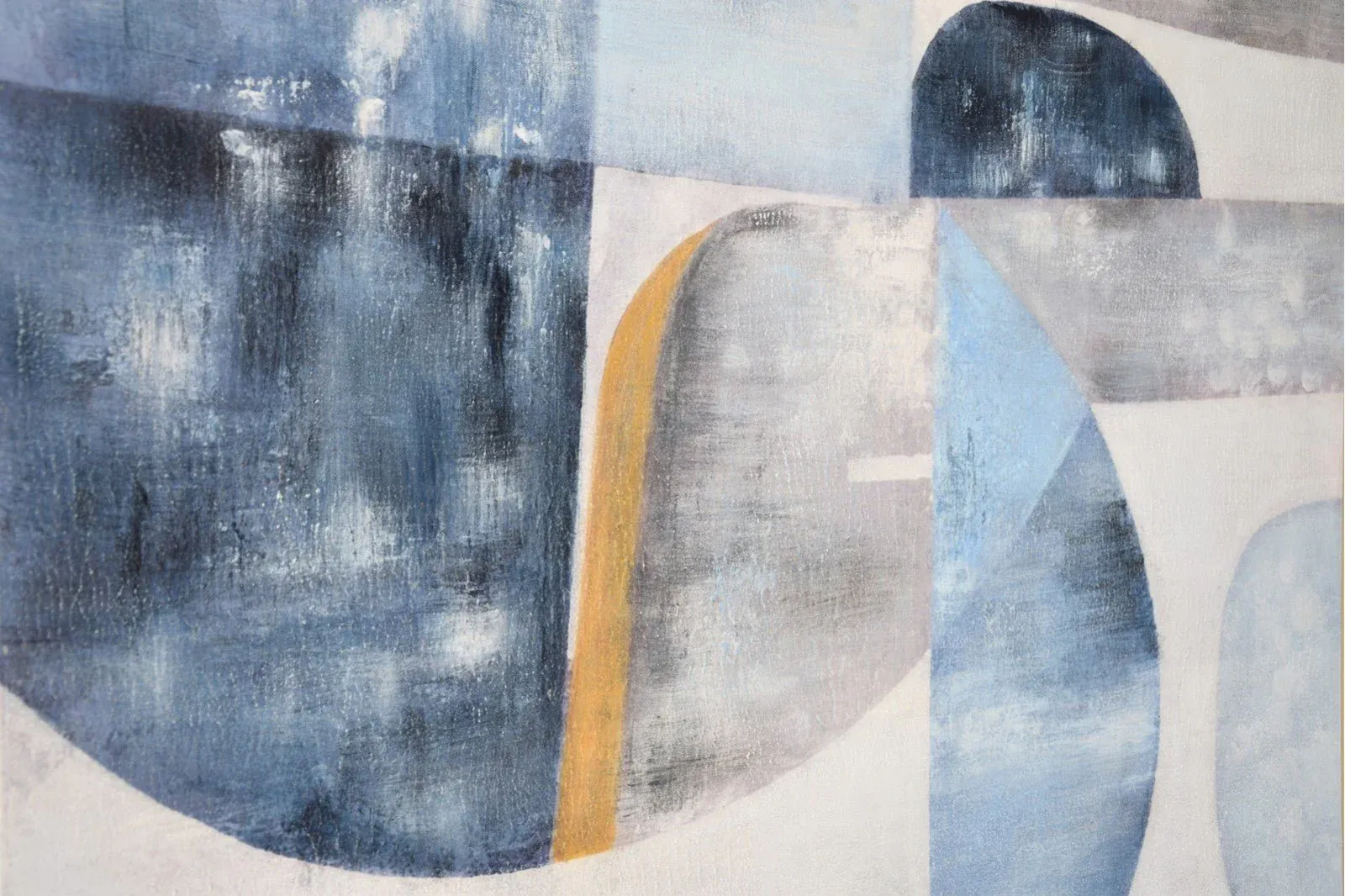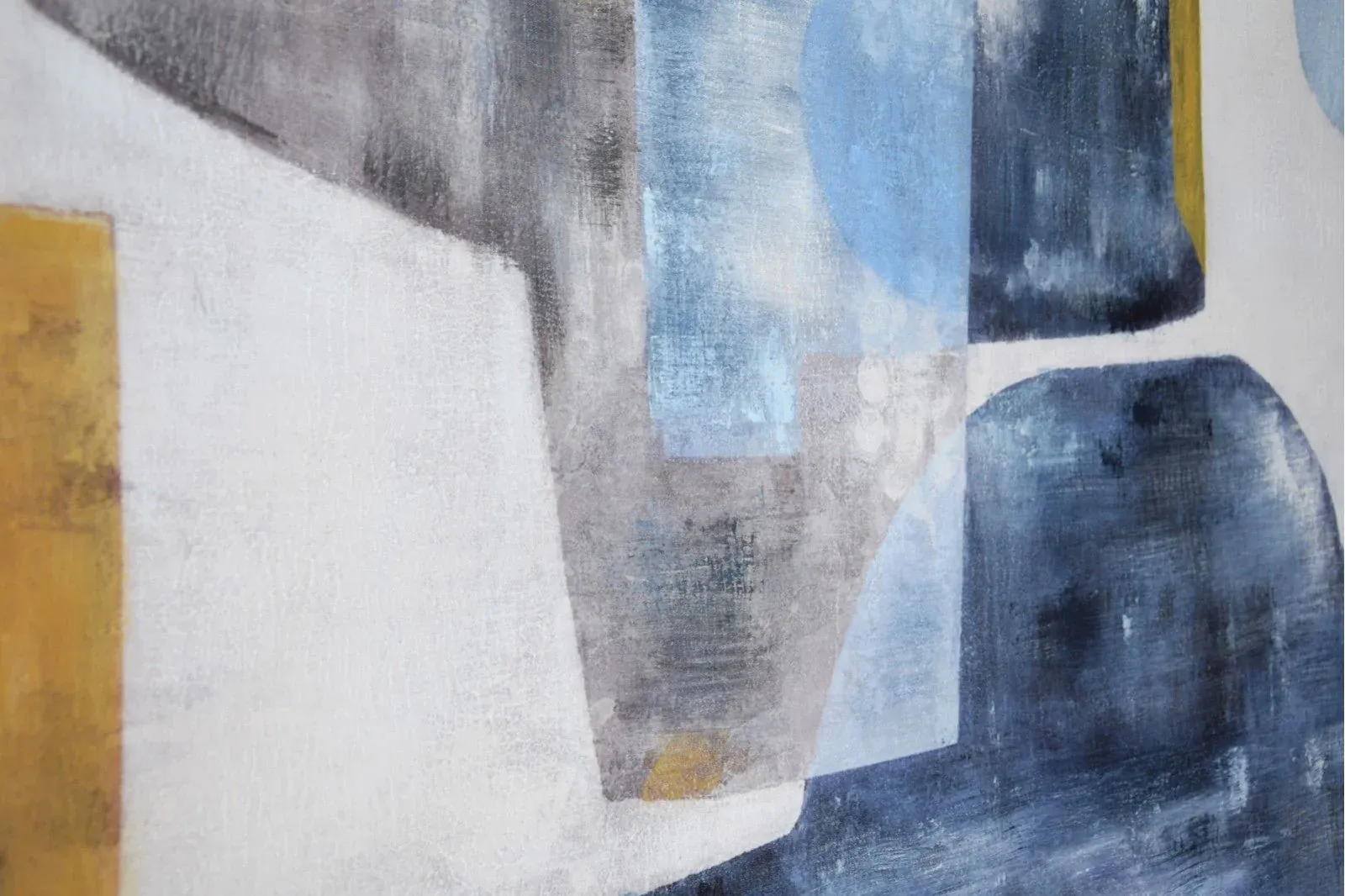 Cuadro abstracto con sombras color azul acrílico sobre lienzo pintado a mano, pintura de forma geométricas superpuestas en tono azul, gris y blanco con toques de ocre con marco en color madera.