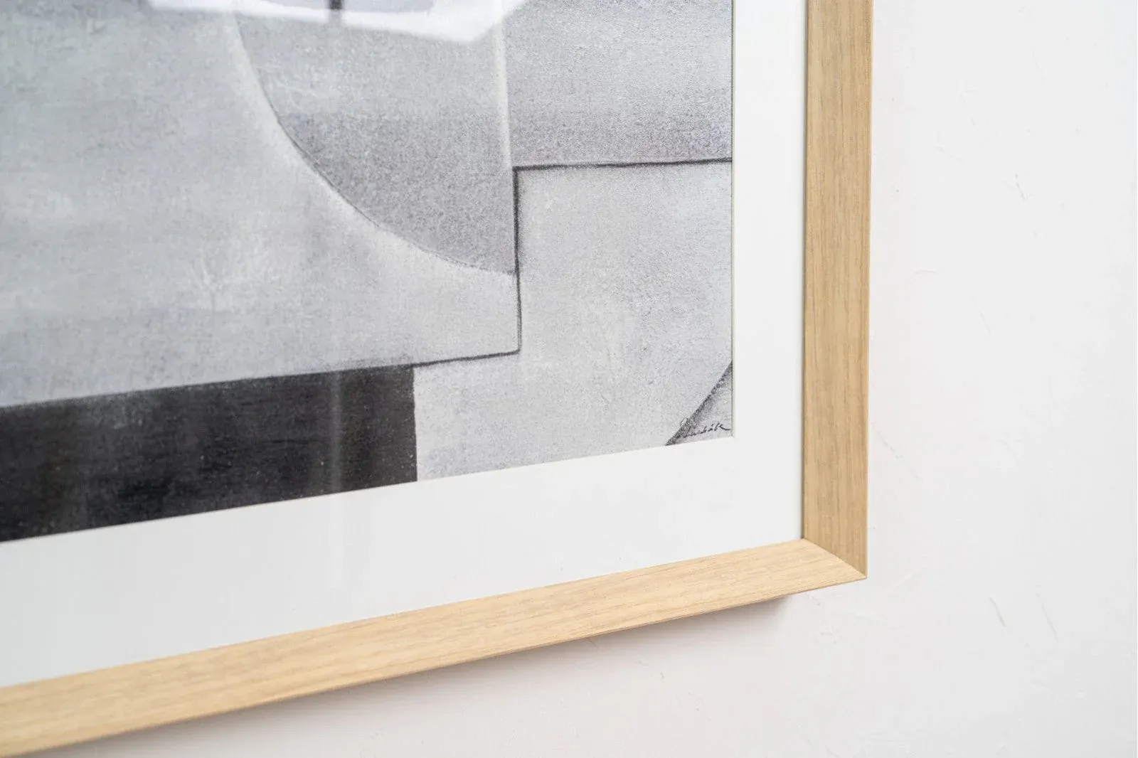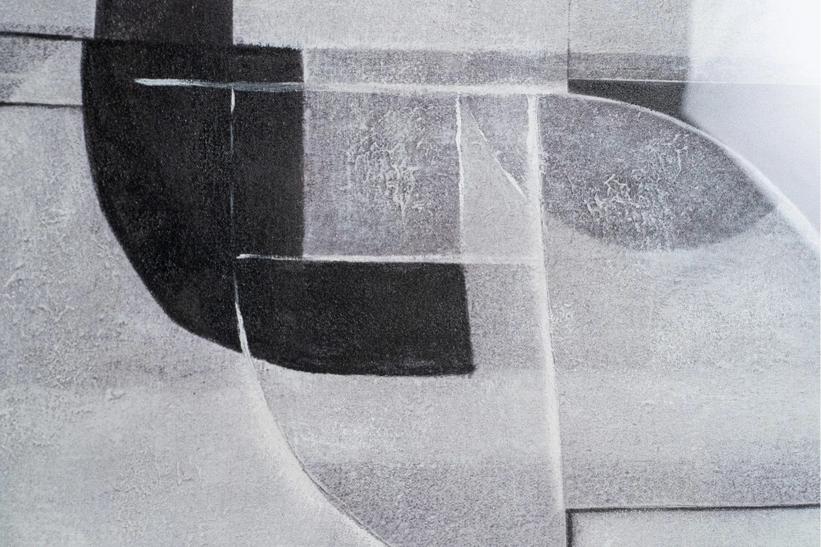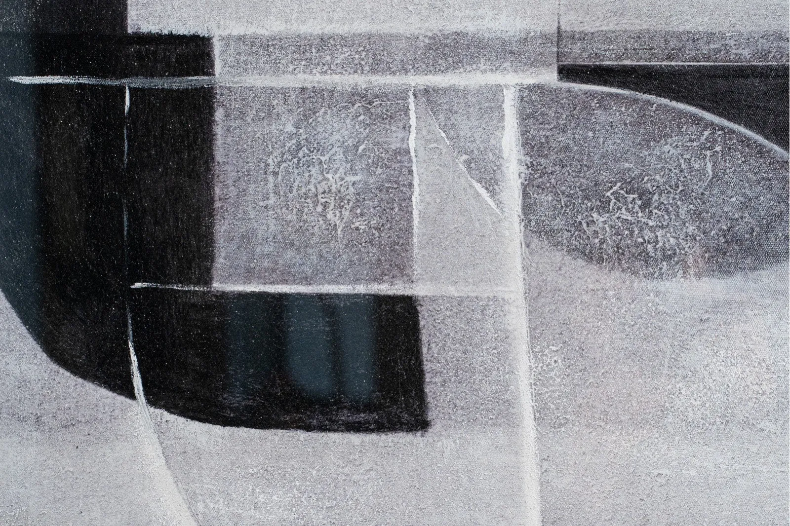 Pintura abstracta realizada a mano sobre lienzo en tonos grises, blancos y negros con textura, enmarcada en cristal y con marco en color madera natural.