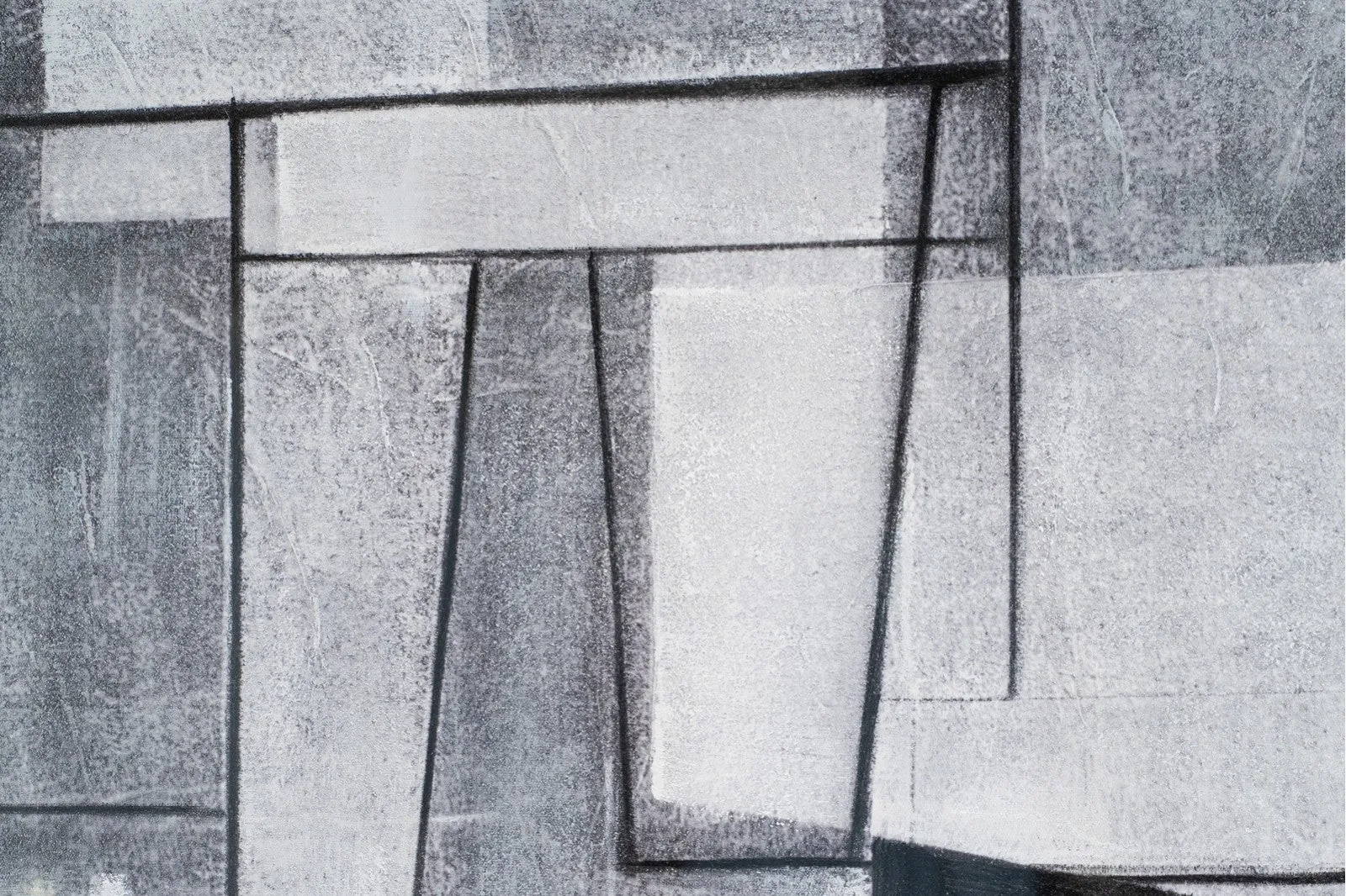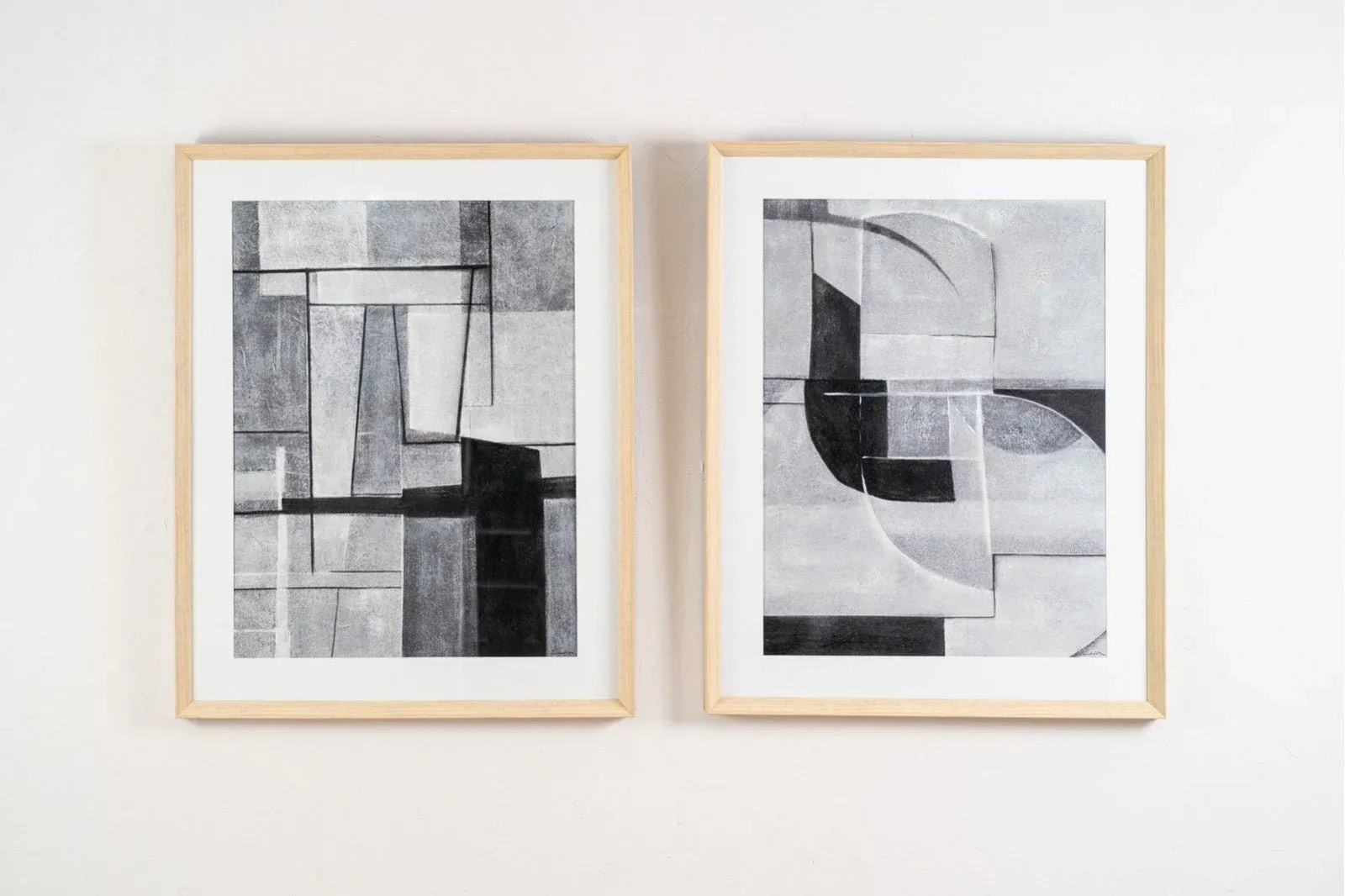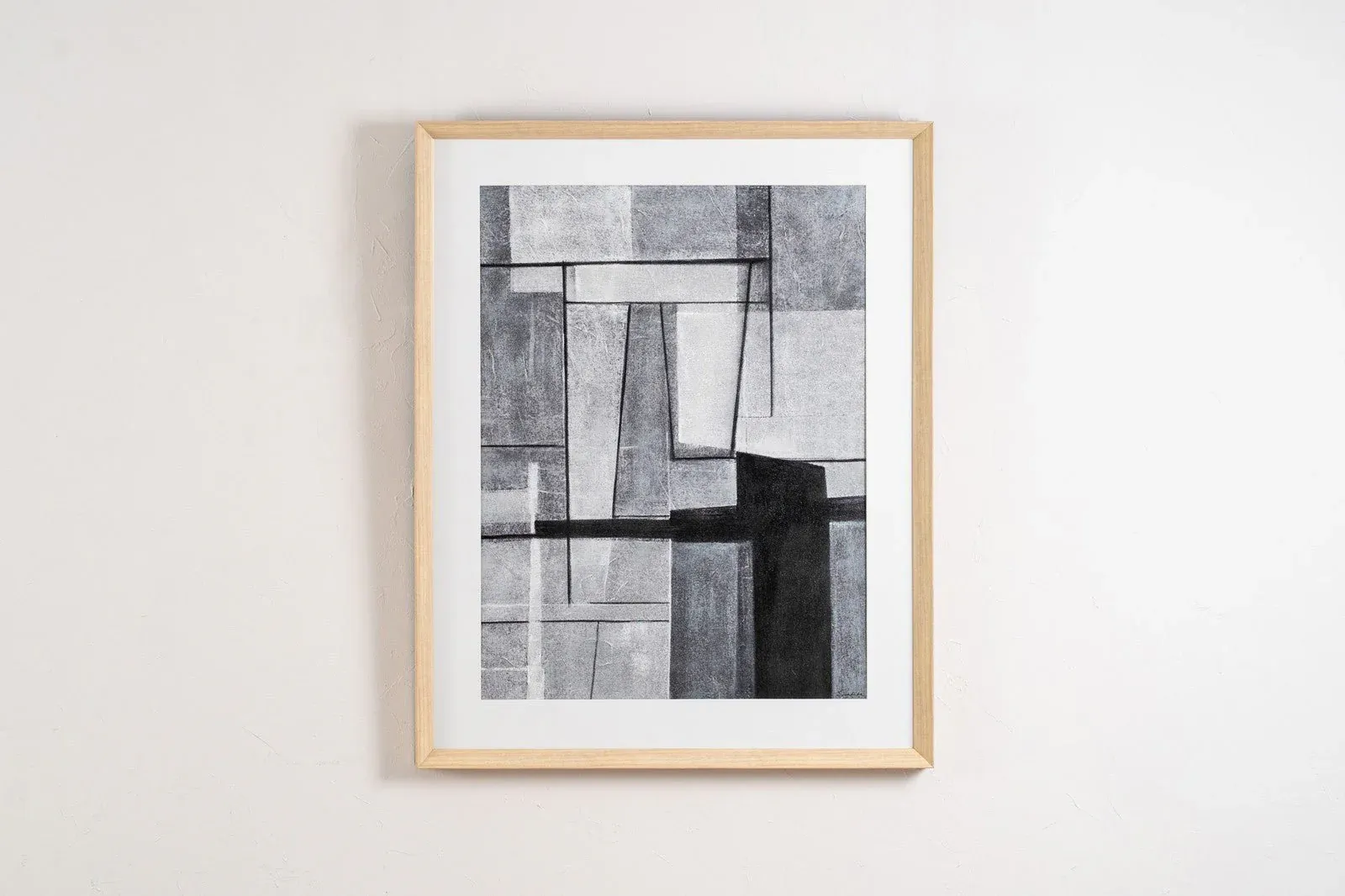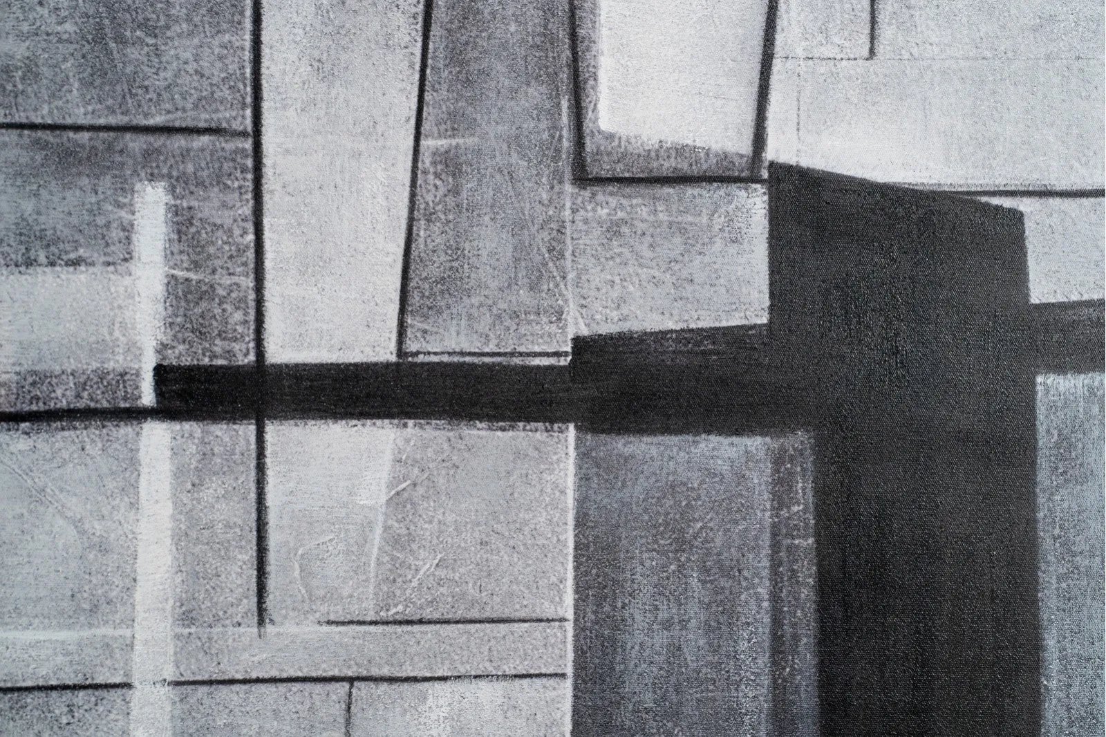 Pintura abstracta realizada a mano sobre lienzo en tonos grises, blancos y negros con textura, enmarcada en cristal y con marco en color madera natural.