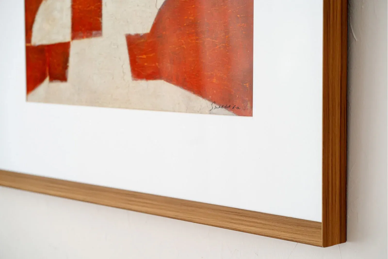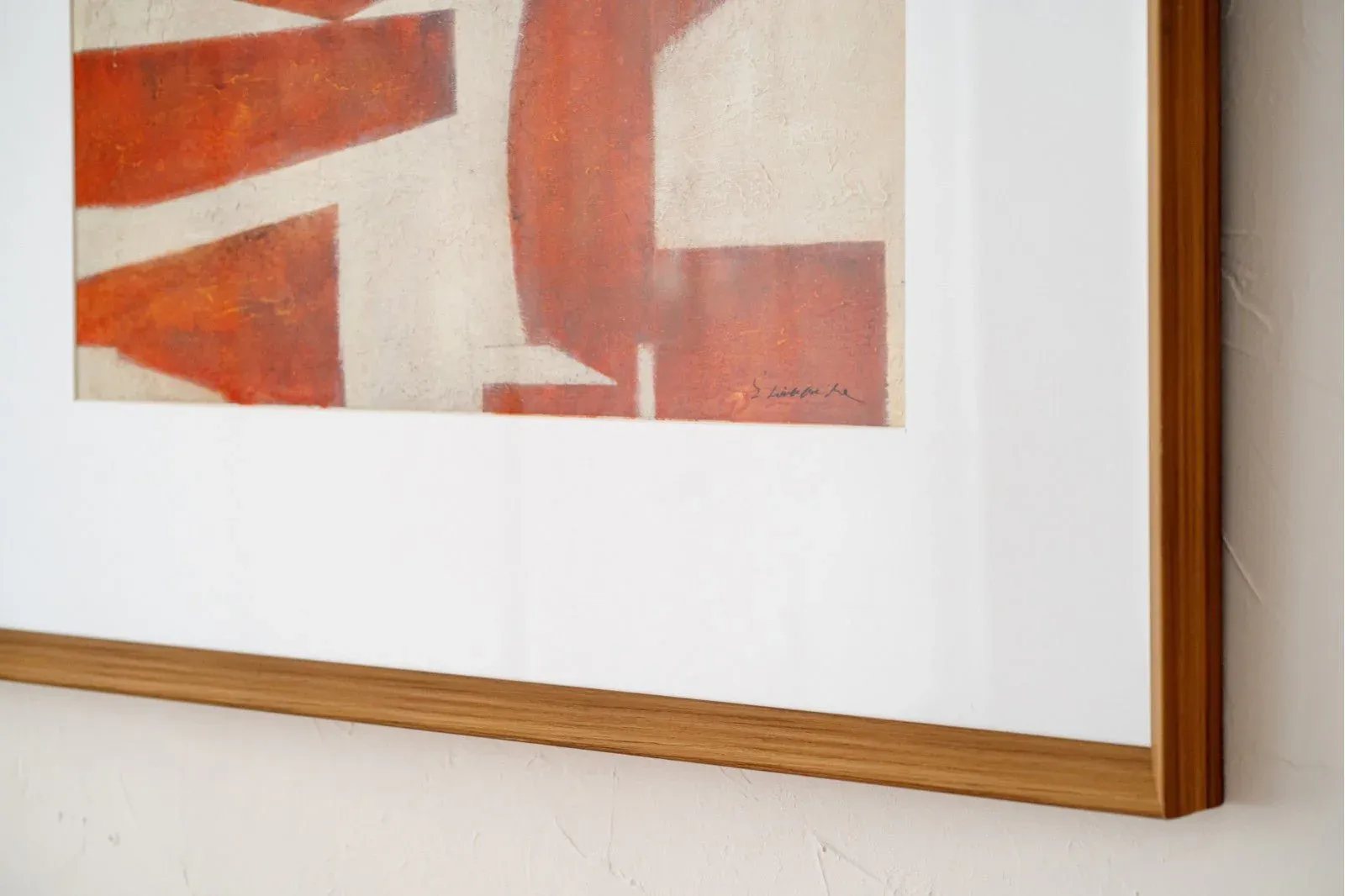 Cuadro sobre lienzo pintado a mano, pintura de formas geométricas en tonos naranjas, ocres y crema. Marco de color madera. .