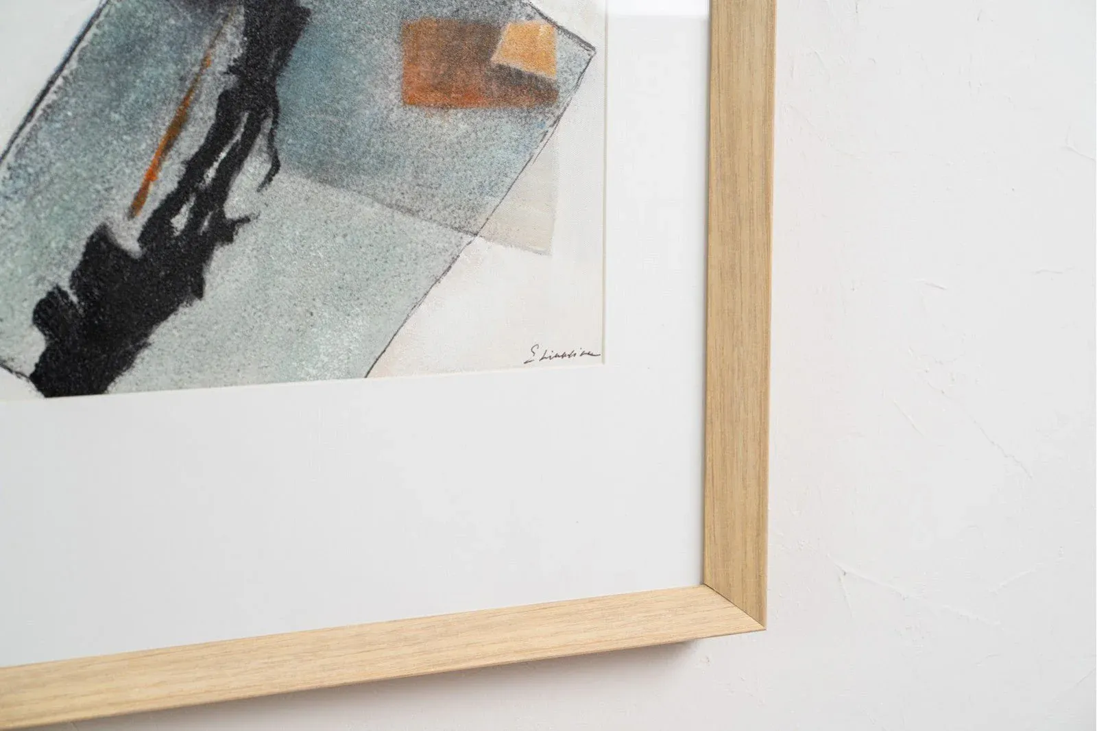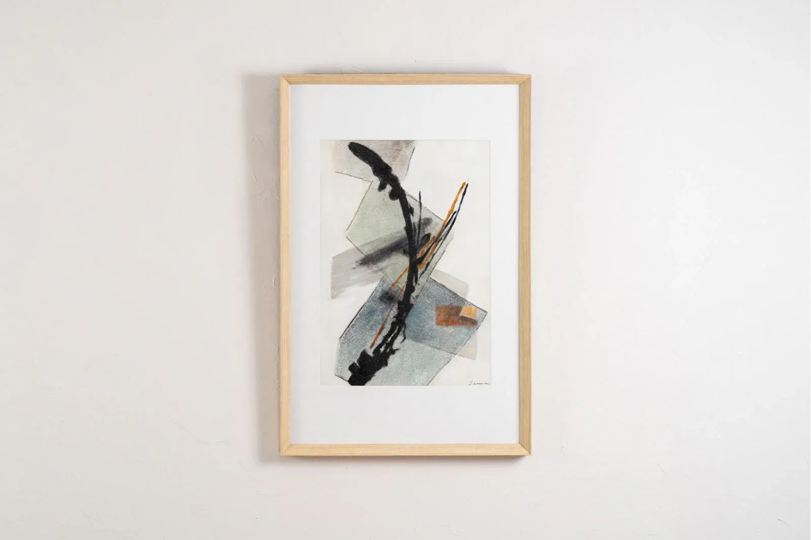 Cuadro abstracto realizado a mano sobre lienzo con una composición en cubos usando tonos grises, verdes, azules y un toque de naranja oscuro, enmarcada en cristal y con marco en color madera natural.
