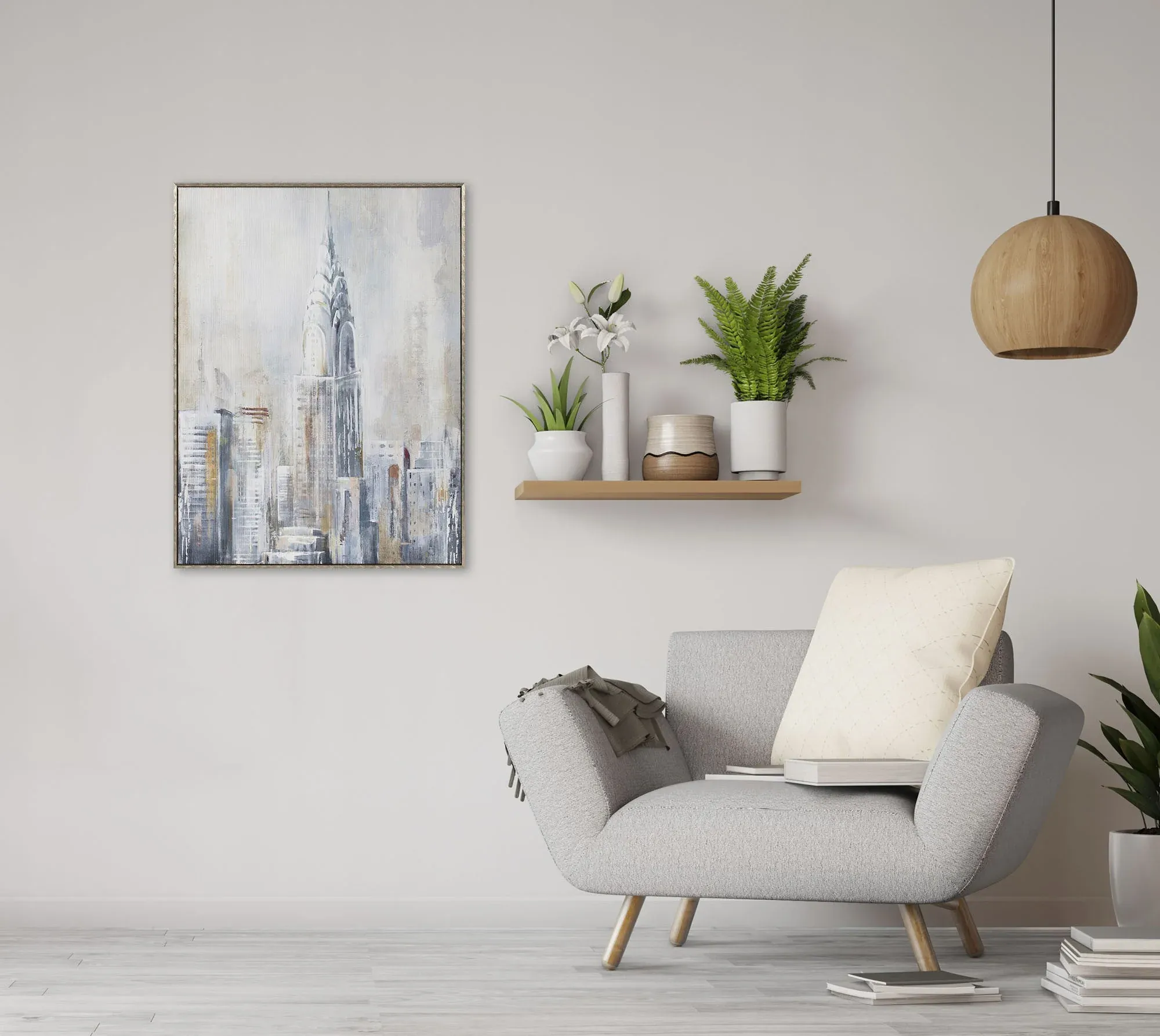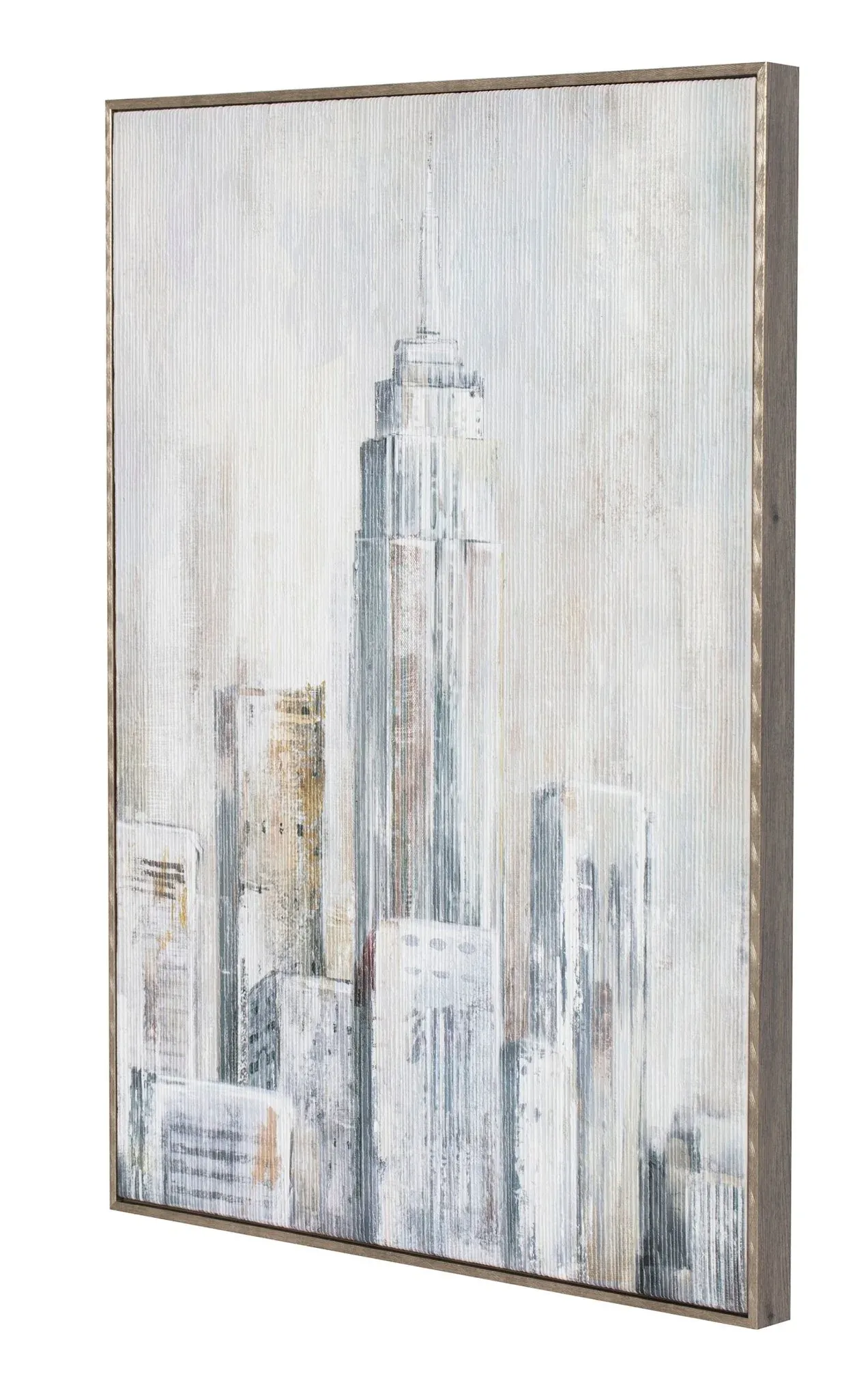 Precioso cuadro sobre lienzo con dibujo de New York con marco en madera color gris.