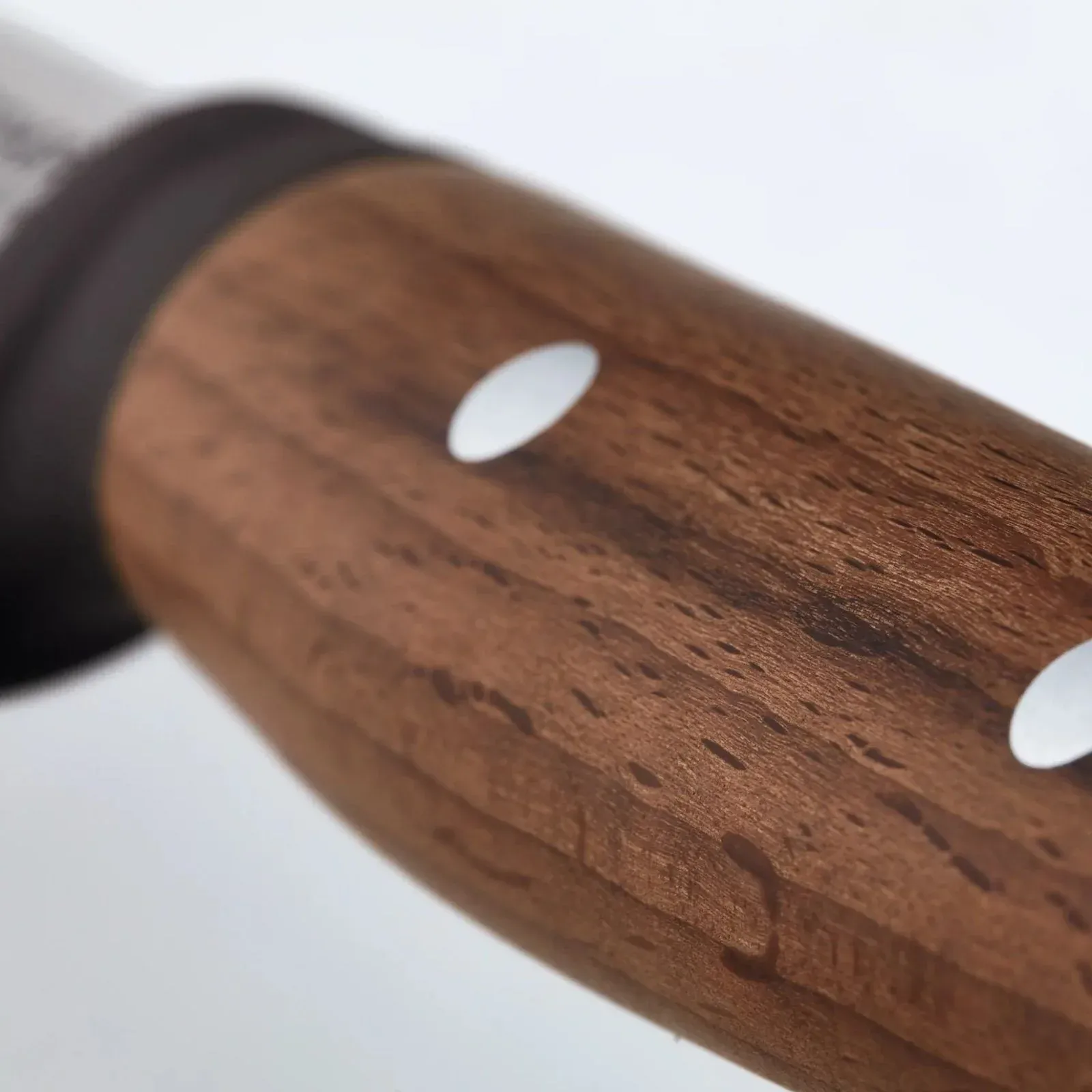 El mango, maravillosamente perfumado, está fabricado con madera de haya cultivada de forma sostenible y tratada térmicamente. El mango es extremadamente robusto e impermeable. La virola entre la hoja y el mango es de goma antideslizante para que el cuchillo se sienta seguro en la mano, incluso en circunstancias de humedad.