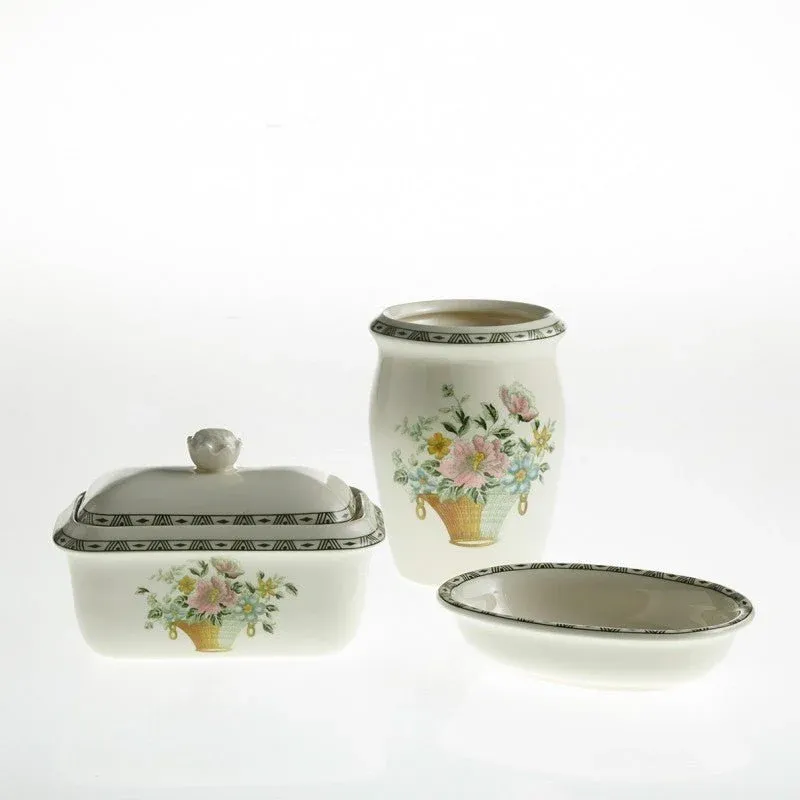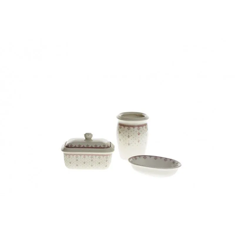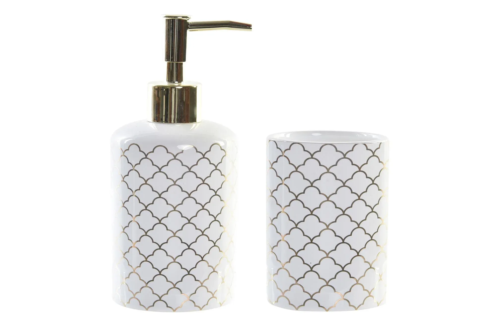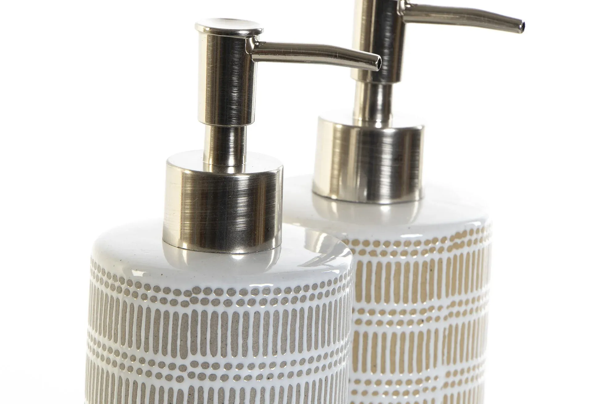 Dispensador para jabón fabricado en gres con el dosificador en metal color plateado en colores gris y beige.