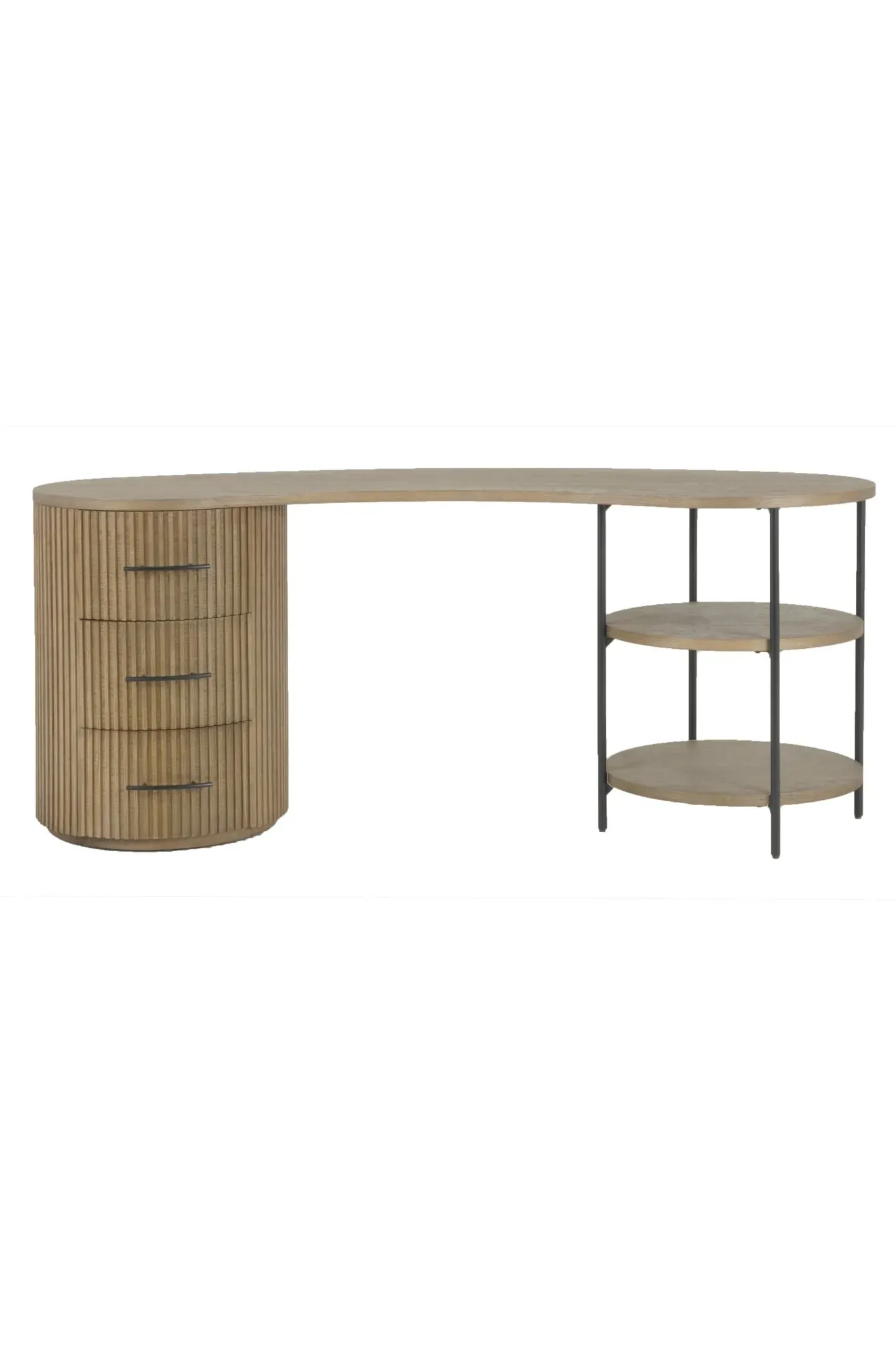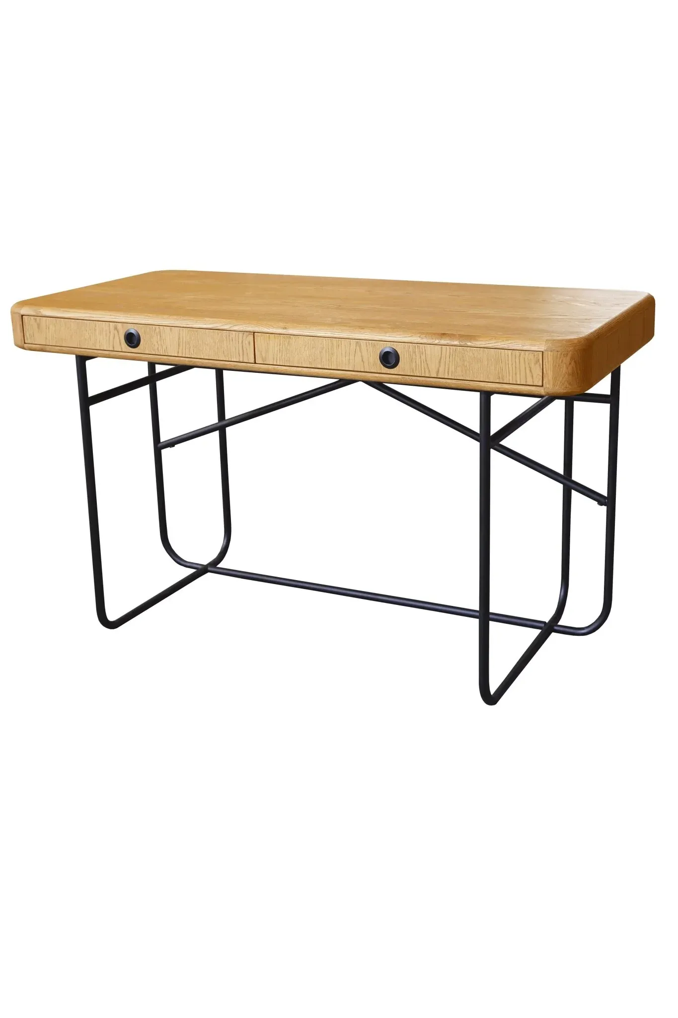 Mesa de despacho o escritorio fabricada en madera de roble antiguo y natural con patas de hierro de color negro.