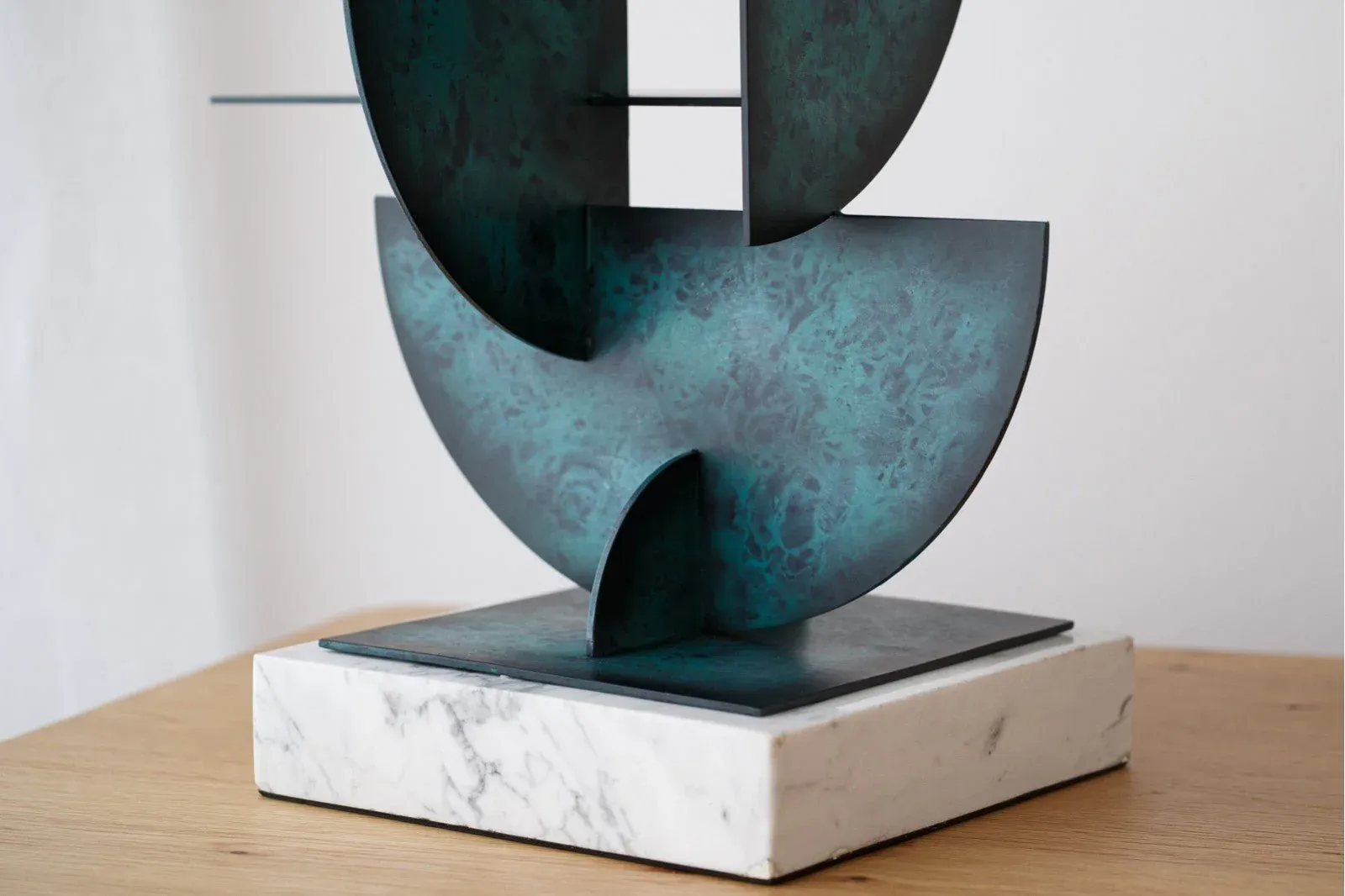 Escultura abstracta realizada en metal y mármol, el cuerpo metálico está formado por semicírculos que se cruzan entre sí de manera transversal mezclando tonos beige y ocres o azules y verdes que se han aplicado de manera irregular formando aguas sobre la superficie metálica, estos tonos combinan a la perfección con el mármol natural travertino en tono rojizo utilizado para la base de la escultura, al tratarse de piedras naturales y acabados artesanales puede haber variación de unas piezas a otras.