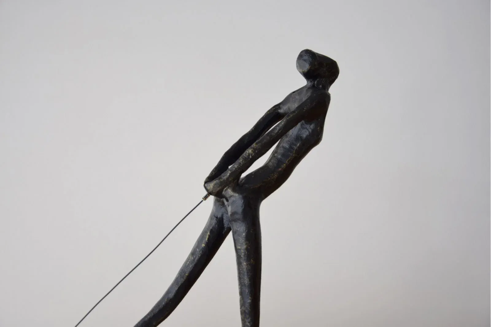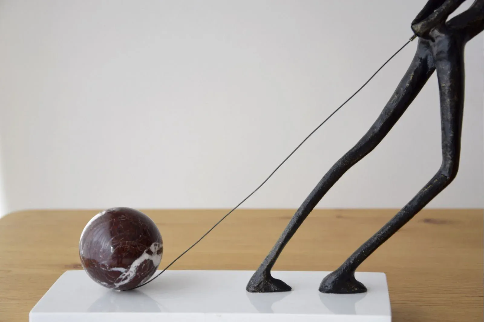 Escultura realizada en metal acabado en bronce envejecido sobre una base rectangular de mármol blanco y detalle de esfera en mármol rojo oscuro con vetas. Al tratarse de piedras naturales y acabados artesanales puede haber variaciones de unas piezas a otras.