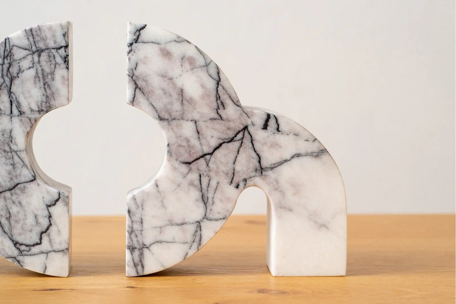 Escultura realizada en mármol de tonalidad blanca con vetas en grises, formada por dos piezas independientes y simétricas, esta escultura se convierte en una sola pieza decorativa en la que destacan sus líneas curvas y semicírculos.