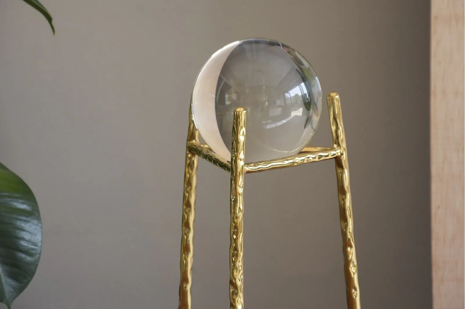 Escultura de bola de cristal con base realizada en acero acabado oro.