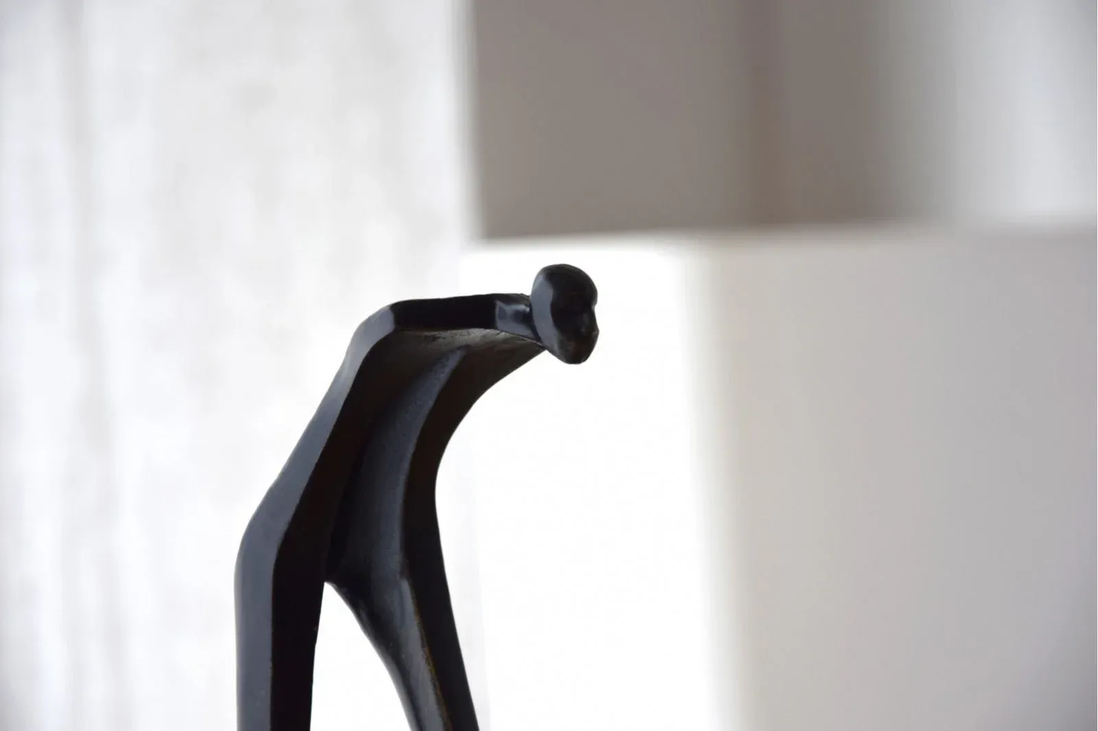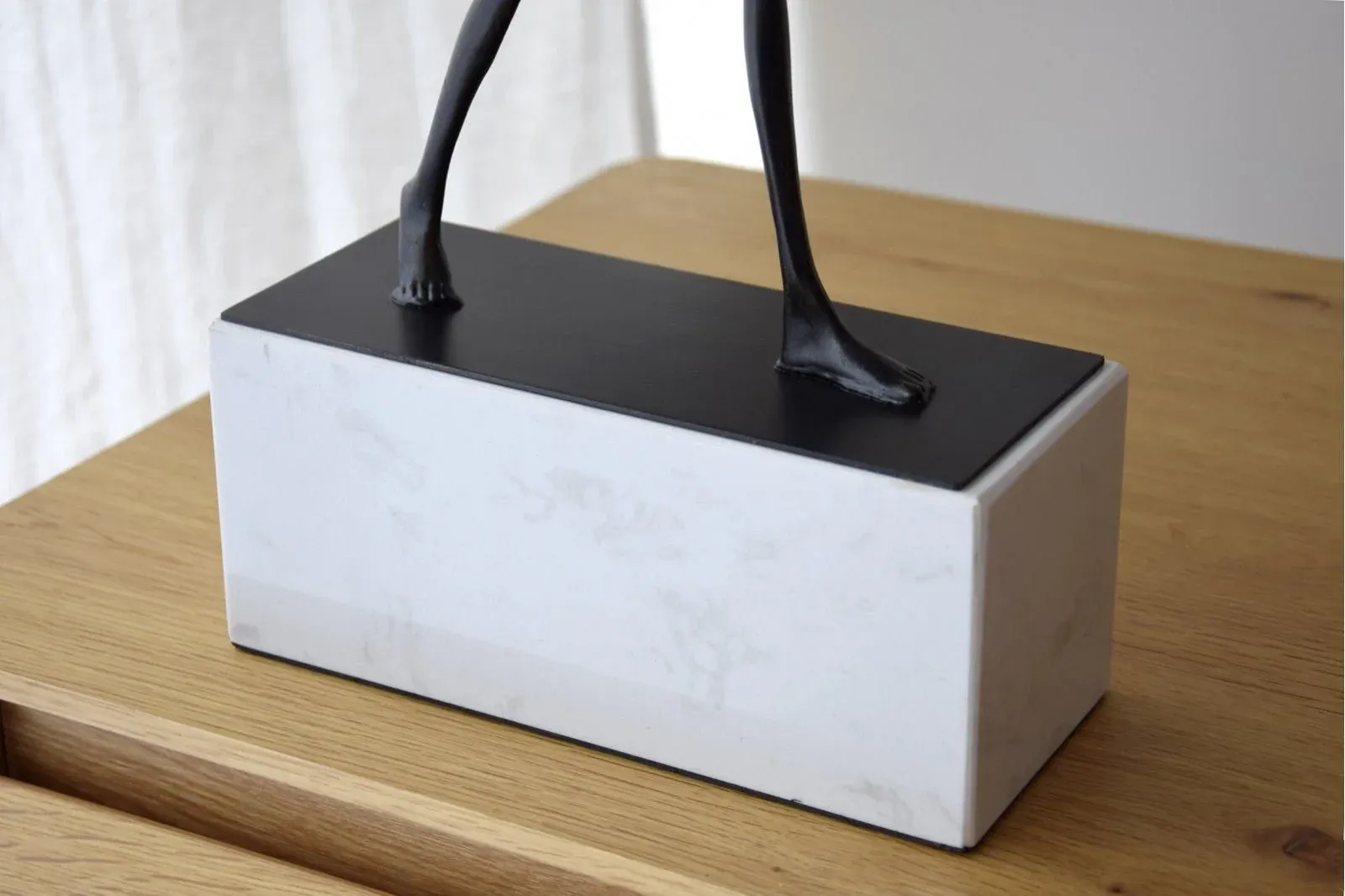 Escultura de figura humana caminante sobre un prisma rectangular de mármol blanco con vetas en gris, al tratarse de piezas naturales y con acabados artesanales puede haber variaciones de unas piezas a otras.