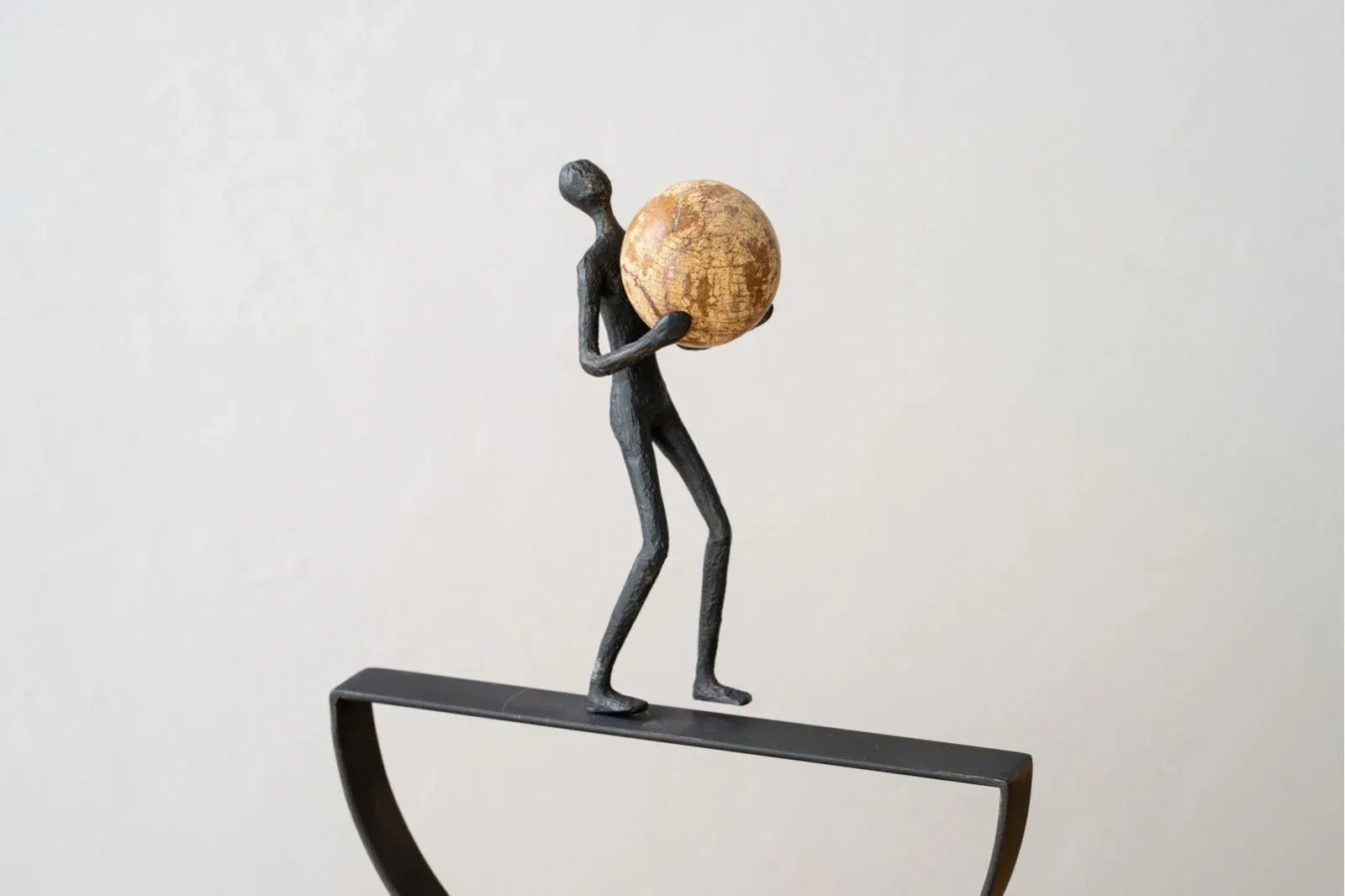 Escultura realizada en metal acabado bronce envejecido sobre base cúbica de mármol, representa una figura humana en equilibrio sobre semicircunferencia todo en metal y sosteniendo una bola de mármol.