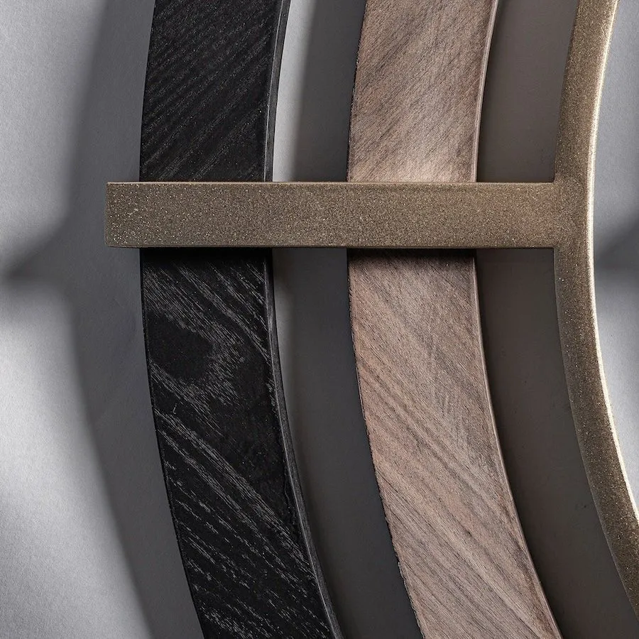 Espejo de estilo art deco, fabricado en madera dm en color negro, combinado con hierro en color oro y espejo.