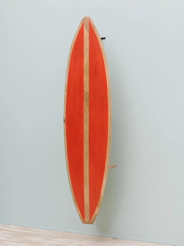 Preciosa estantería decorativa con motivo de una de tabla de surf en color rojo fabricada en madera de acacia con soporte trasero de hierro.