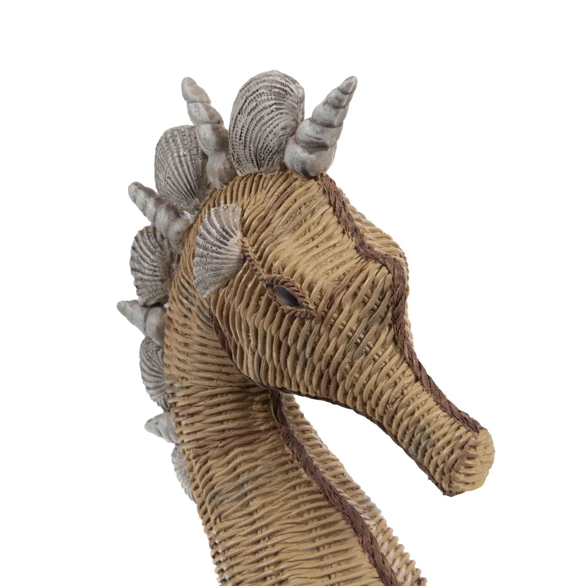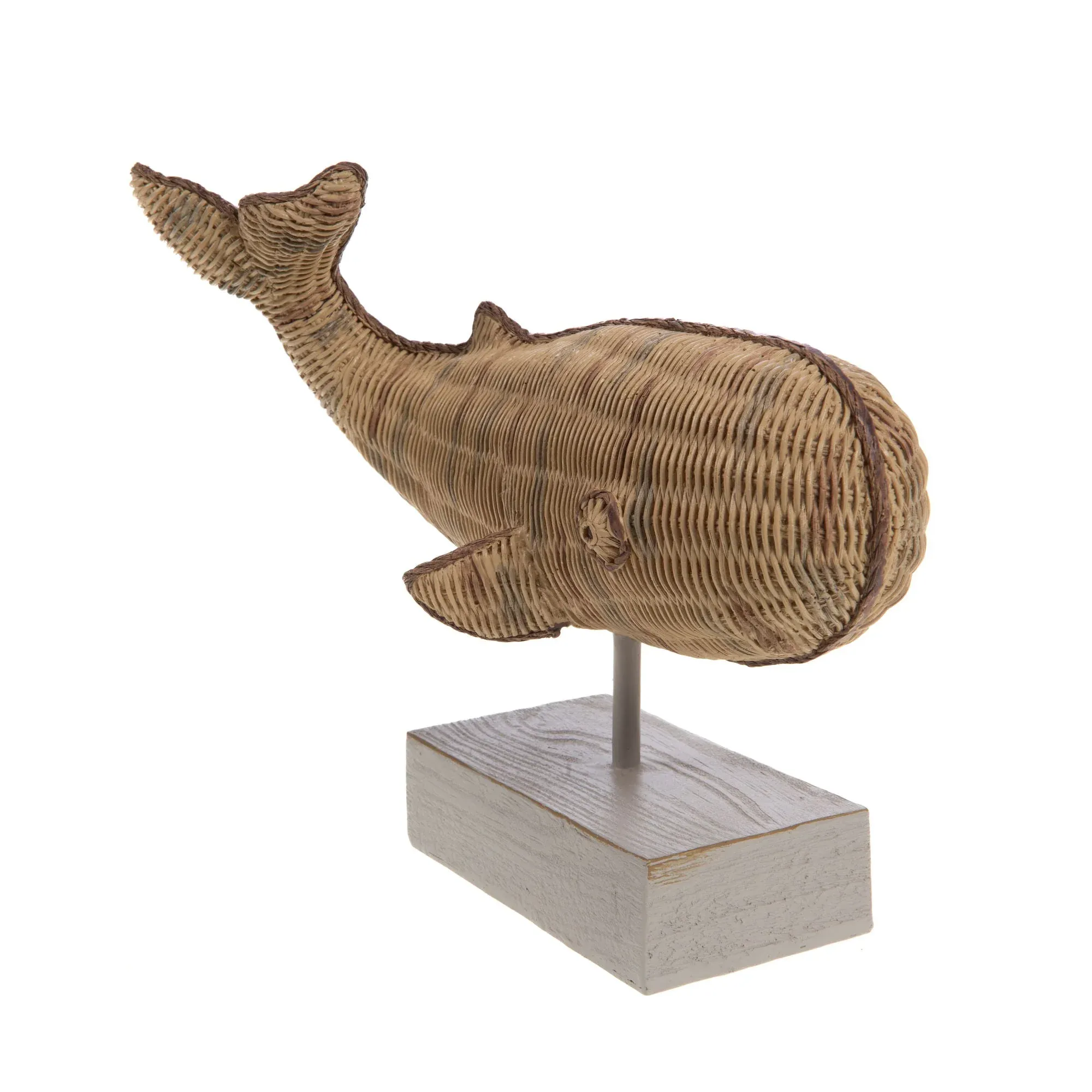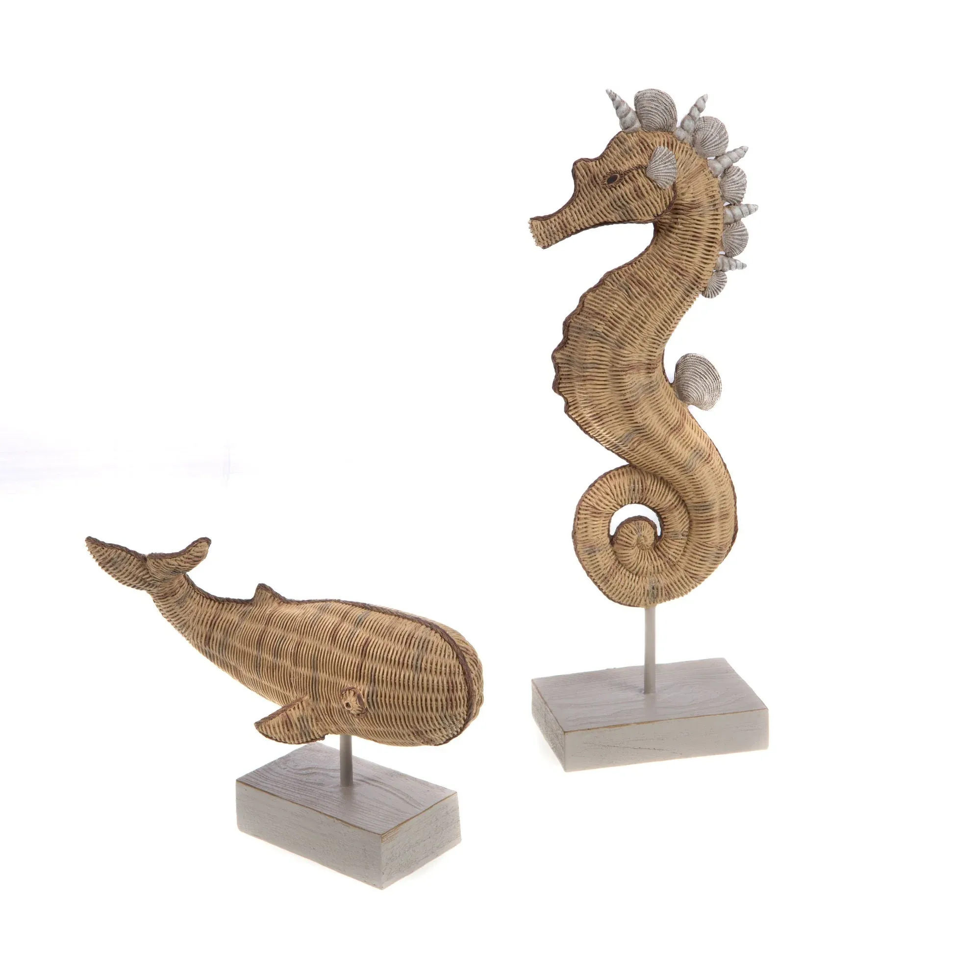 Preciosas figuras de decoración con forma de caballito de mar y ballena fabricadas en resina de color natural.