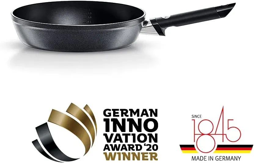 Estas sartenes están mejoradas con el mango Fissler Classic. Un mango cómodo y seguro que no se calienta y tiene esa forma para que no te quemes accidentalmente durante su uso. Debido al mango de plástico, la sartén no es apta para el horno. La sartén se puede meter en el lavavajillas, pero recomendamos lavarla a mano.