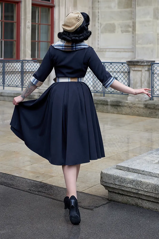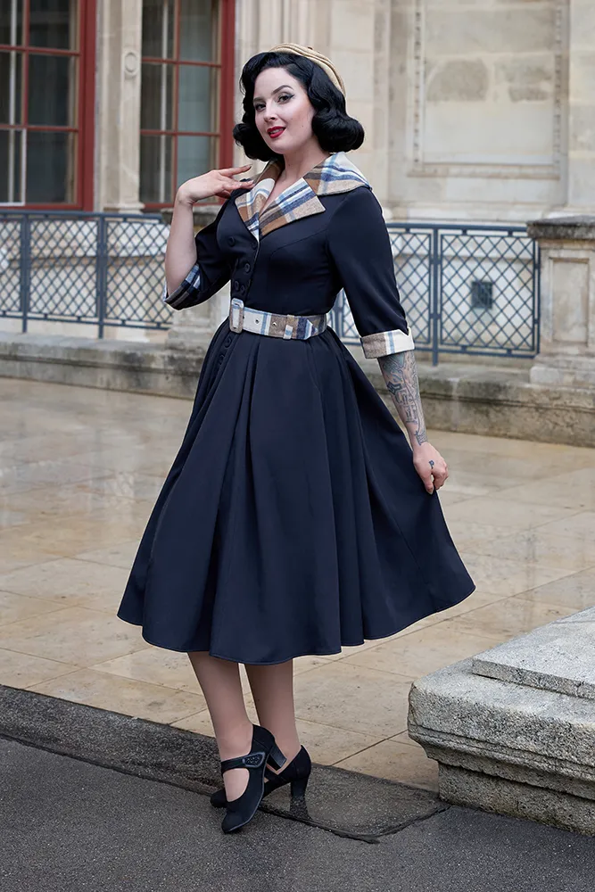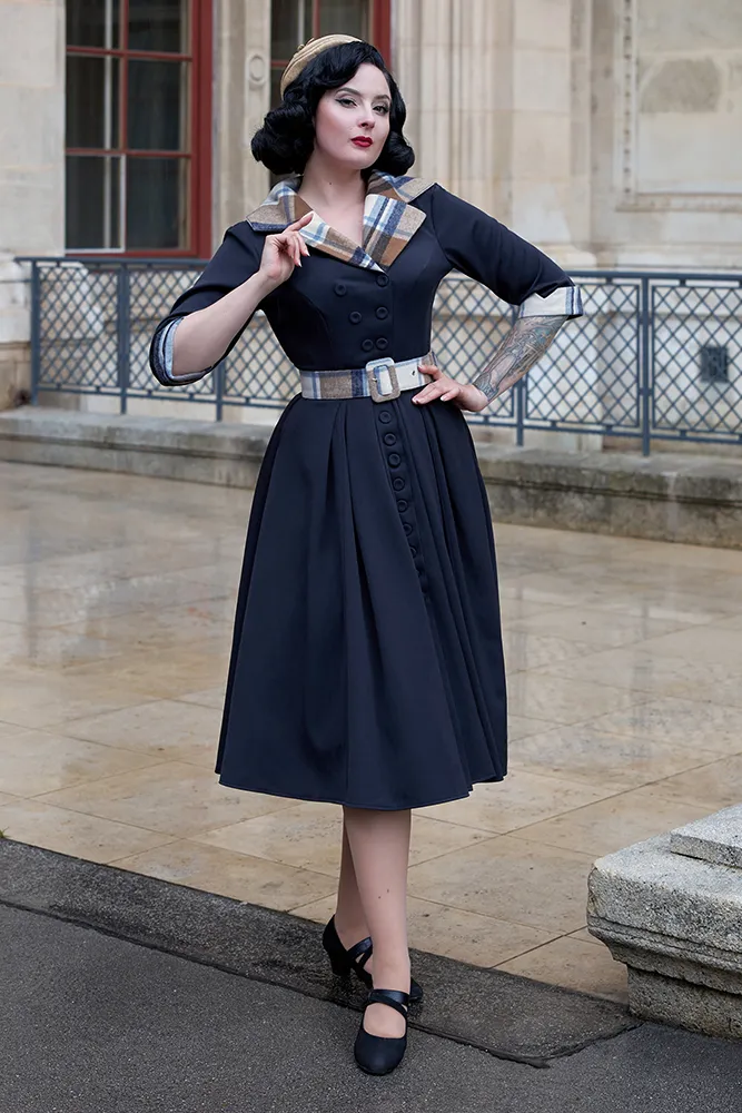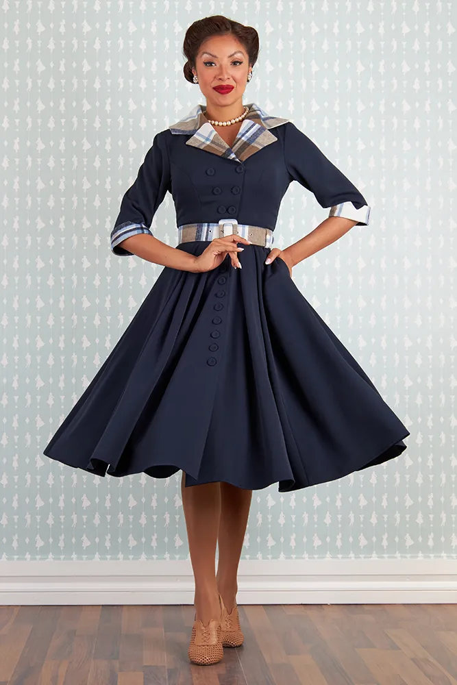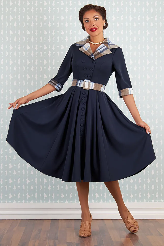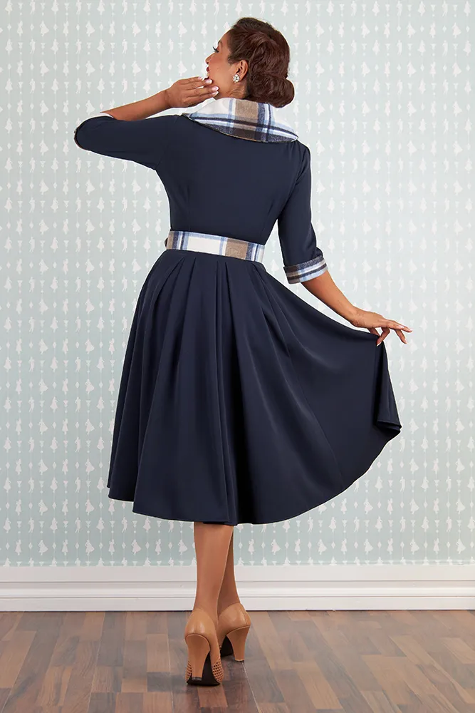 Vestido de vuelo en color azul con cuadros en el escote. A juego con el cinturón y las mangas 3/4