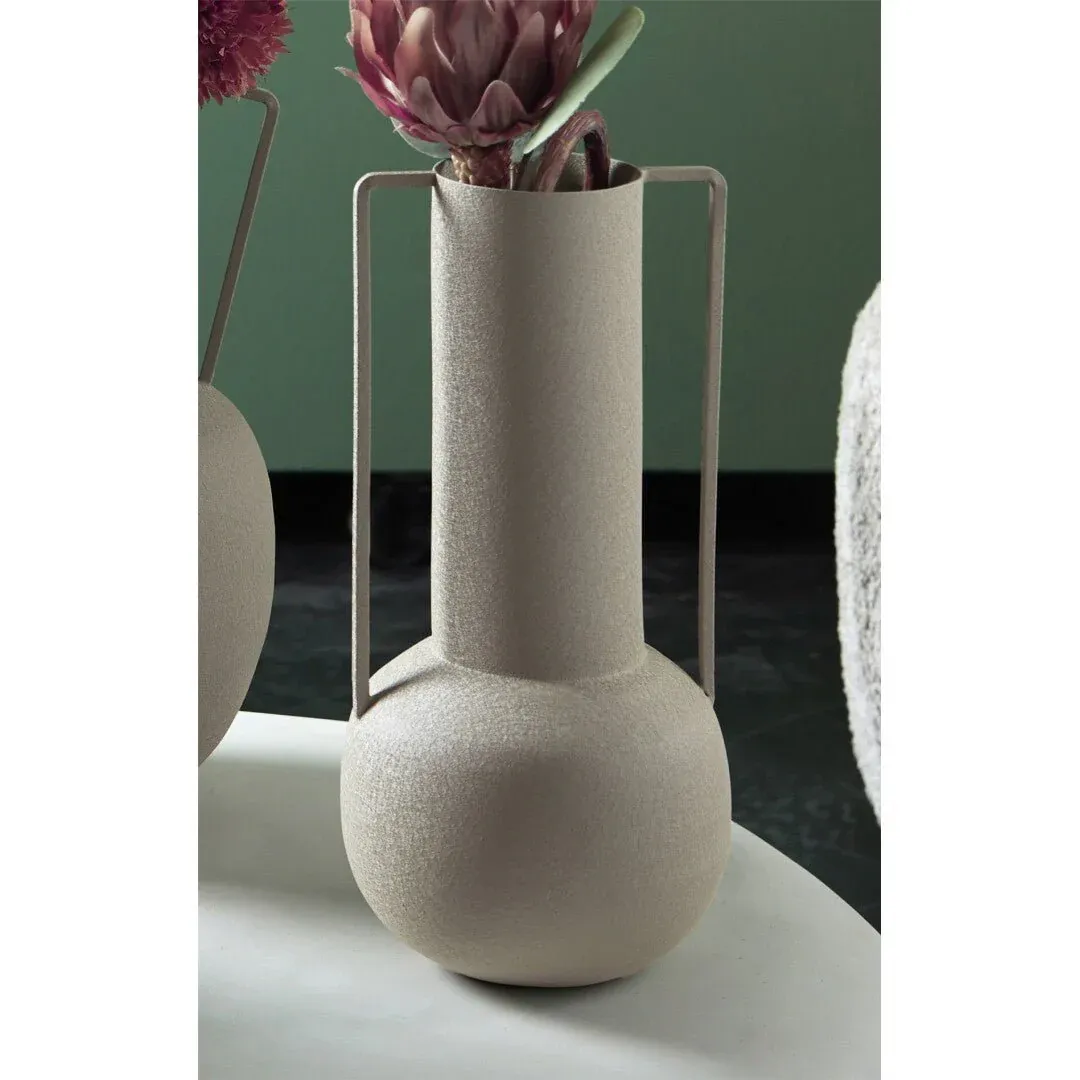 Precioso jarrón de cuello largo con 2 asas fabricado en metal color topo.