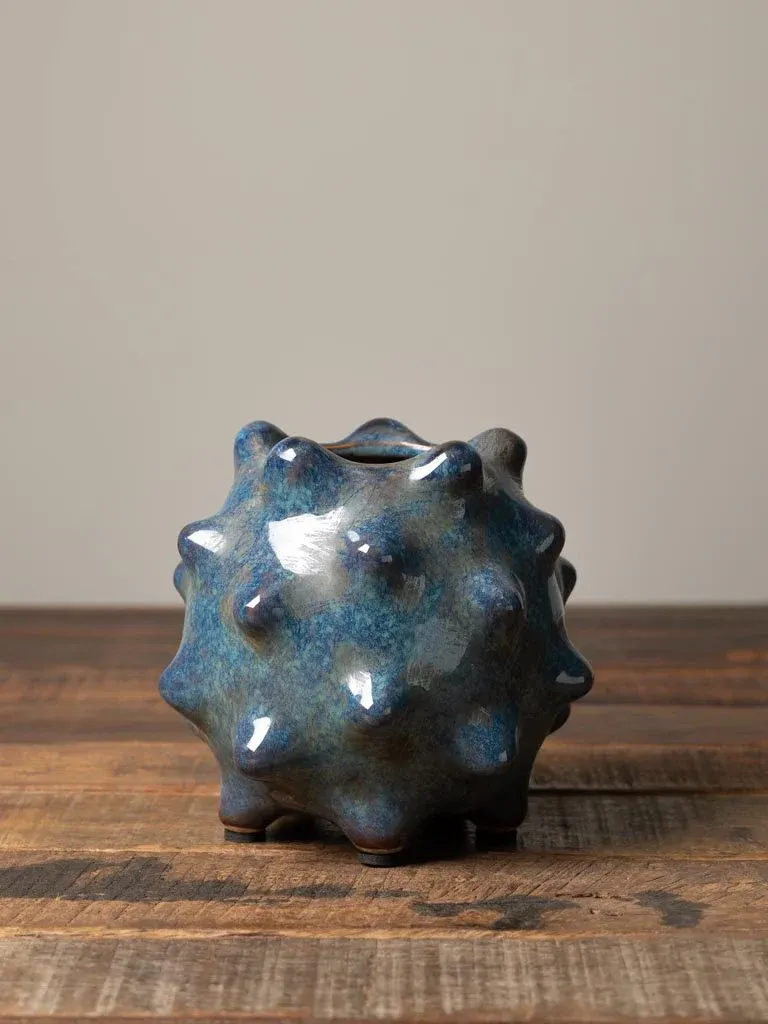 Precioso jarrón de tamaño pequeño fabricado en cerámica de colores azul y mostaza de forma puntiaguda.