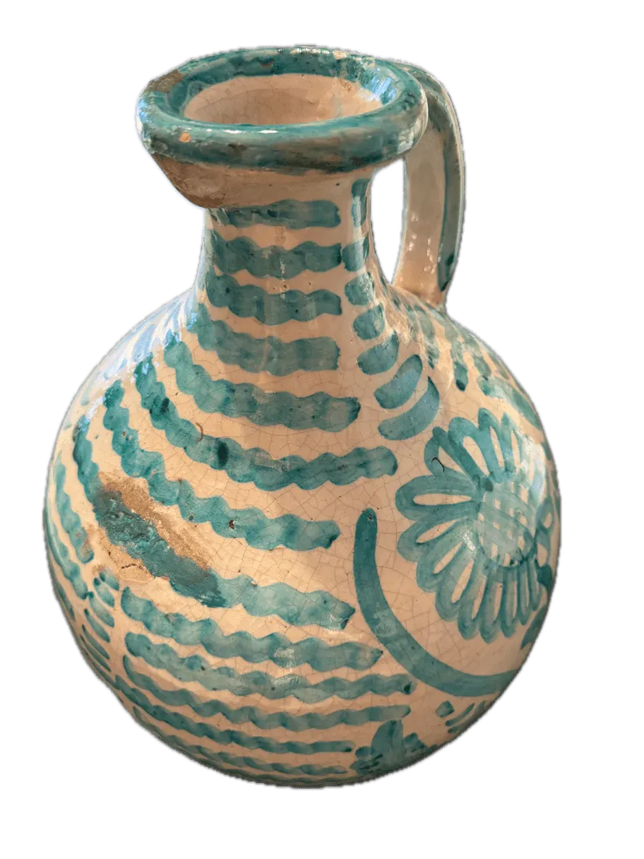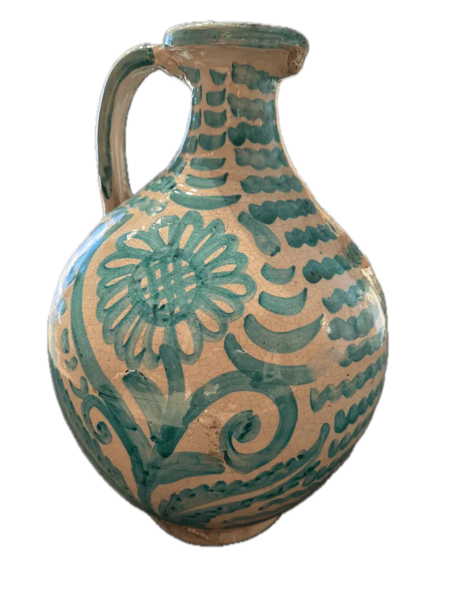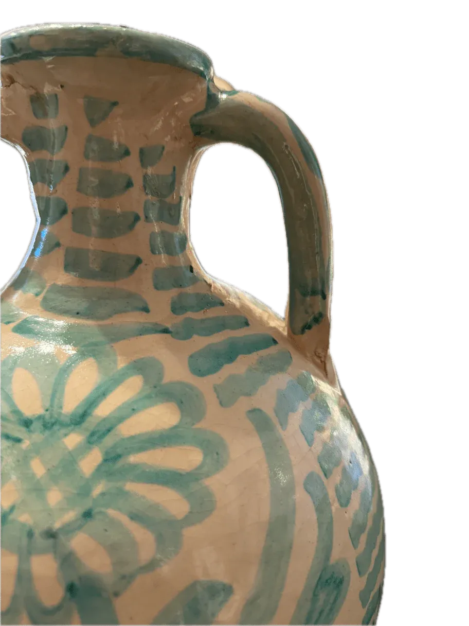 Maravilloso jarrón con un asa fabricado en cerámica de Fajalauza en color verde agua. Debido a su fabricación artesanal es posible variaciones en el color, en el tamaño y en la forma que lo hace una pieza única y con encanto.