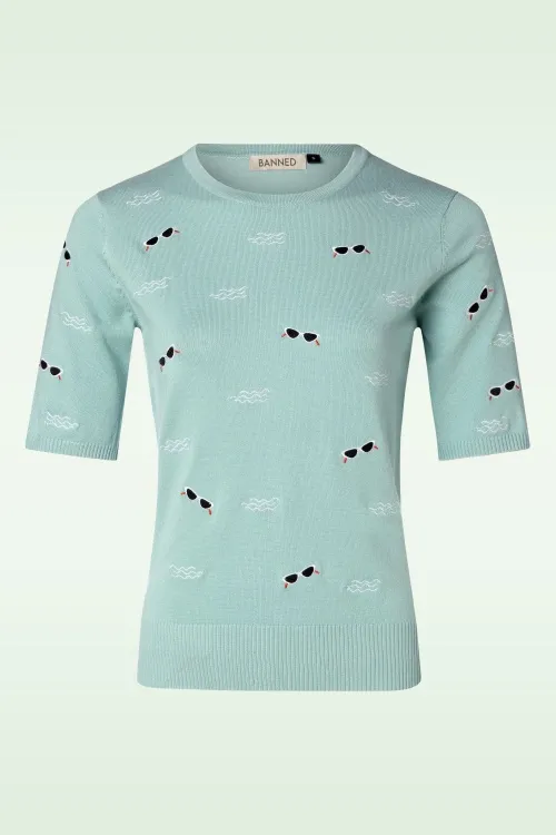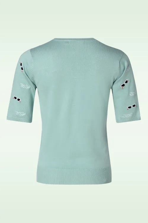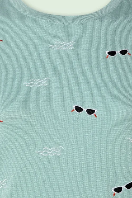 Jumper Sunnies & Sea, es de color azul clarito con bordados de gafas vintage. Muy suave.