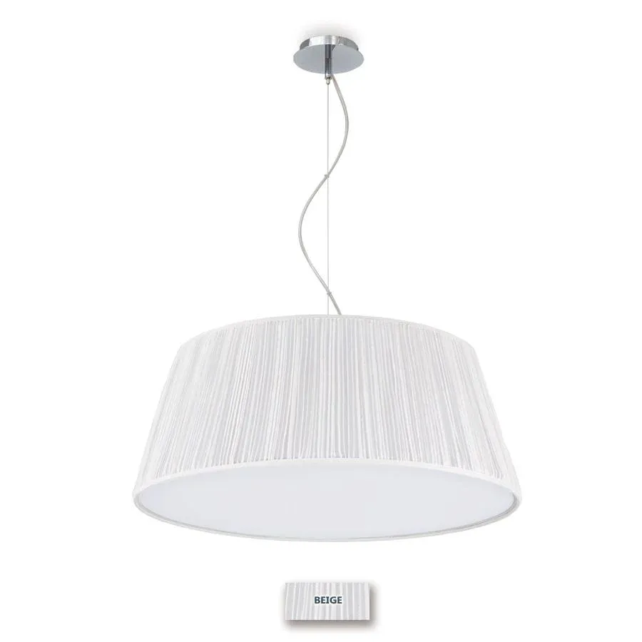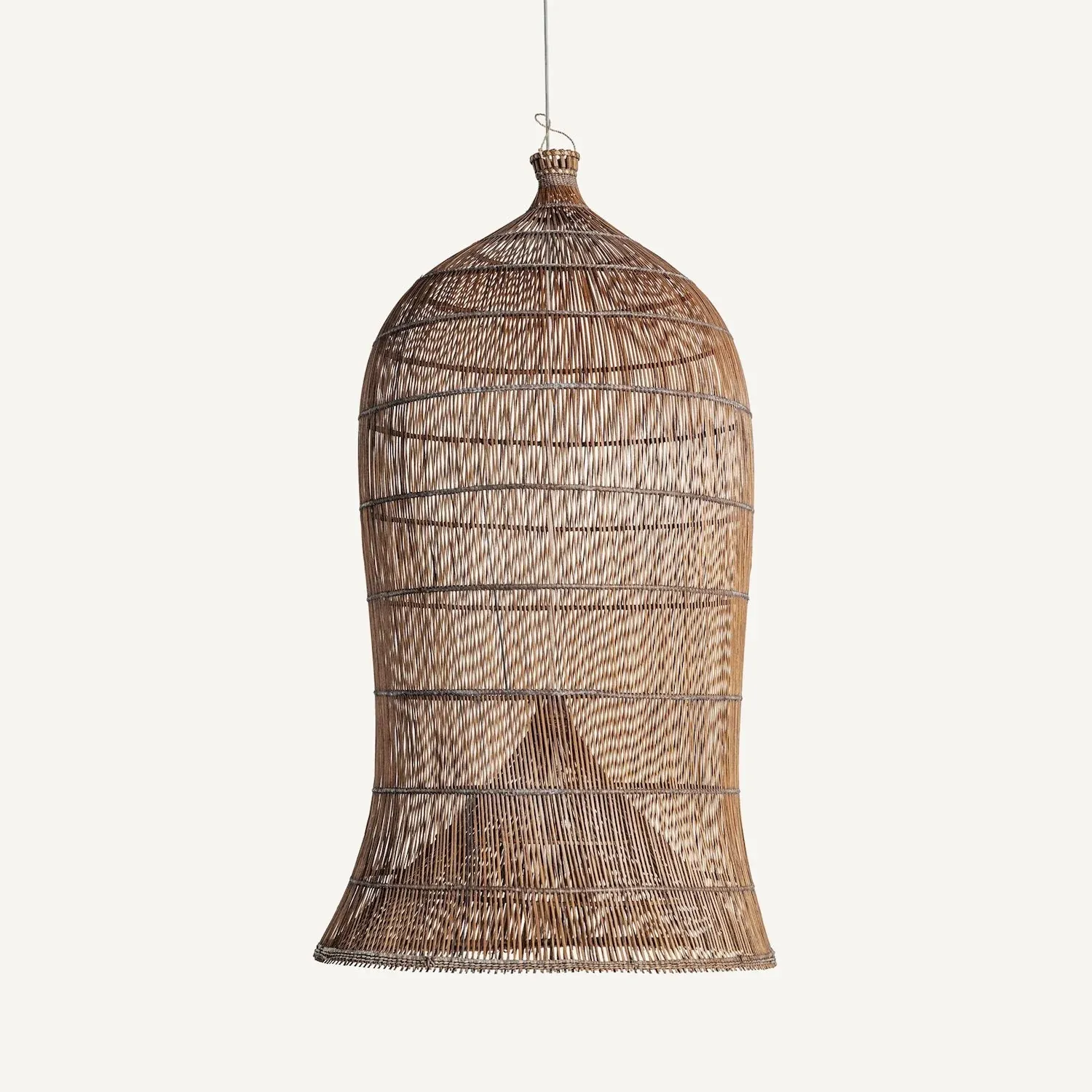 Lámpara de techo diábolo con material de imitación a madera y rejilla beige con detalles en color negro.