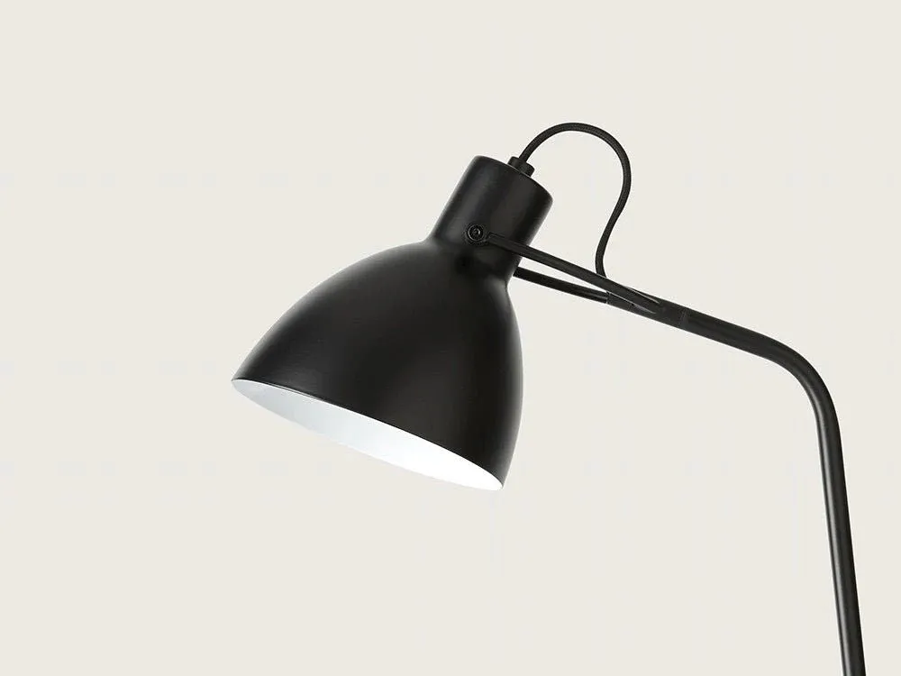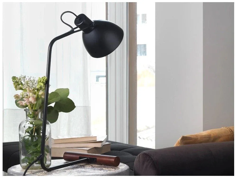 Lámpara de sobremesa de diseño fabricada en acero de color negro mate y base con madera de nogal. Se trata de un diseño minimalista al tener una estructura de metal muy estilizada.