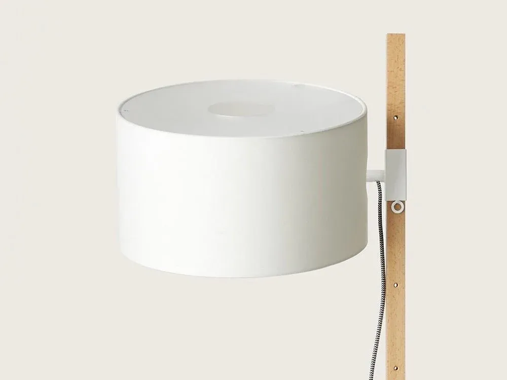 Lámpara de suelo de diseño moderno con estructura de madera de haya y base de acero disponible en blanco. La pantalla se desplaza por el soporte de madera pudiendo orientar la luz.