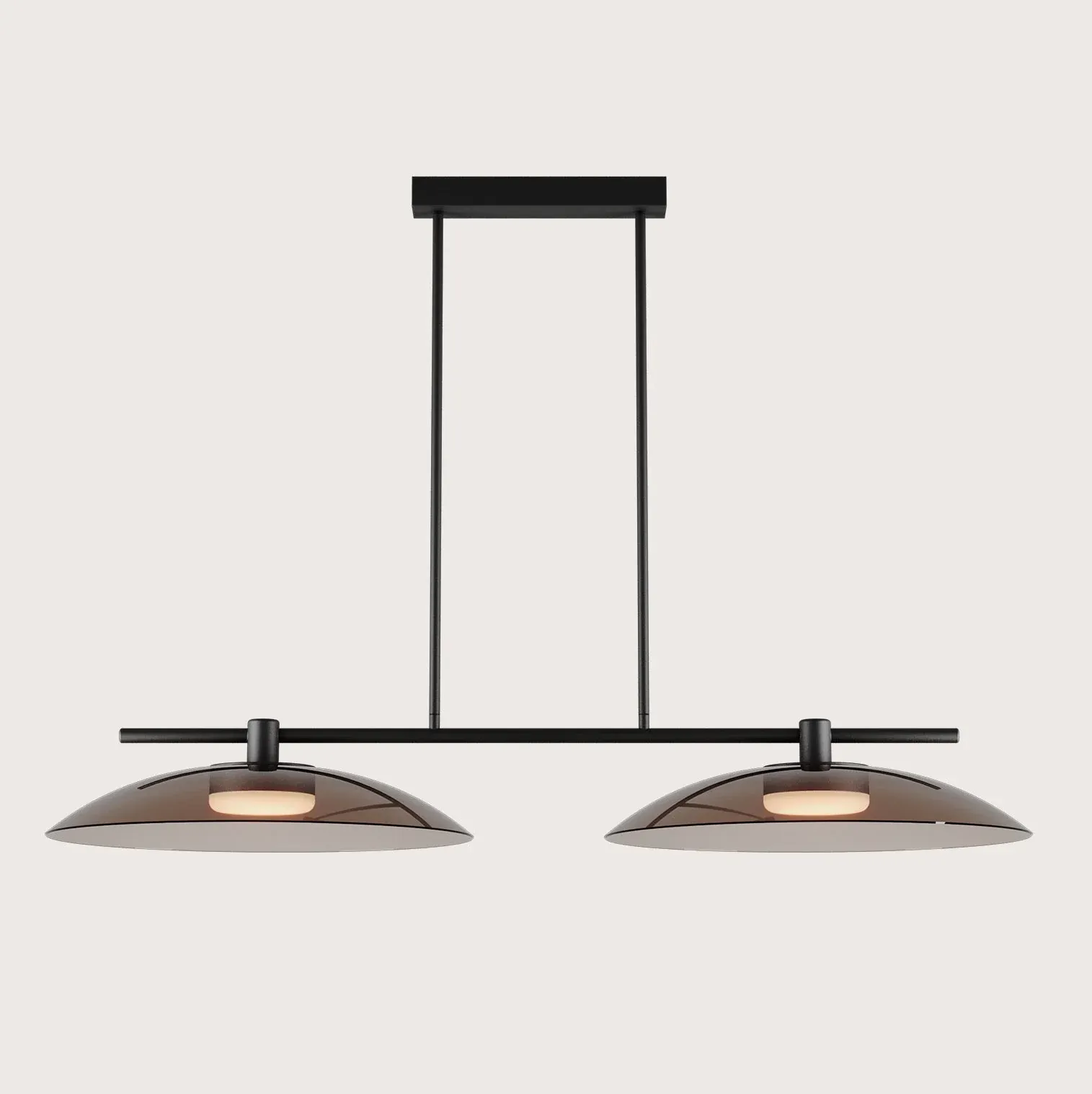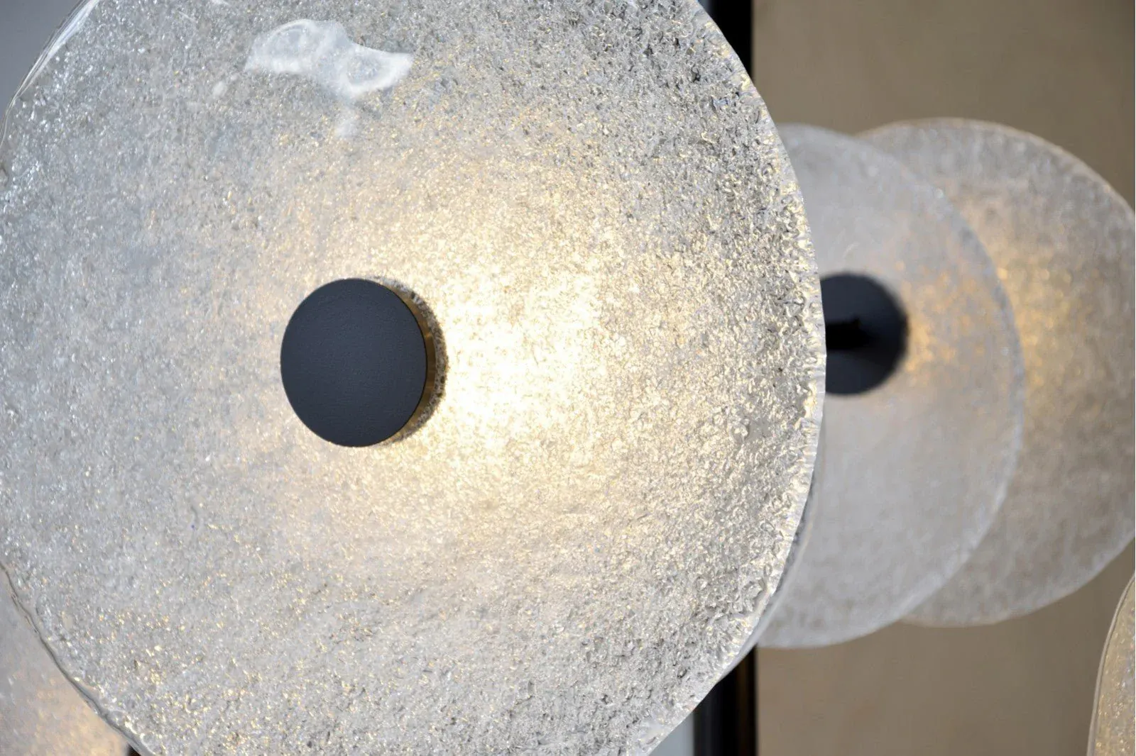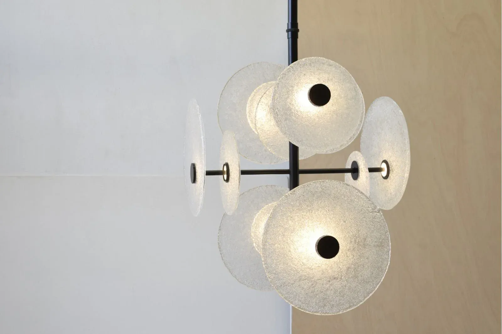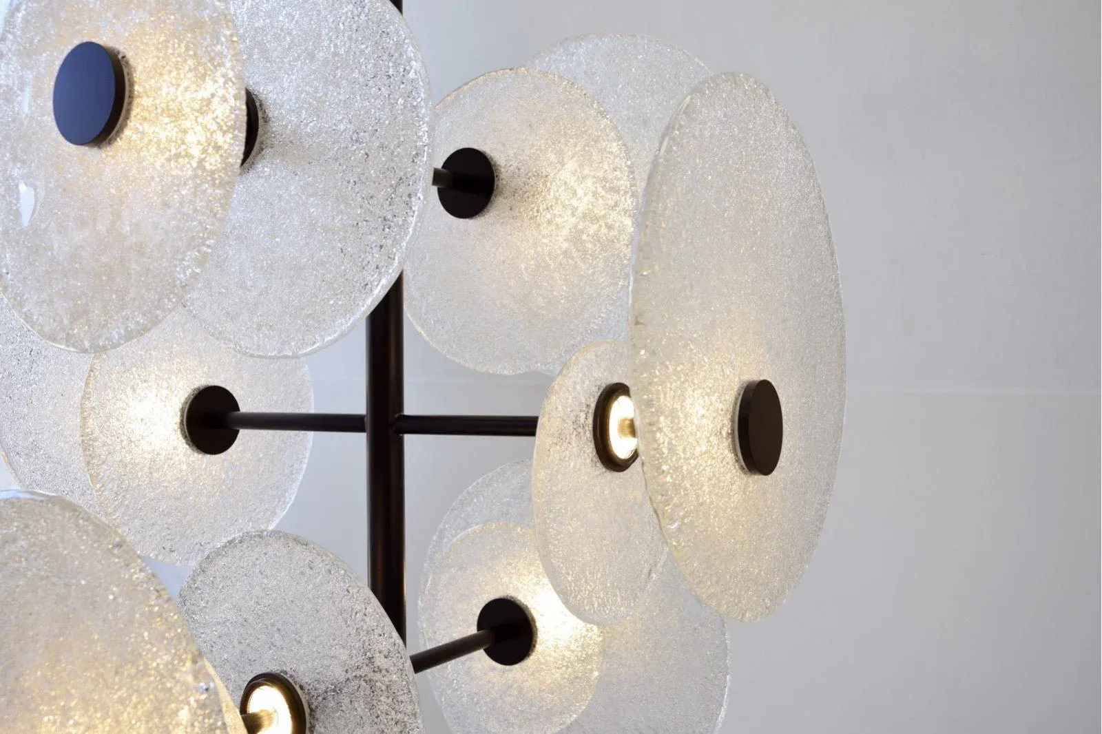 Magnífica lámpara de techo con estructura en varillas de metal color negro mate con piezas circulares en vidrio blanco de diferentes diámetros.