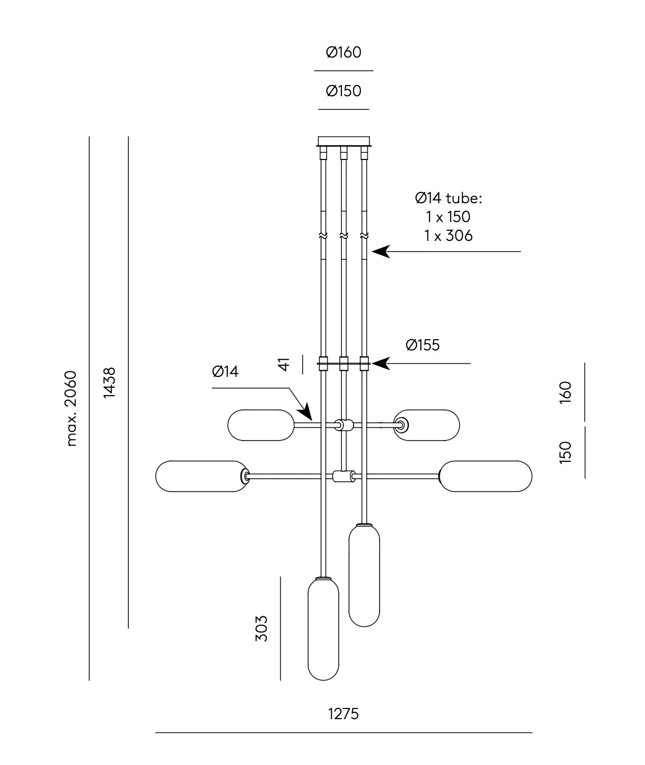 Las tulipas de cristal opal están situadas en diferentes posiciones y alturas, creando una original lámpara de techo de estilo retro vintage.