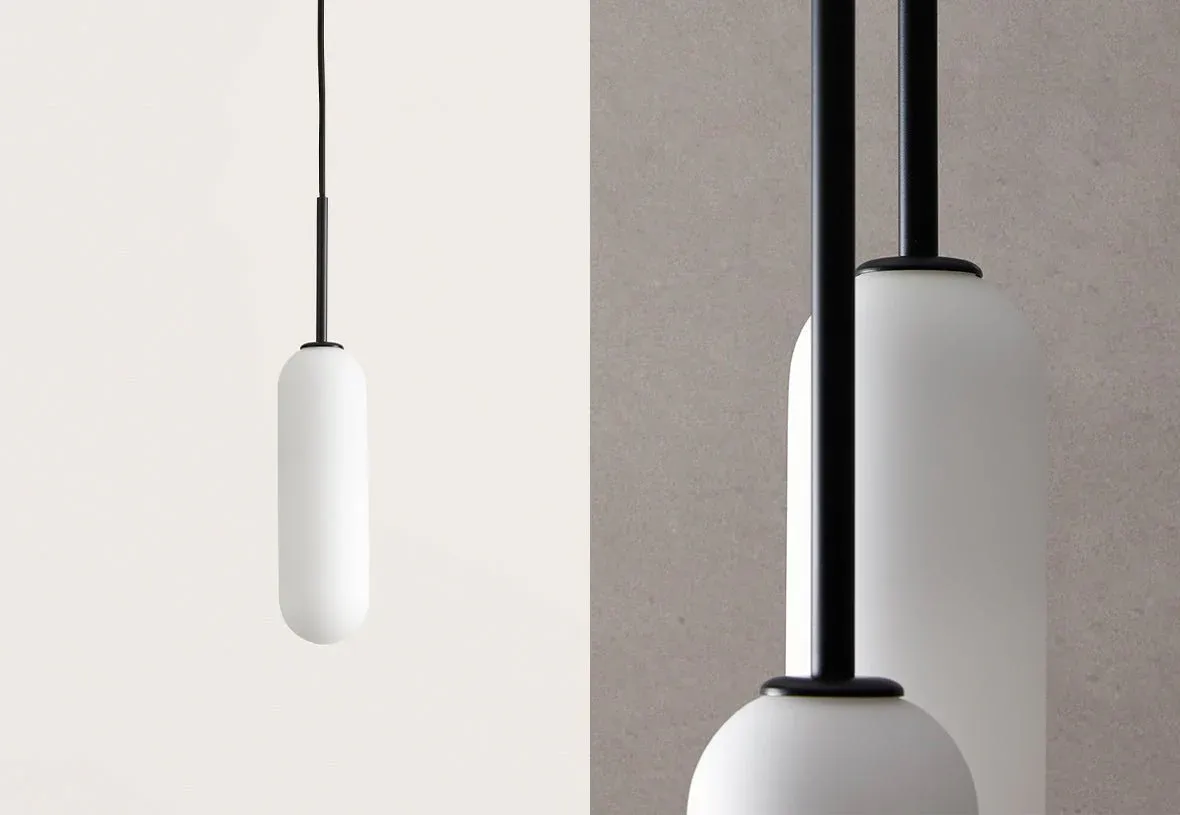 Lámpara de techo de diseño fabricada en estructura de acero de color negro mate u oro mate y la tulipa de vidrio opal.