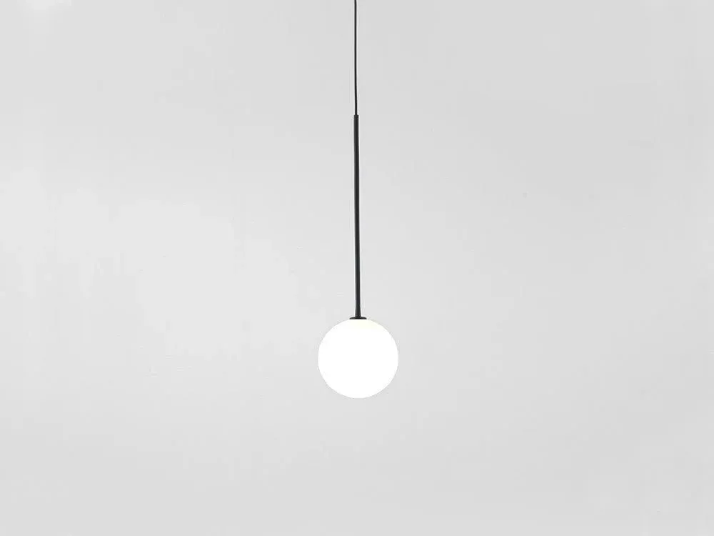 Lámpara de techo de diseño fabricada en acero y vidrio soplado. La estructura de metal puede ser en color negro o en color oro mate. Por su parte la tulipa esférica está realizada en cristal opal.