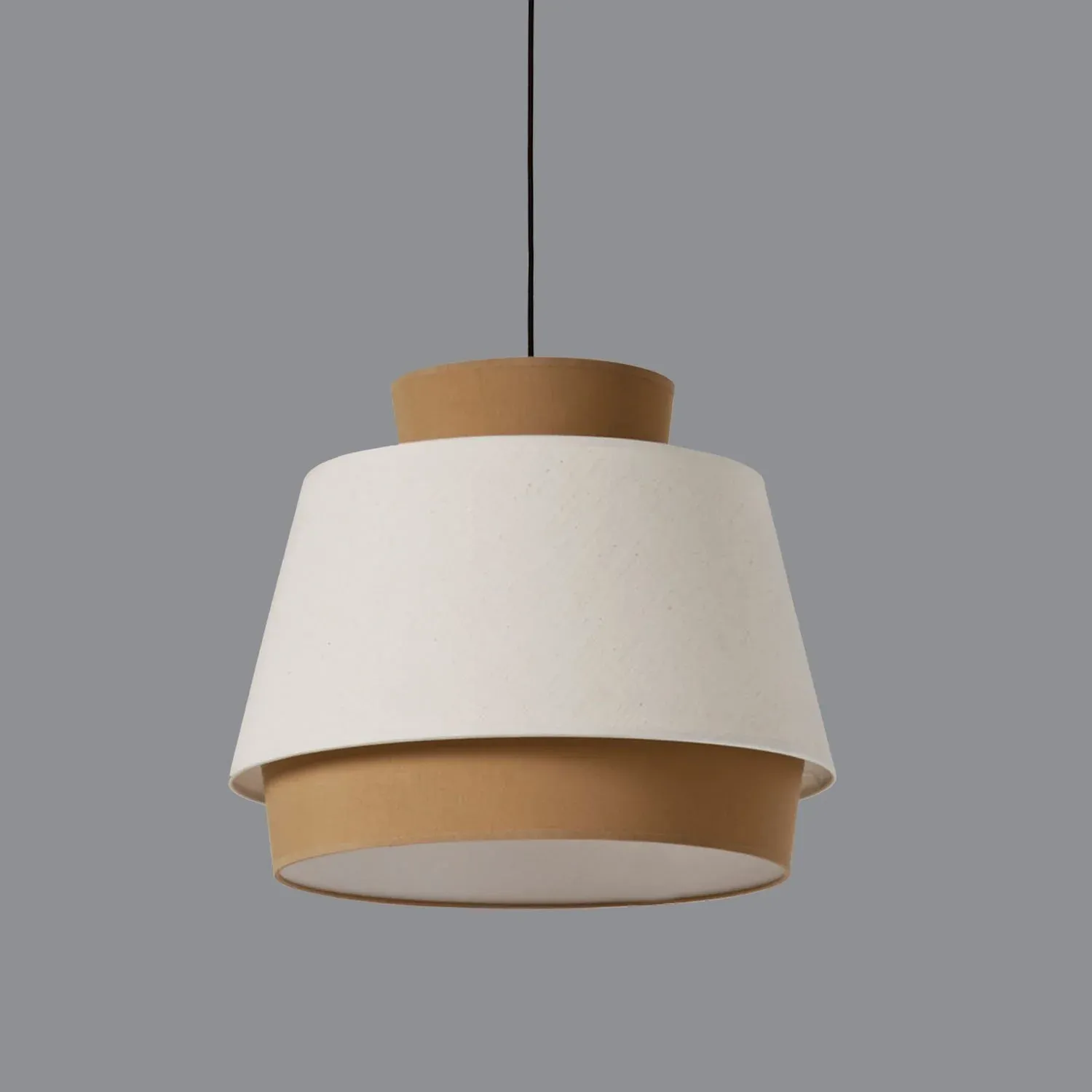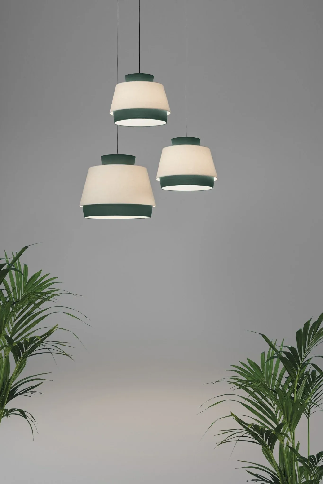Lámpara de techo fabricada en lino y algodón disponible en tres colores: verde, arena y blanco. El cable es de textil y el florón que va al techo es de metal, ambos en color negro.