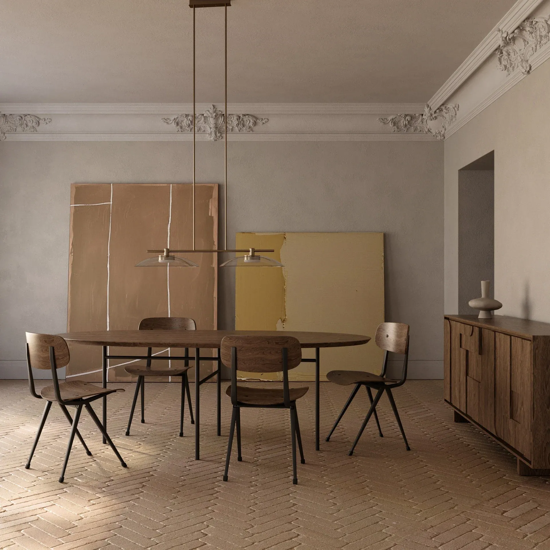 Preciosa lámpara colgante Betty estilo años 50 mid-century con posibilidad de acabado del metal en negro mate y oro envejecido. La tulipa también puede elegirse en varios acabados.