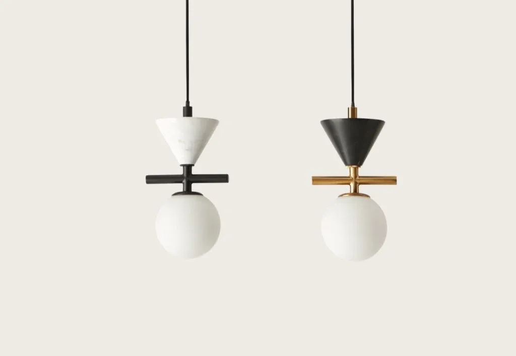 Lámpara de Techo Oneta fabricada en acero, mármol y vidrio. El vidrio es de color opal y los acabados son: