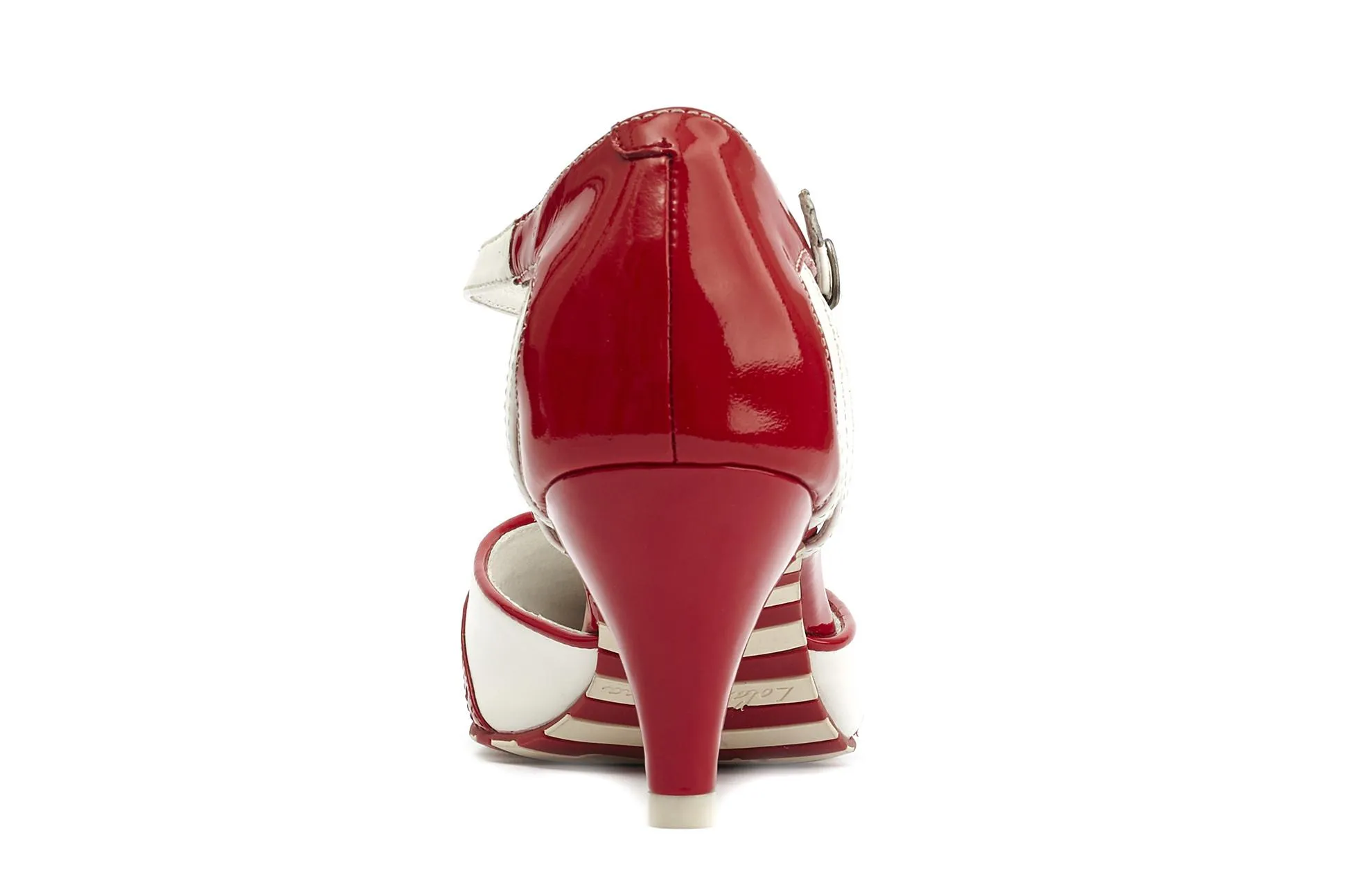 Zapato de tacon en charol blanco y rojo, con un tacon muy comodo. La suela es de goma que hace aun mas confortable la pisada. Altura del tacon: 6.5cm Material: Piel.