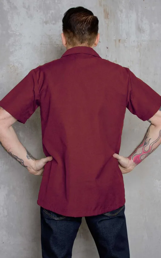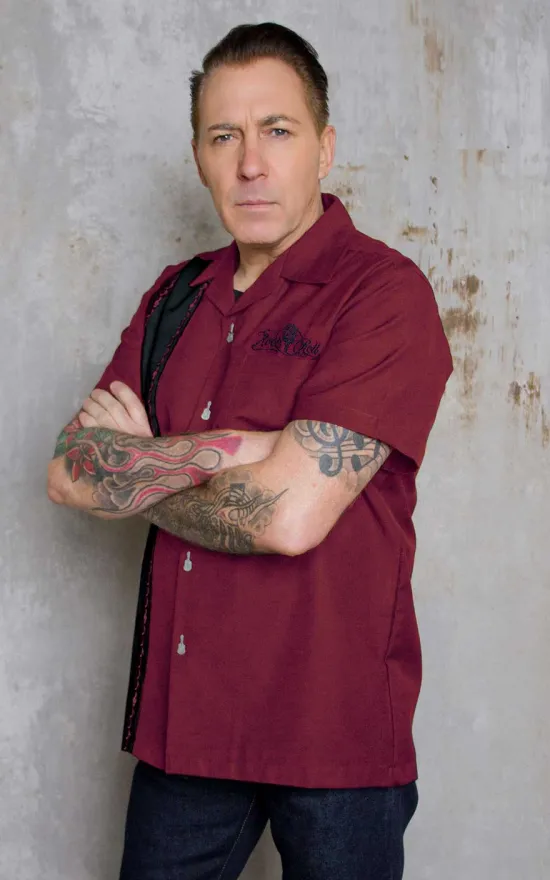 Inspiradas en las camisas informales pero no menos elegantes de los años 50, las camisas lounge Rumble59 quedan bien en cualquier situación. Este clásico convence por su combinación bicolor burdeos/negro. La parte delantera derecha está decorada con una franja negra en contraste, con costuras divisorias decoradas de arriba a abajo con sutiles bordados de notas y claves. Un bolsillo en la parte delantera izquierda está rematado con un pequeño bordado negro. Los botones con forma de guitarra son la guinda del pastel. Gracias a la fantástica combinación de colores y los detalles discretos, esta camisa vintage garantiza una frescura discreta y el look rockabilly perfecto. De este modo, se garantiza una apariencia elegante, ya sea solo en el bar o junto con el resto de la banda, vestidos con el mismo traje moderno de rock’n’roll.