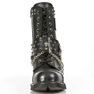 Botas de piel de vacuno en color negro con detalles metalicos. Suela de goma. Altura de la caña 21cm, del tacon 4cm y de la plataforma 2cm.