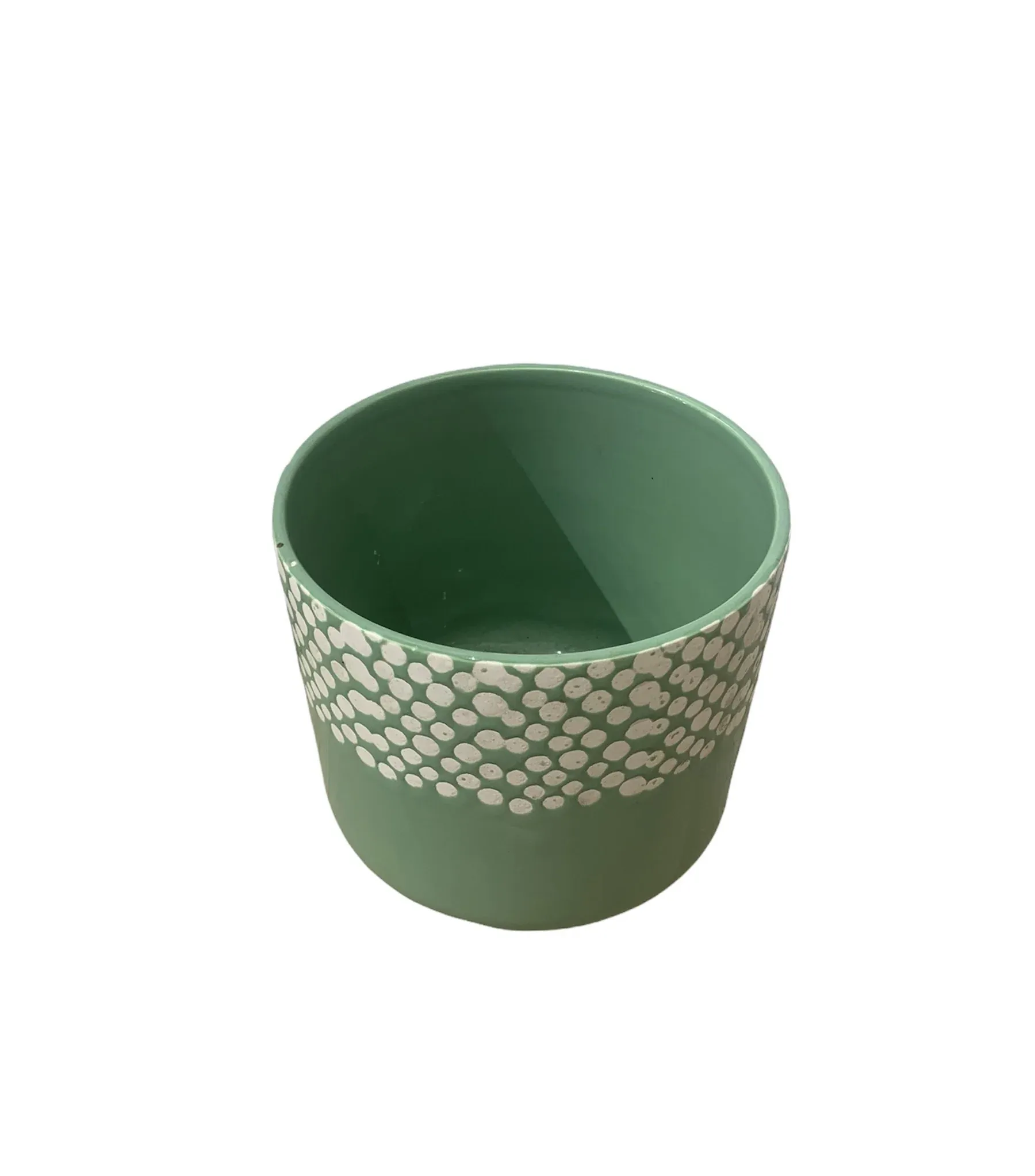 Maceta fabricada en cerámica de color verde con pequeños detalles blancos en la parte superior.